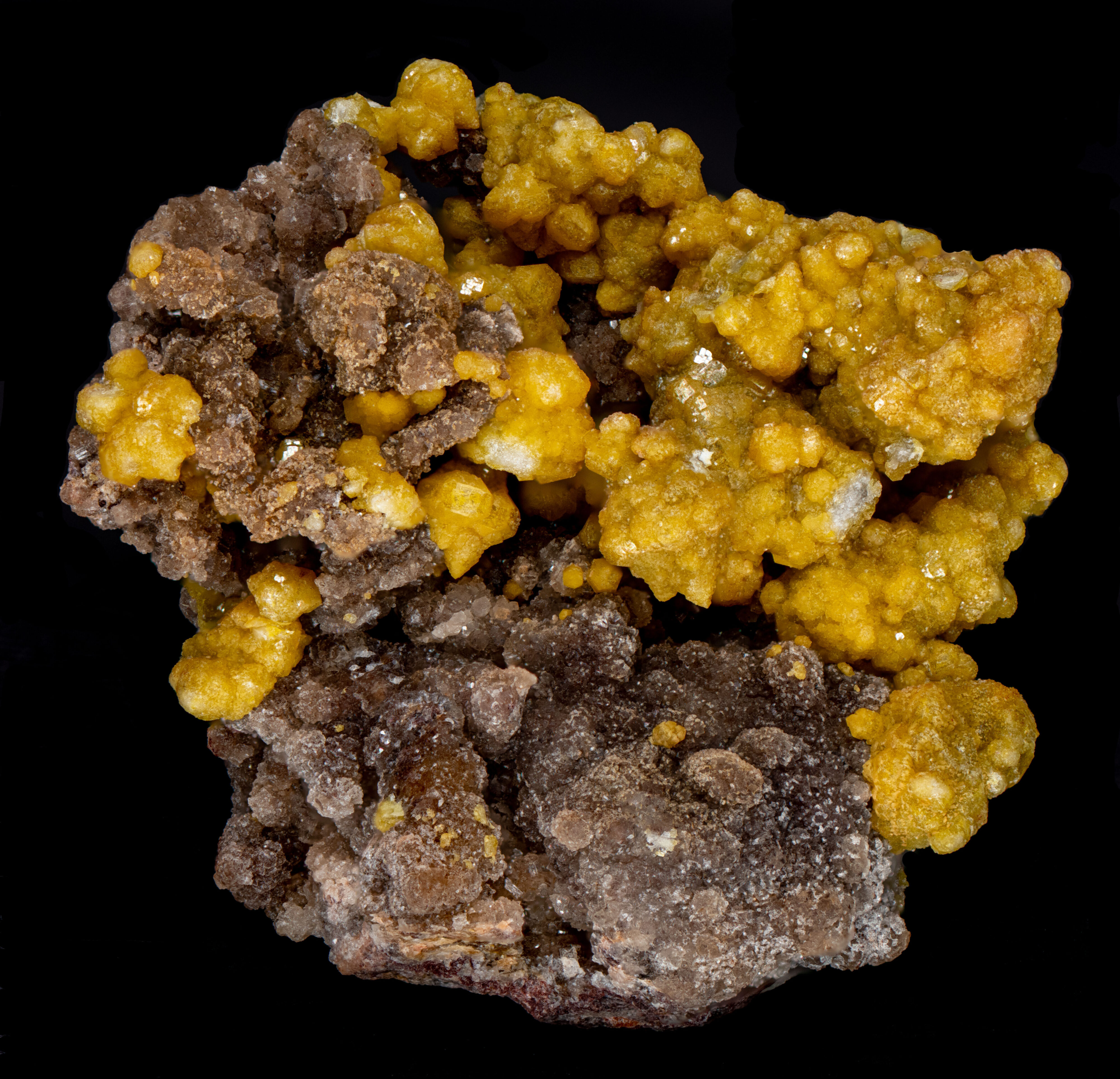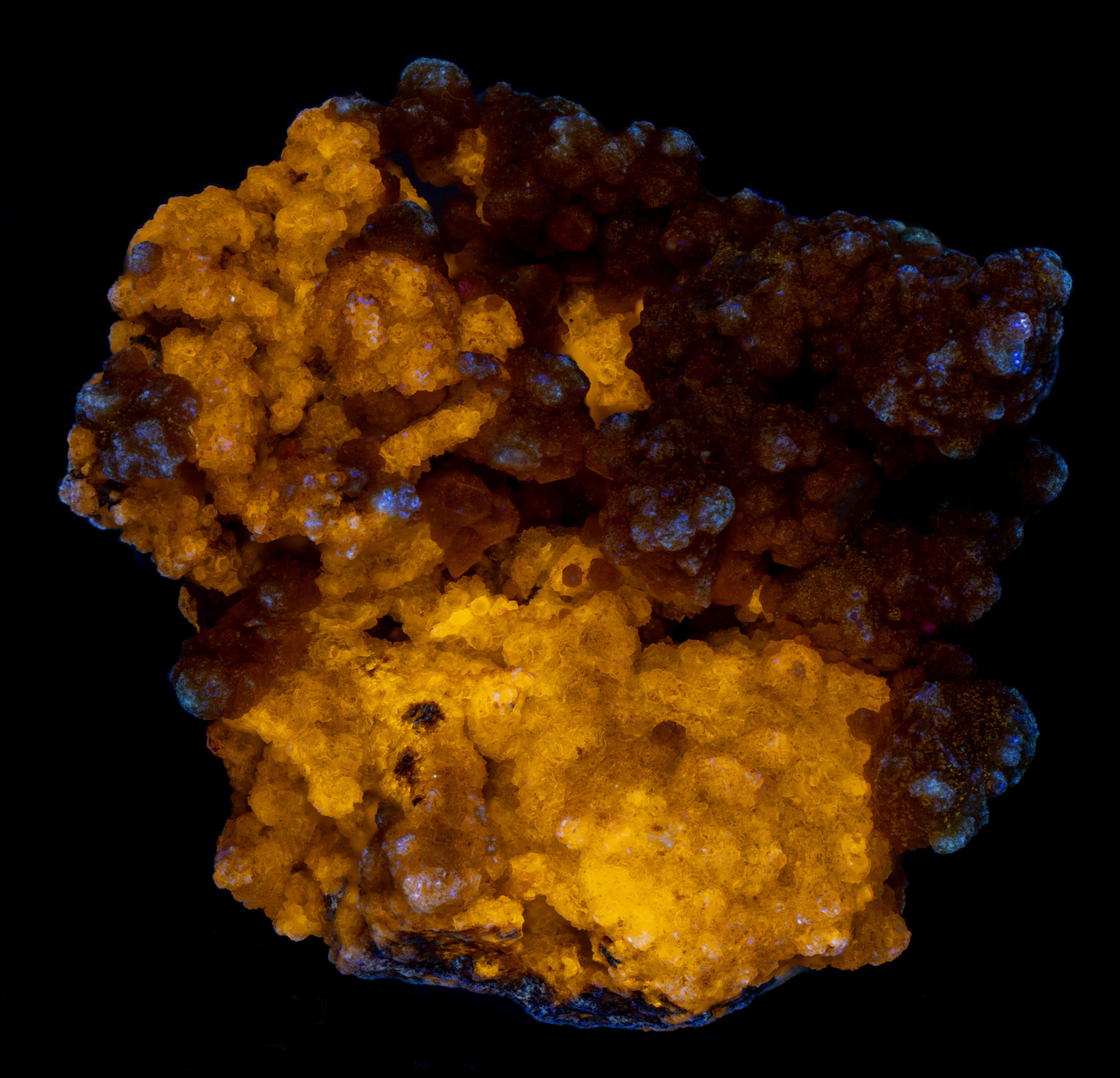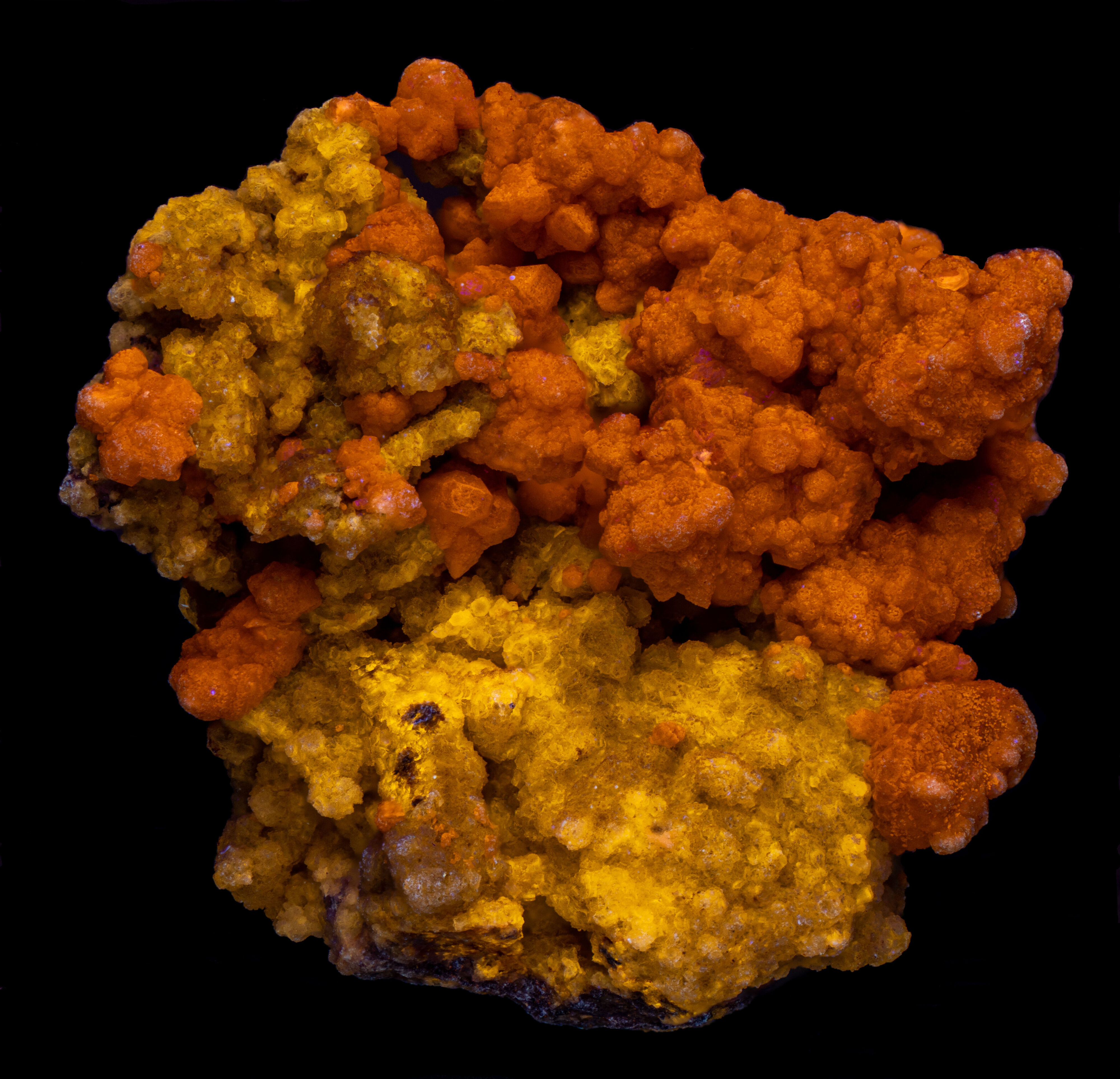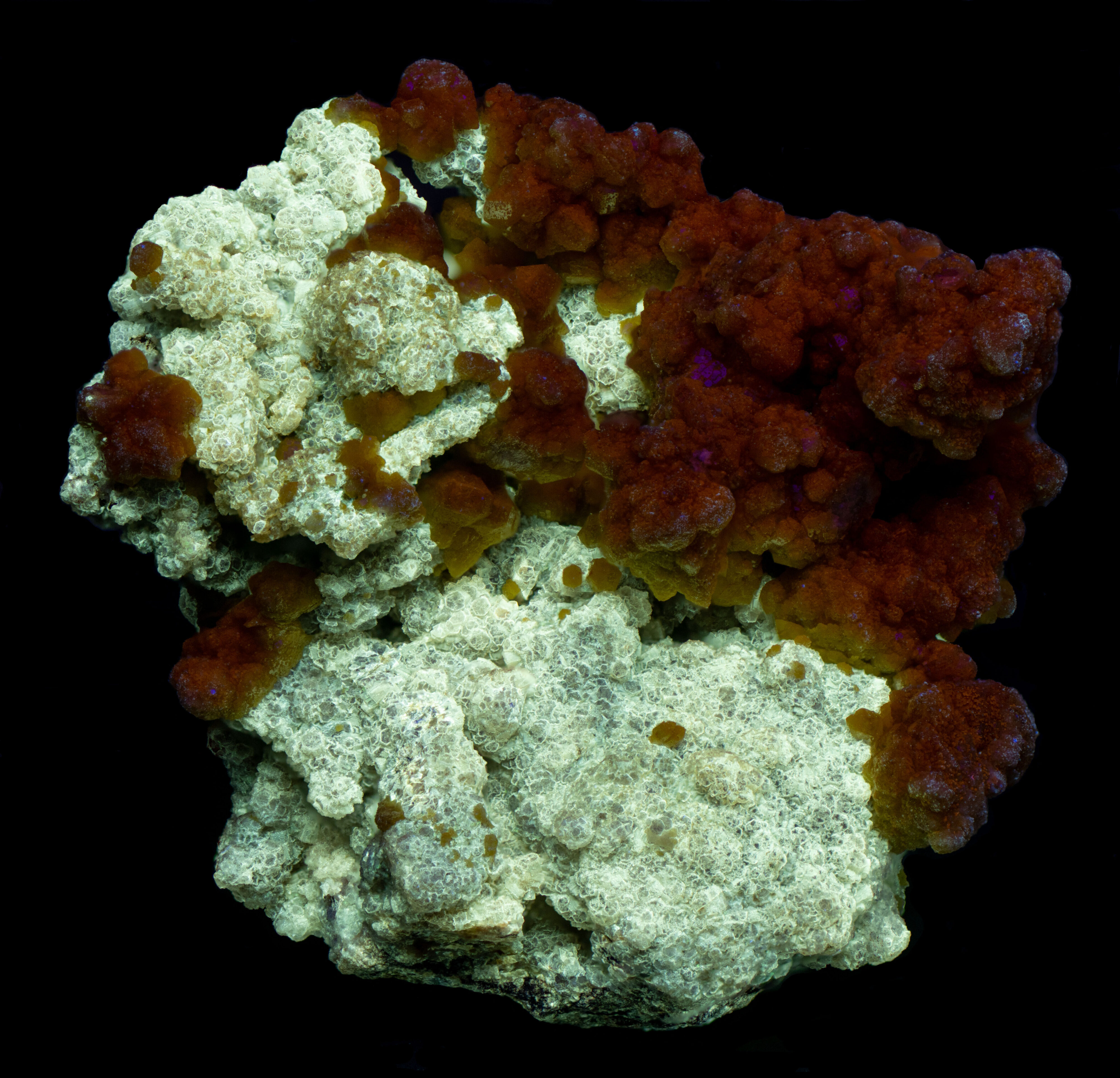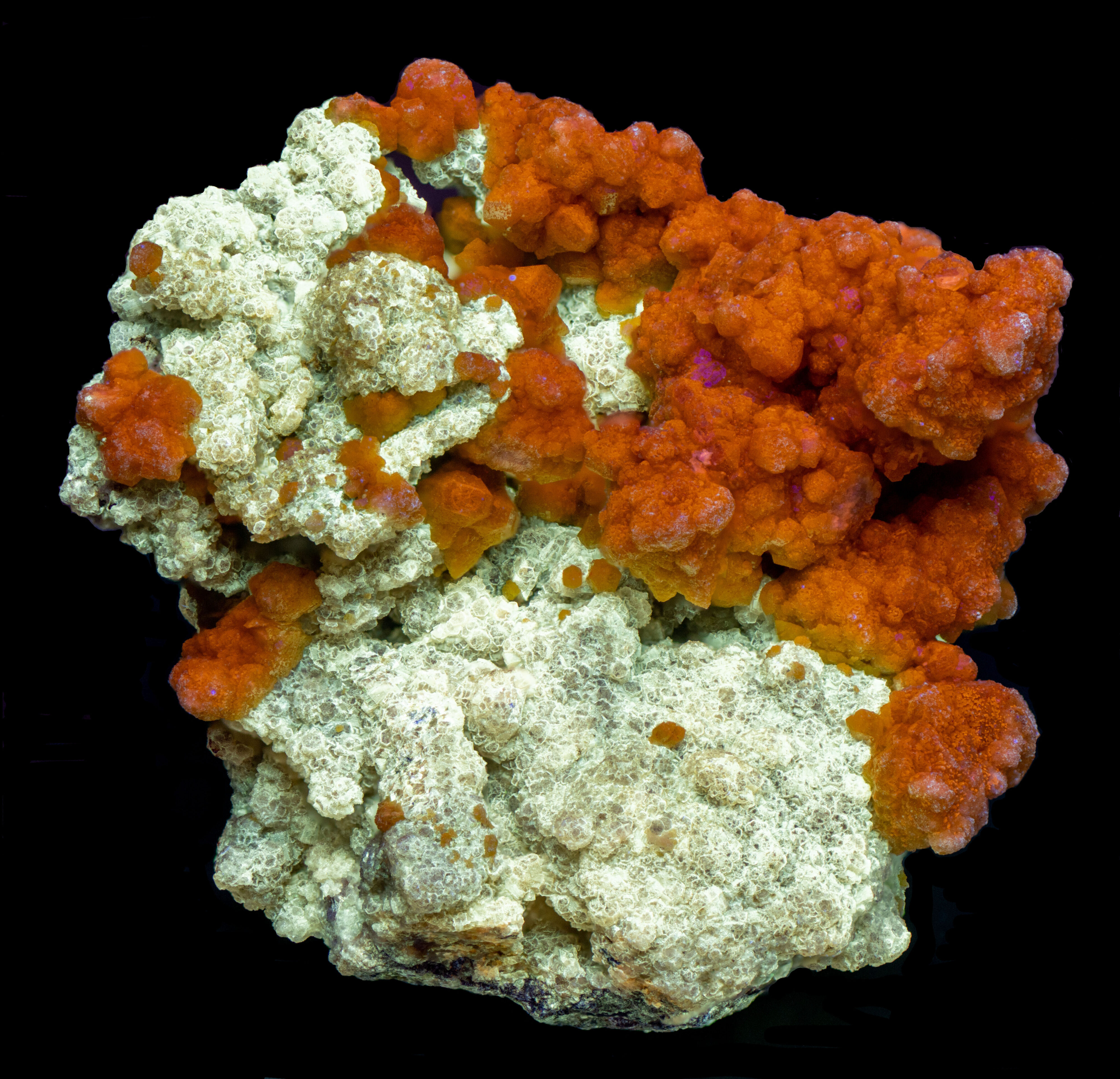 This is a thumbnail specimen of mimetite (Pb5(AsO4)3Cl) and willemite (Zn2SiO4) from the M`fouati Mine, M`fouati, Bouenza Department, Republic of the Congo. The mimetite fluoresces orange and is brightest under midwave UV illumination. The brightness of mimetite fluorescence is modest even under midwave light. It takes a strong UV light to see the fluorescence. The willemite fluoresces bright yellow under longwave UV light, it is a dimmer yellow under midwave, and it fluoresces greenish white under shortwave illumination. The willemite has long-lasting afterglow from exposure to all wavelengths of UV illumination.