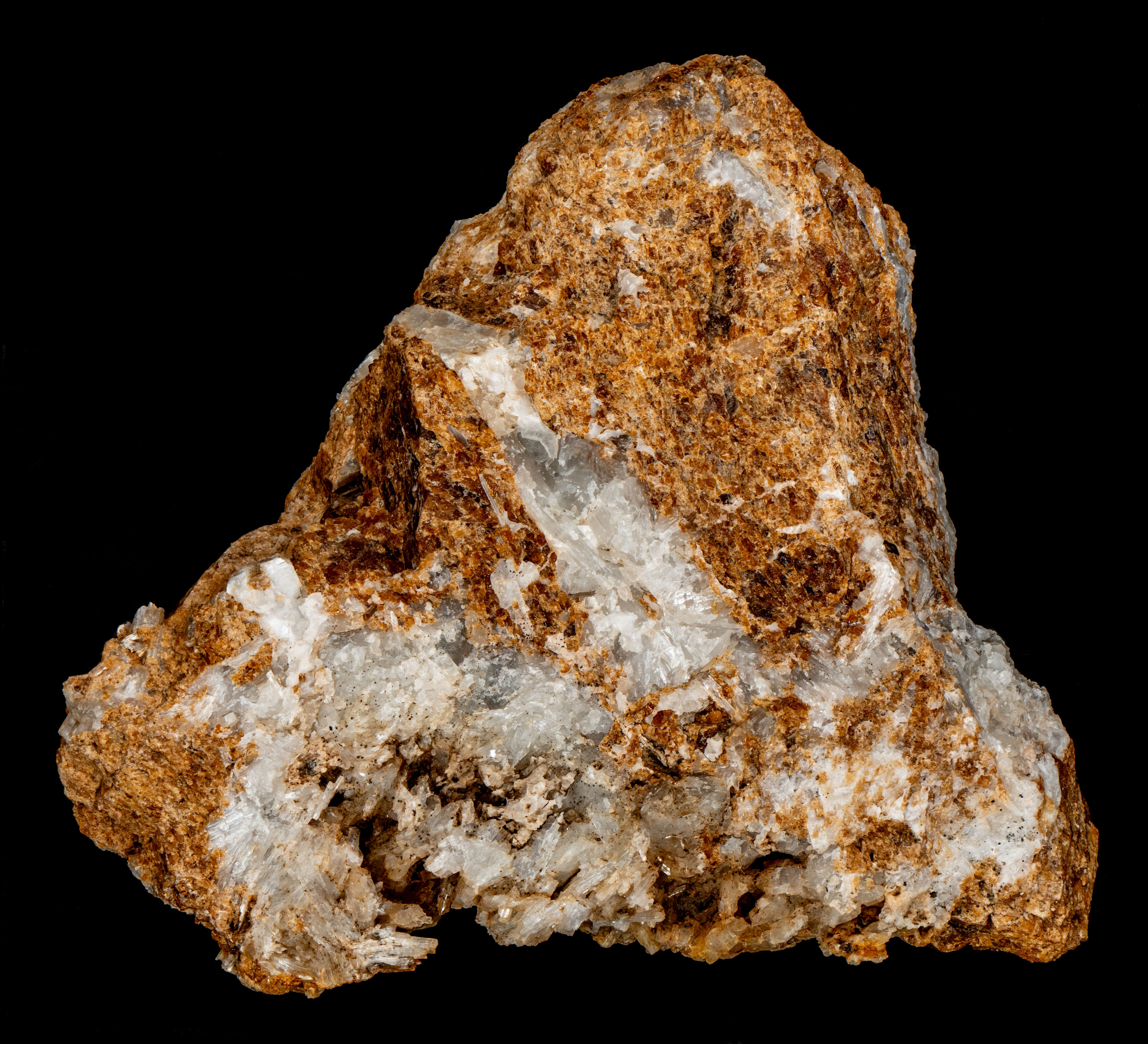 A specimen of brown fluor-uvite (CaMg3(Al5Mg)(Si6O18)(BO3)3(OH)3F ) and tremolite (Ca2Mg5(Si8O22)(OH)2) from the Bush Farm, St. Lawrence County, New York. Mindat calls this location the Reese Farm although several other references and specimen labels call it Bush Farm or Dale Bush Farm. The farm is closer to the town of Richville, but it occurs in Gouverneur township and both locations are used on specimen labels. Labels that accompany specimens can contain various combinations of these location names.