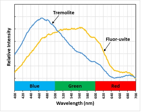 The fluor-uvite fluoresces pale yellow only under shortwave UV illumination. The emission spectrum is a very broad peak. Manganese is a likely activator for the pale yellow fluorescence. The broadness of the peak suggests that it is composed of several narrower peaks. The complex chemistry and structure of fluor-uvite might allow manganese to replace magnesium and calcium with different coordination with surrounding atoms. This different atomic coordination might create different peaks that make up the broader peak. A second activator could also cause the broader peak.