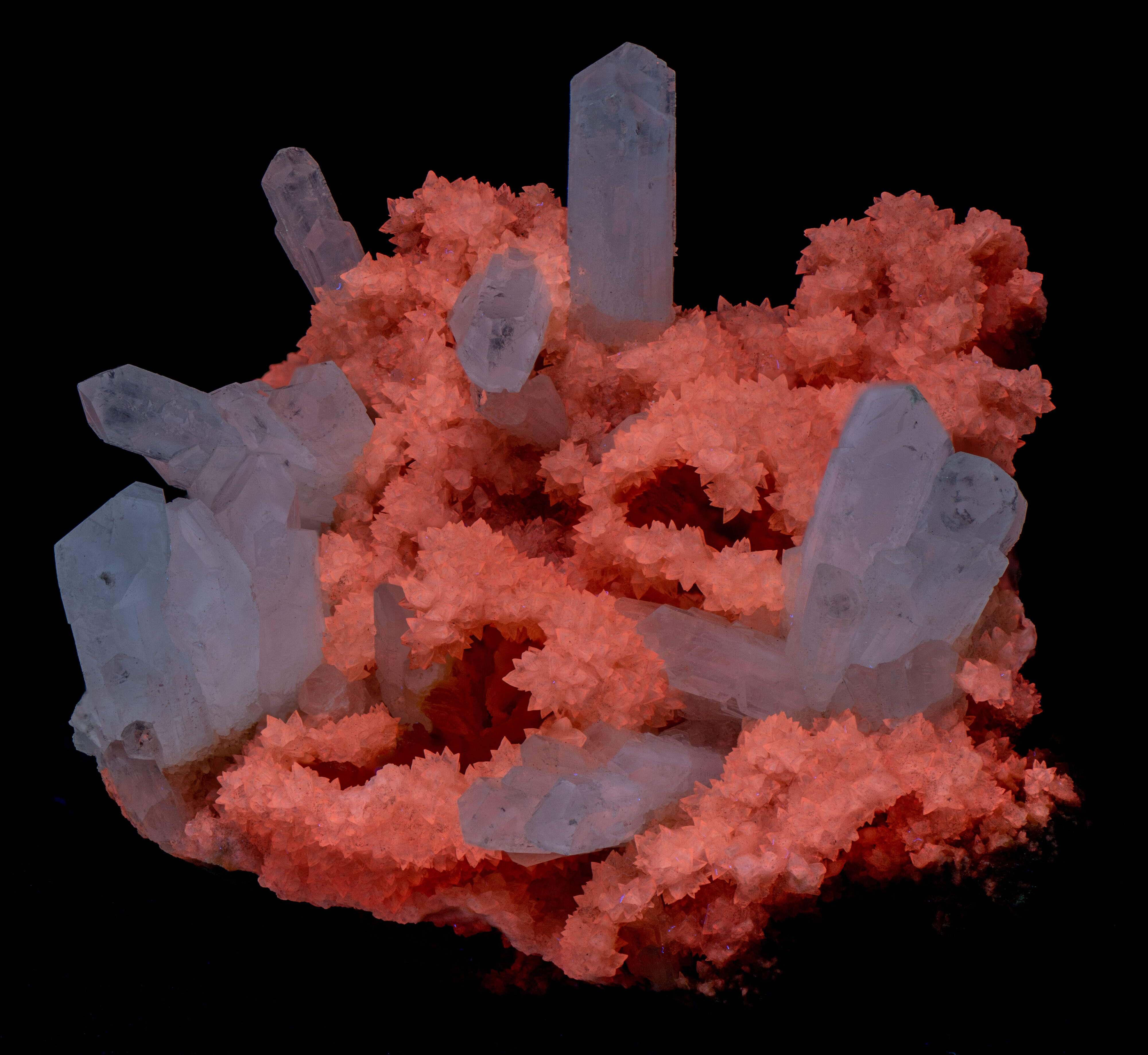 This is a specimen of orthorhombic crystals of celestine on a matric of drusy aragonite crystals from Agrigento, Agrigento Province, Sicily, Italy. The celestine fluoresces bluish white under longwave and shortwave UV illumination. The aragonite fluoresces pink under longwave light, and it is pinkish white under shortwave light.