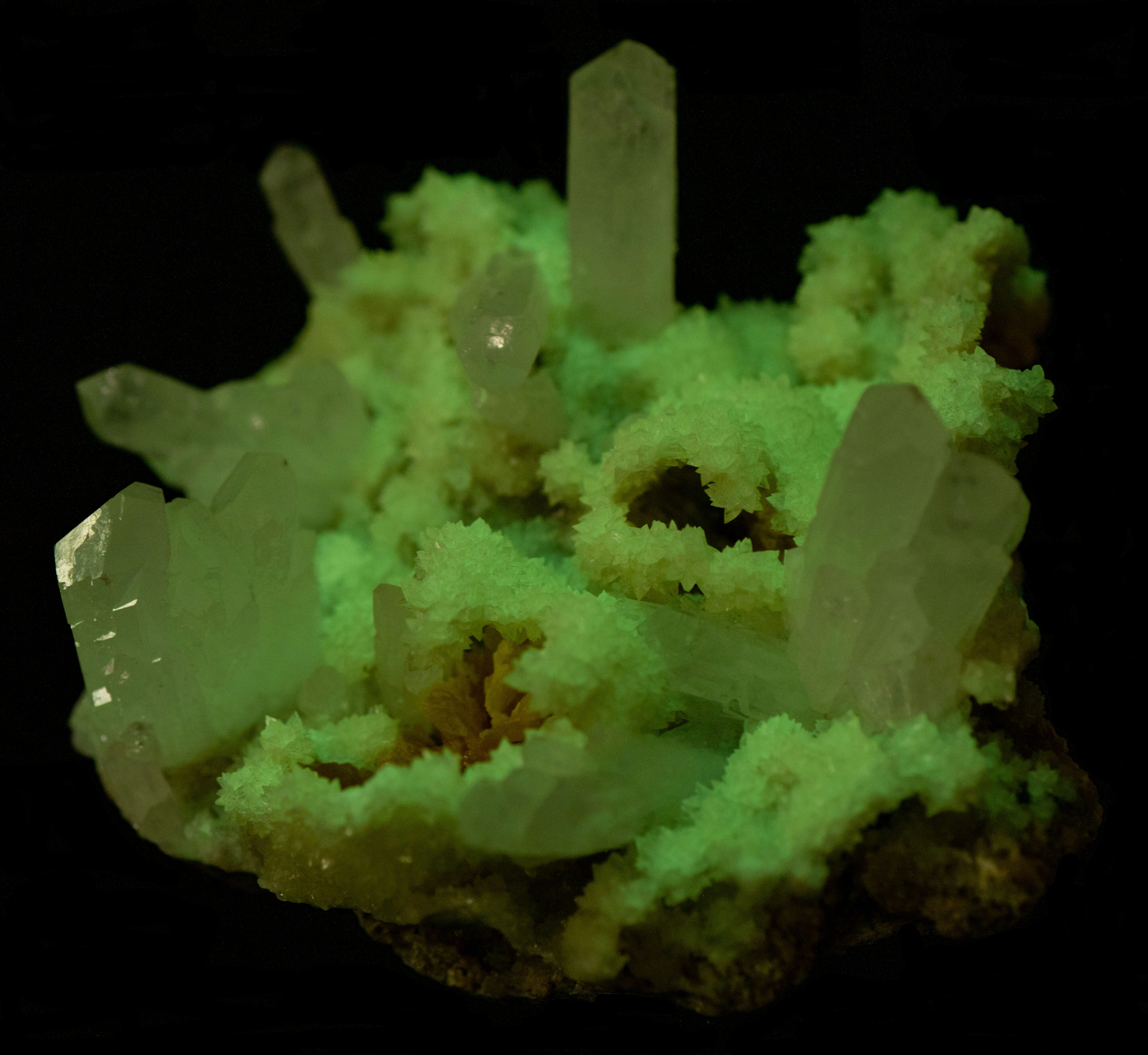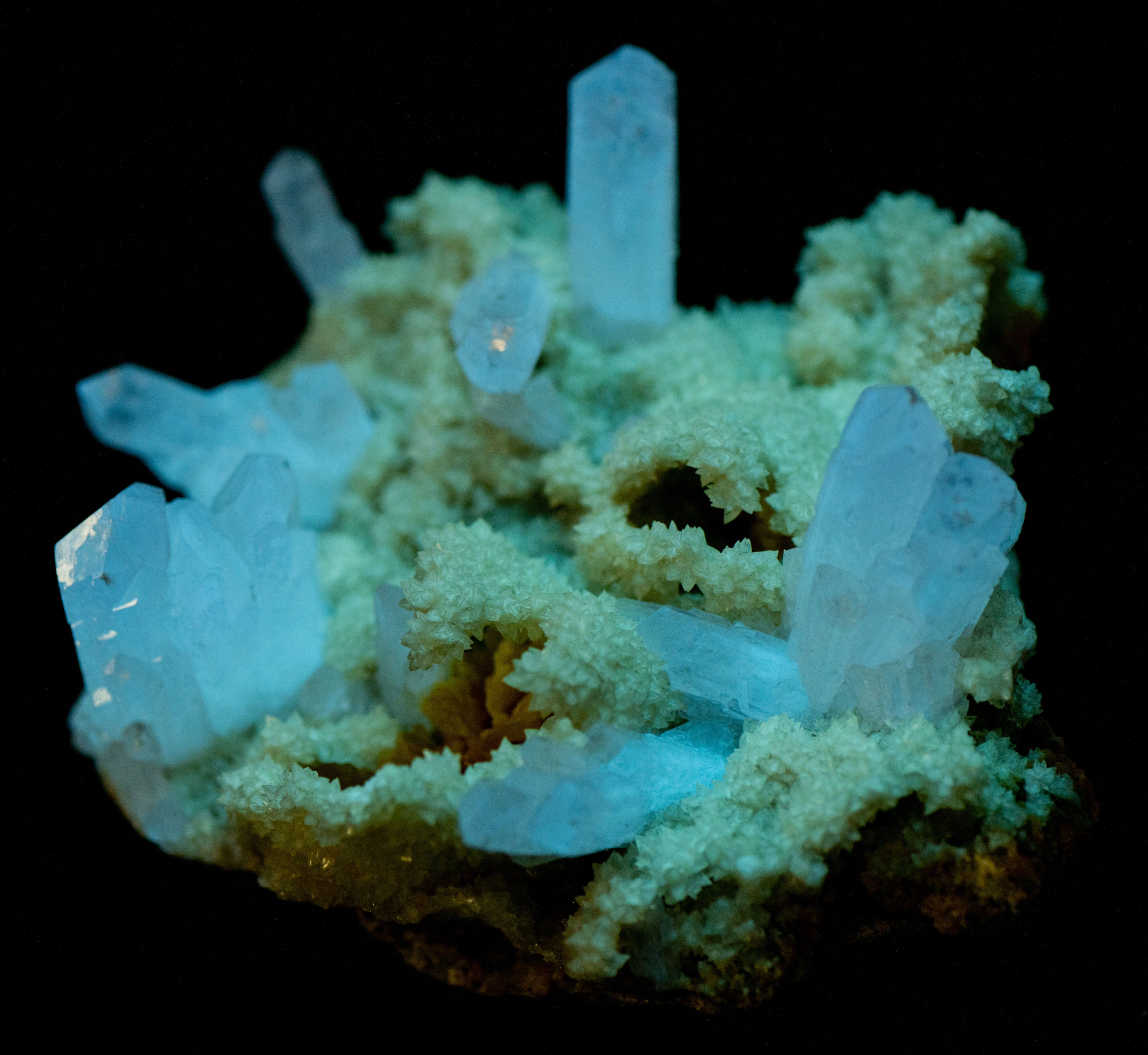 This type of fluorescence and phosphorescence activated by aromatic organic compounds occurs in several minerals that form in near surface, low temperature environments. The list of minerals include calcite, aragonite, selenite, celestine, fluorite, witherite, and colemanite.