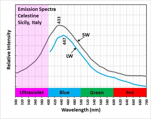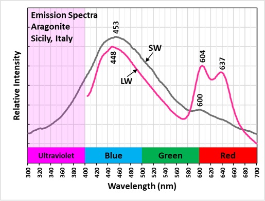 The emission peaks around 430 to 450 nm are caused by organic activators in aragonite and celestine. There are two additional peaks in the longwave emission spectrum of aragonite at 604 nm and 637 nm. The activation of these peaks is unknown at this time.