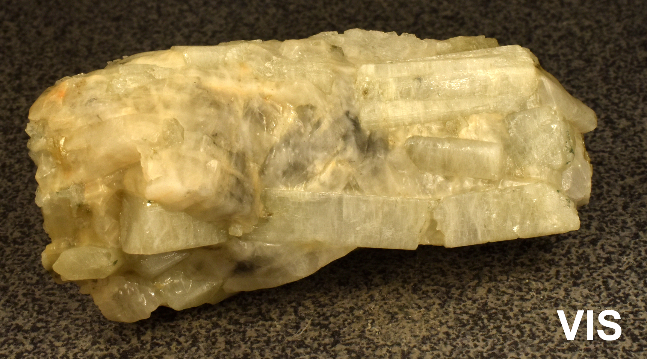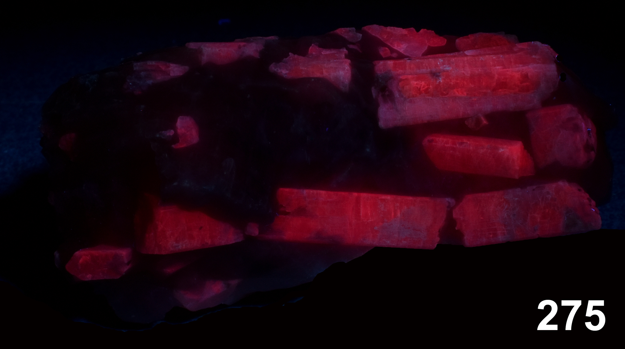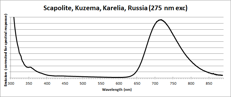 The scapolite shows a nice red fluorescence caused by Fe3+ (see the emission around 715 nm). The picture taken at 255 nm is more yellowisch than the one at 275 nm, because most 255 nm LED\'s also emit in the UV-A causing extra excitation (in this case a continuum rising to the blue). The scapolite is marialitic, but does not show the typical yellow S2- fluorescence under UVA because the conditions were too oxidizing, yielding sulphate as an impurity. It comes from Kuzema, Russian Karelia.