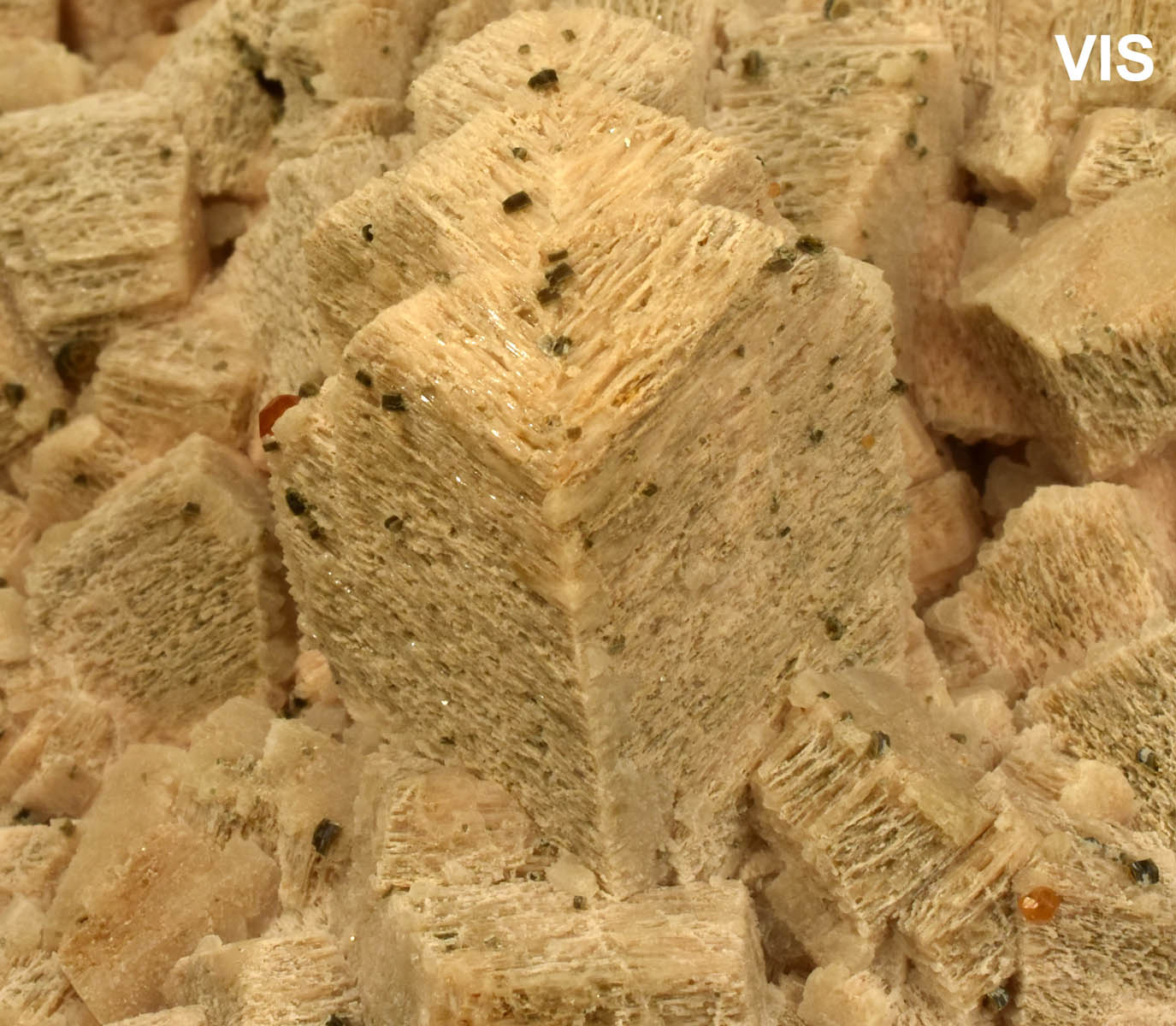Albite. Etched Baveno twins on a row. Wushan spessartine mine, Tongbei, China. The specimen shows a red fluorescence due to Fe3+. The green fluorescence is coming from uranyl activated silica coatings.