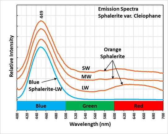 Manganese replacing zinc in the activates the orange fluorescence. It takes less energy to create this manganese activated fluorescence, so the light emitted is at a longer wavelength. Emission spectra of this orange fluorescence is a broad peak with maxima around 600 nm to 640 nm. The 449 nm peak is still present in the emission of the orange, fluorescent sphalerite.