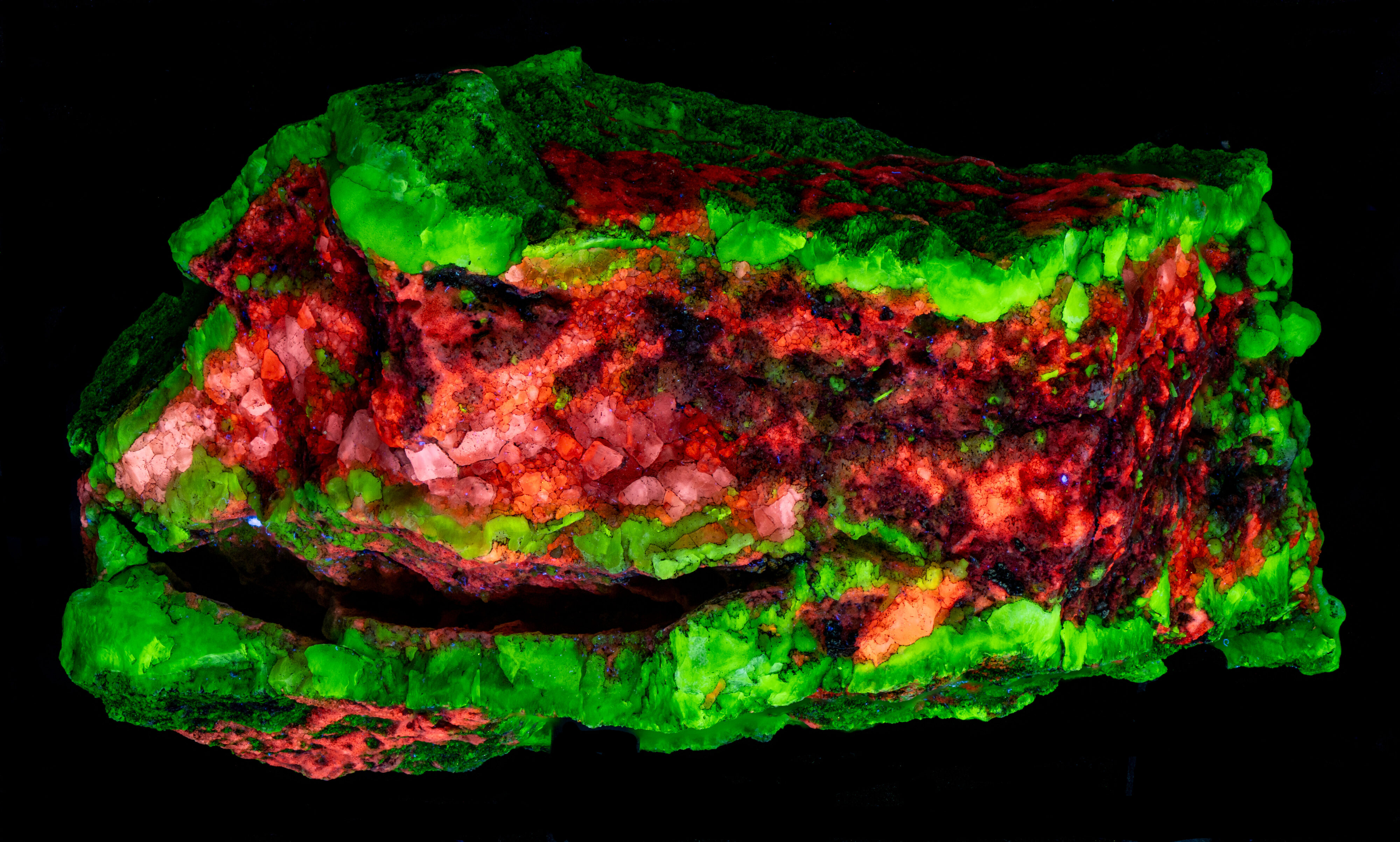 This is a slab of watermelon rock from Sioux County, Nebraska. Watermelon rock is a brightly fluorescent rock that is composed of a core of red fluorescing calcite sandwiched between two layers of chalcedony that fluoresce bright green. The name for this material comes from its visual resemblance to the red inside and green rind of a watermelon. The specimen is a piece of a 5 cm thick vein that formed in fractures of volcanoclastic claystones and siltstones of the Tertiary White River Group. The silica and uranium that formed the fluorescent chalcedony veins was leached from the surrounding volcanoclastic sediments and deposited along fracture surfaces.