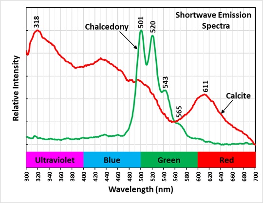 The emission spectrum of the chalcedony shows its fluorescence is activated by the uranyl ion. The spectrum has three sharp peaks at 501 nm, 520 nm and 543 nm. The red calcite fluorescence is activated by manganese and its emission spectrum is a broad peak in the red with a maximum at 611 nm. The spectrum also has a peak in the ultraviolet at 318 nm that is possibly activated by lead.