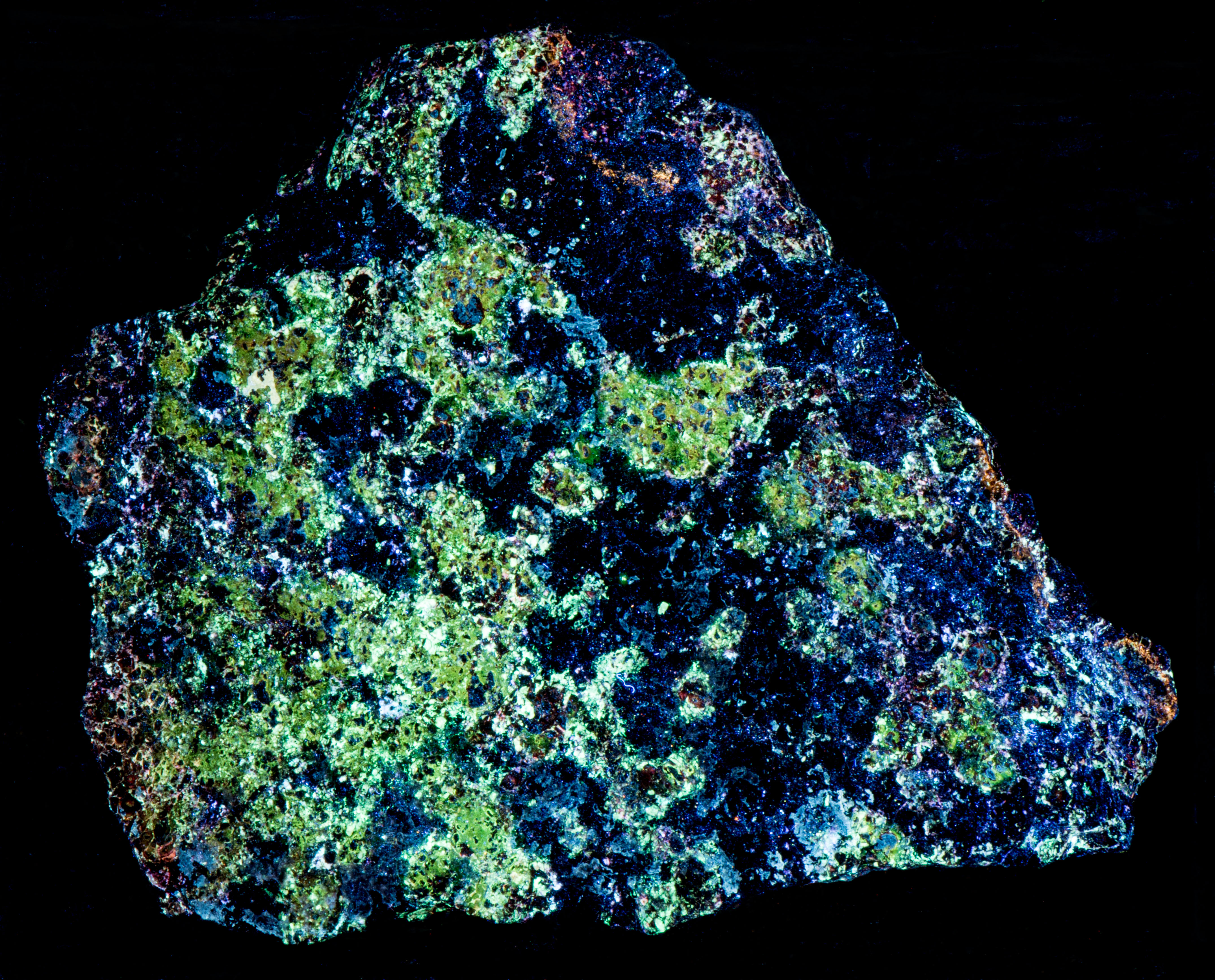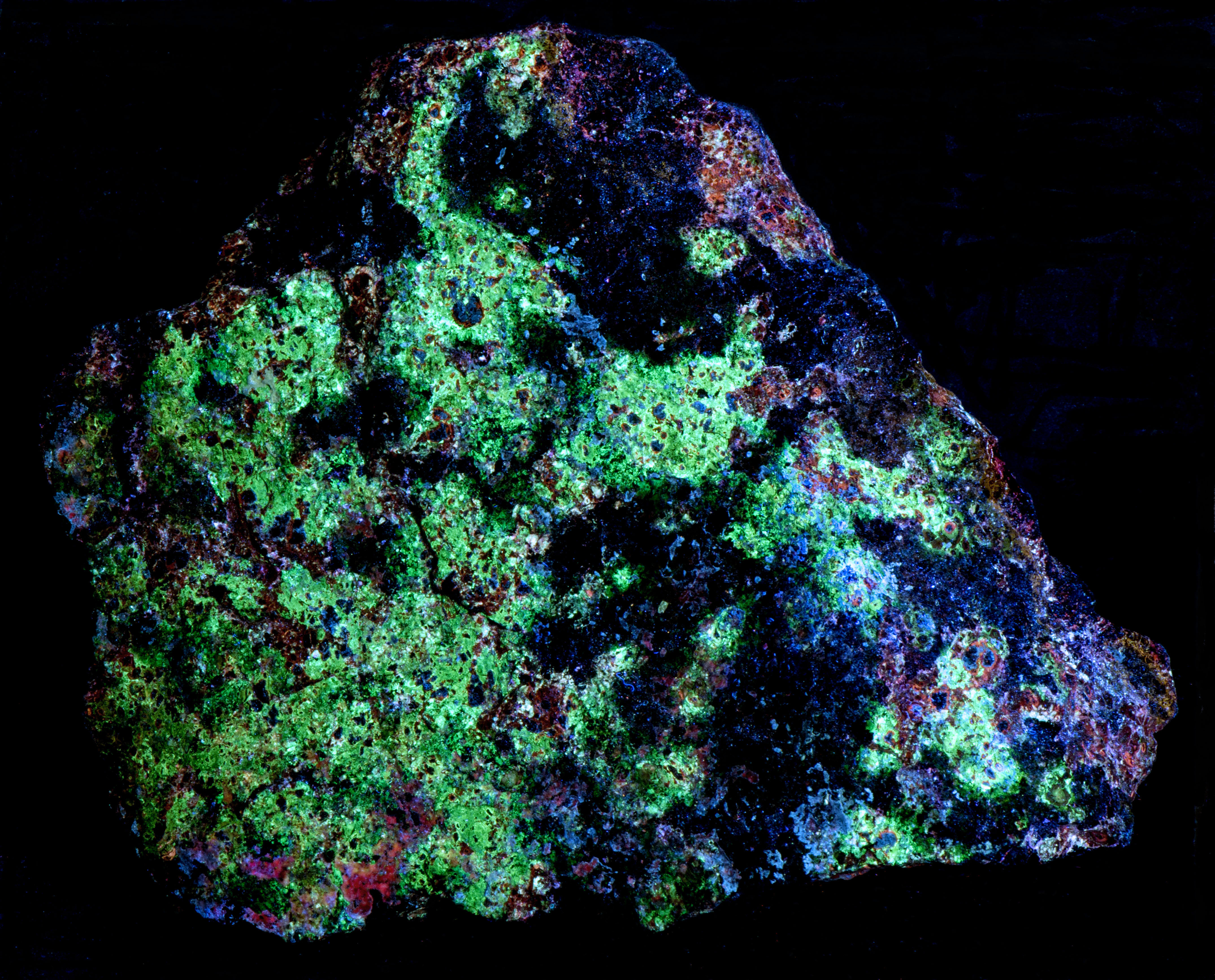 A sphalerite specimen from the Empire State No.2 Mine (ZCA #2 Mine), Balmat, St. Lawrence County, New York. Most of the sphalerite fluoresces bright green under all wavelengths of UV light. The green sphalerite has modest green afterglow after exposure to longwave light. There are also scattered grains of blue, fluorescent sphalerite under longwave light. There are small patches of orange, fluorescent sphalerite under longwave light and there are more patches of orange under midwave light. The fluorescence under shortwave light is similar to the midwave response.