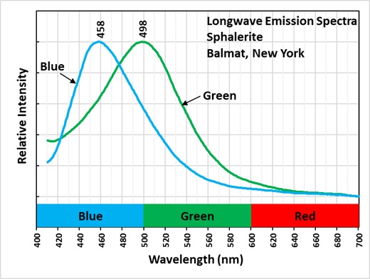 Sphalerite is a semi-conductor. The band gap between the valance band and the conduction band is narrow enough that electrons can move to the conduction band when sphalerite is exposed to UV light. Impurities such as copper, manganese, and silver can alter the band gap energy difference and activate a wide range of colors. The bigger energy gap between the valance band and conduction band with no impurities activates violet to blue fluorescence. Green sphalerite fluorescence is caused by copper and aluminum substituting for two zinc ions. Zinc ions have a 2+ charge, cuprous ions have a 1+ charge, aluminum ions have a 3+ charge. Two zinc ions (2 * 2+ = 4+) are replaced by a copper ion and an aluminum ion ((1+) + (3+) = 4+) in order to maintain charge balance. The longwave emission spectrum shows the green fluorescence peak at 498 nm in the Balmat specimen.