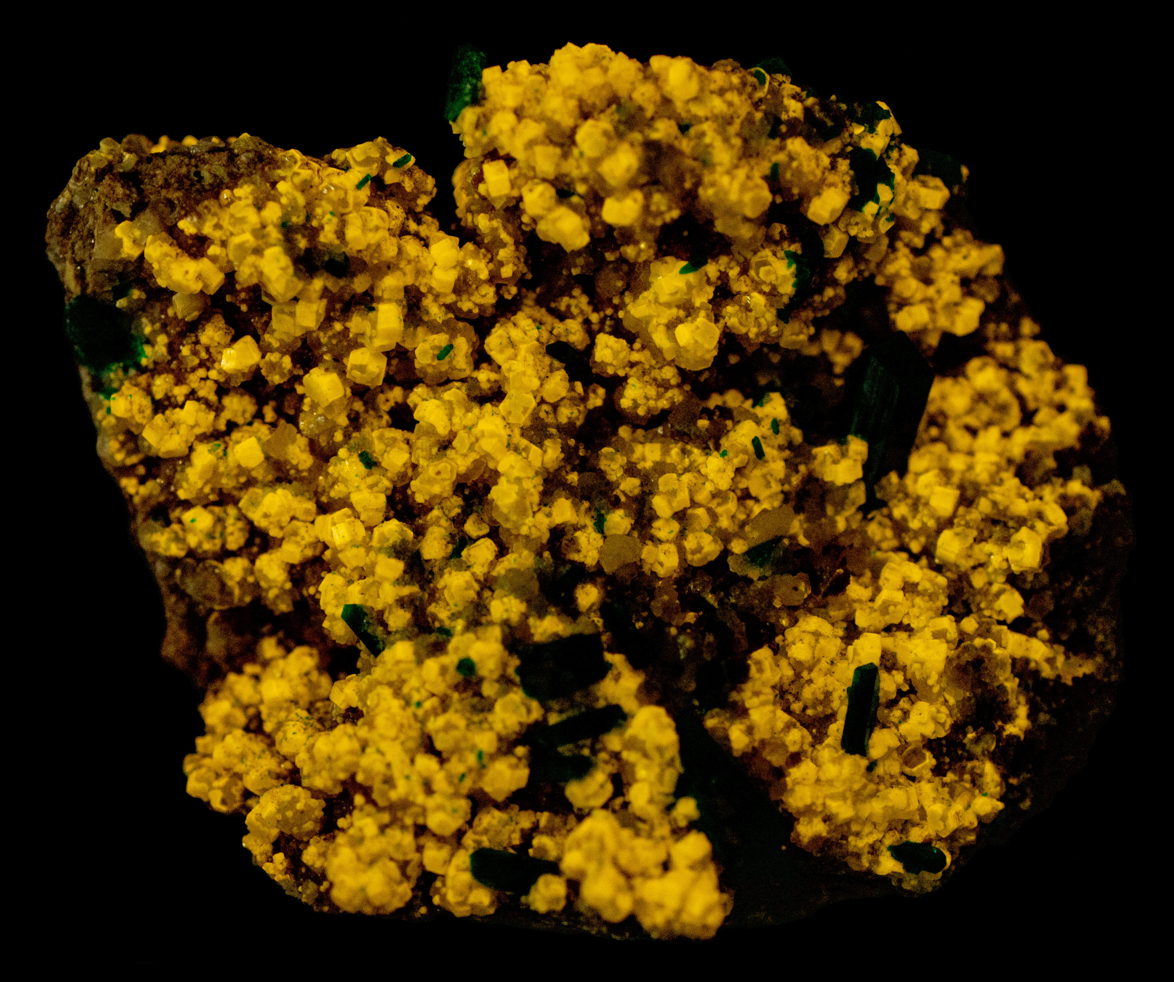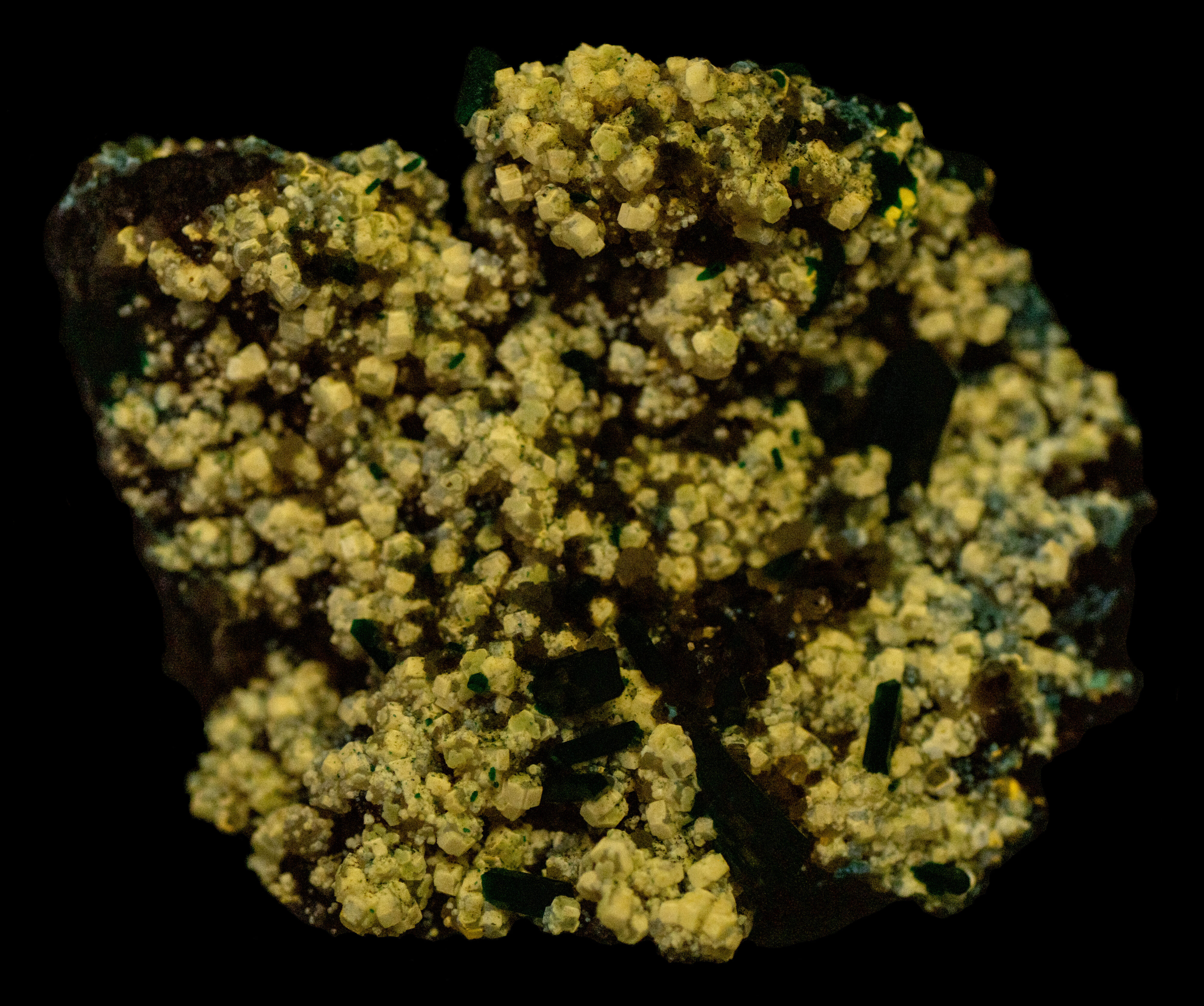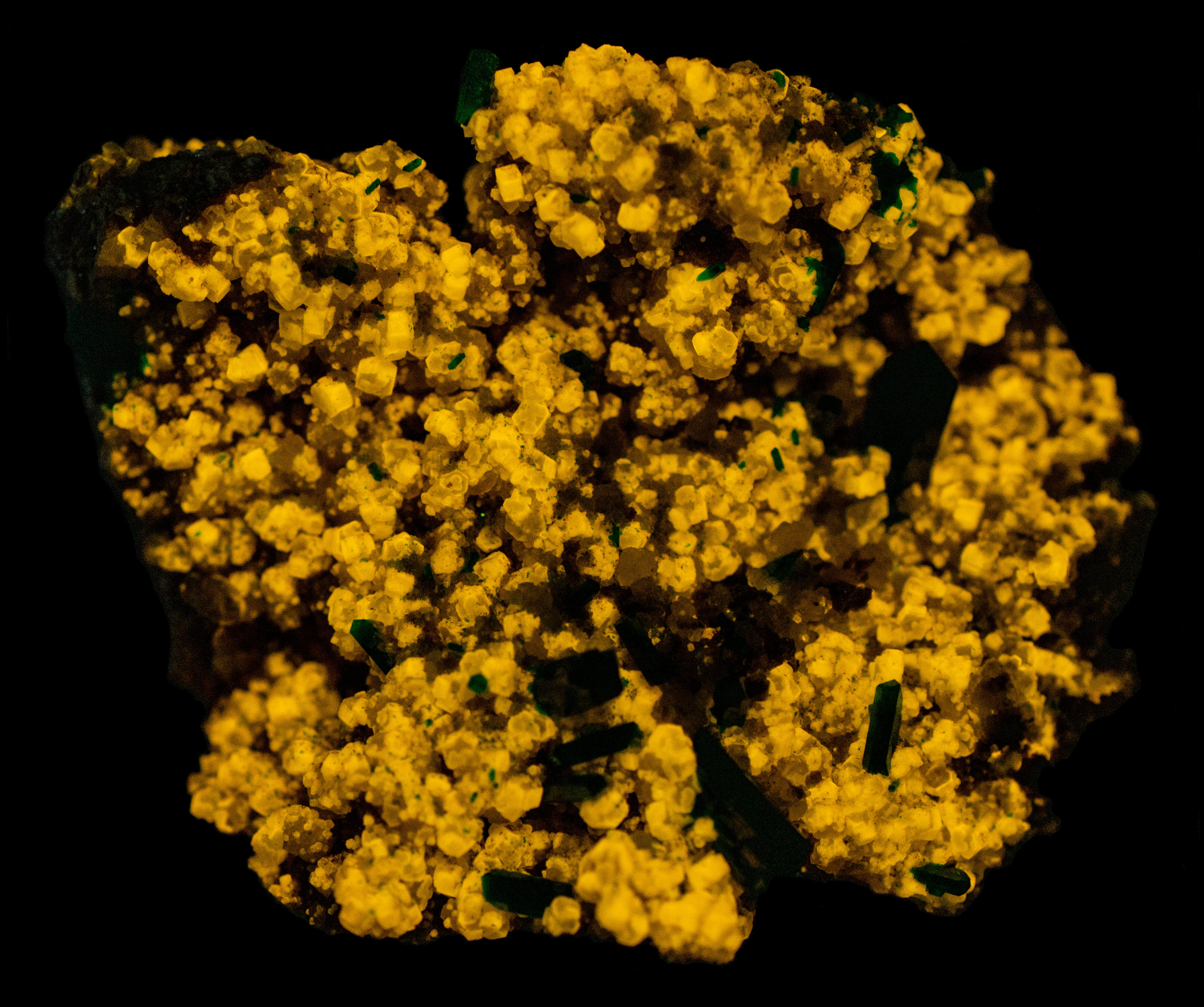 Pictured is a specimen of willemite and calcite. The specimen also contains crystals of non-fluorescent green dioptase. It is from Gotala, Mindouli, Mindouli District, Pool Department, Republic of the Congo. The willemite fluoresces yellow under longwave and midwave UV illumination, and greenish white in SW illumination. The willemite has yellow afterglow after exposure to all UV wavelengths.
