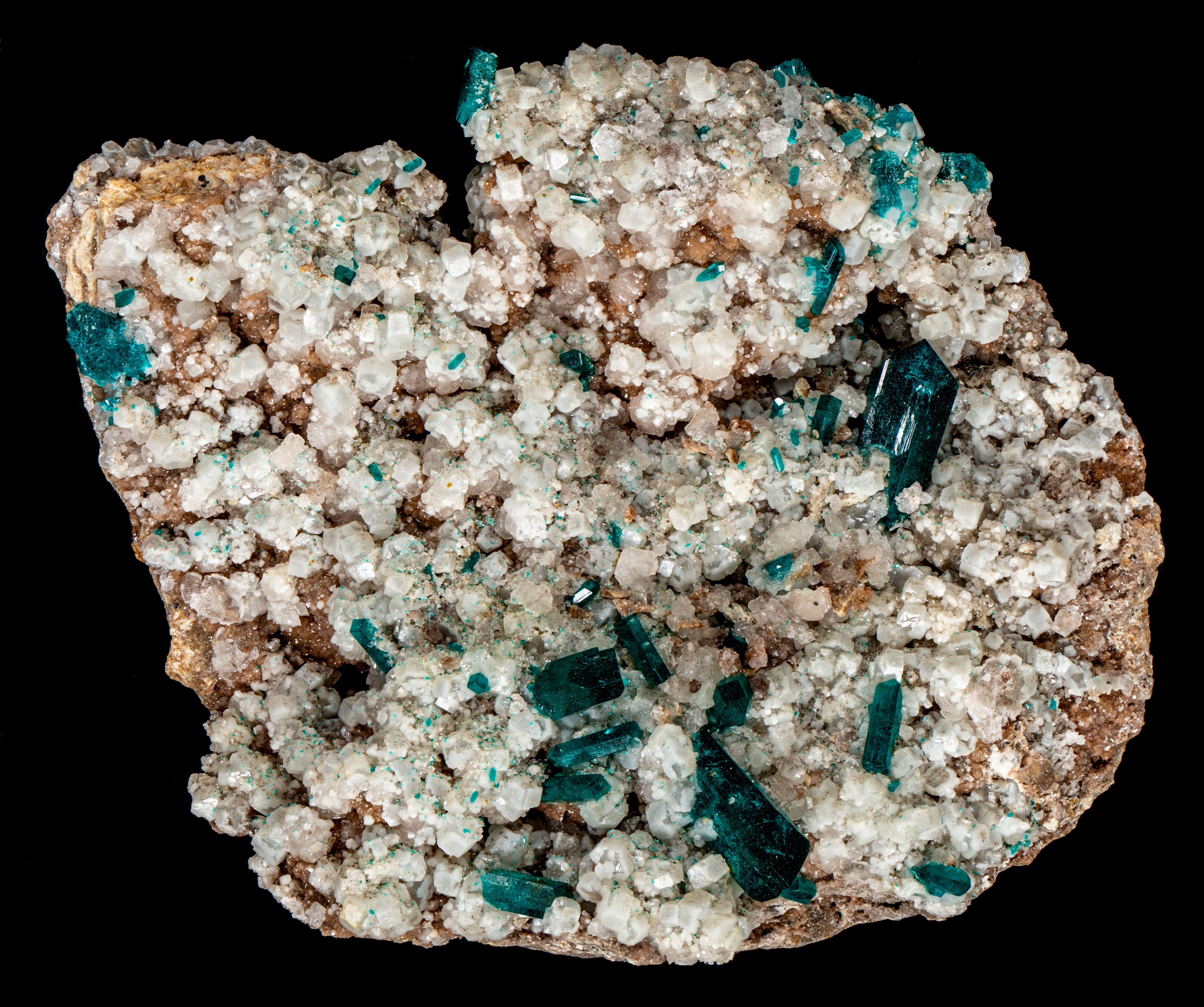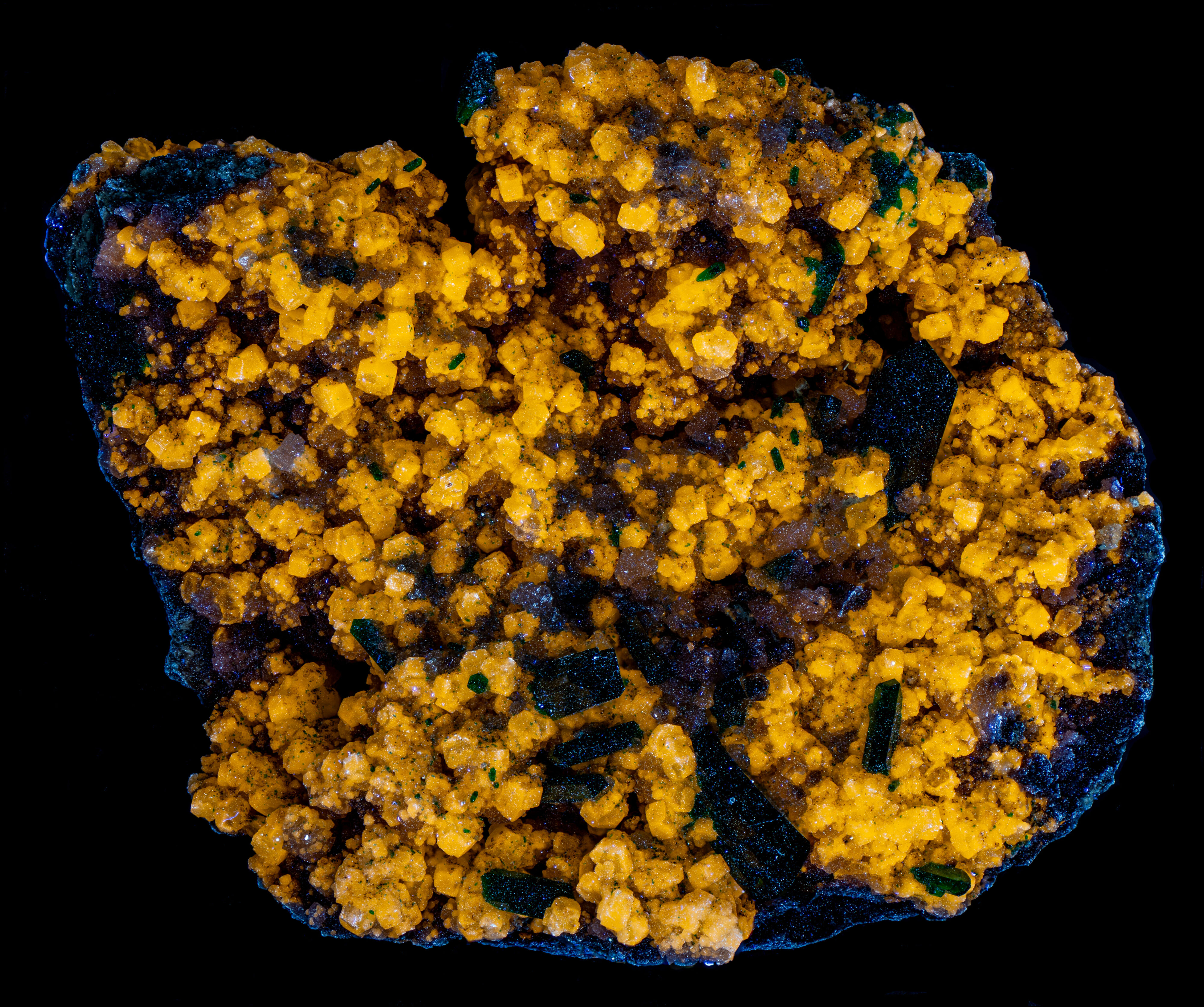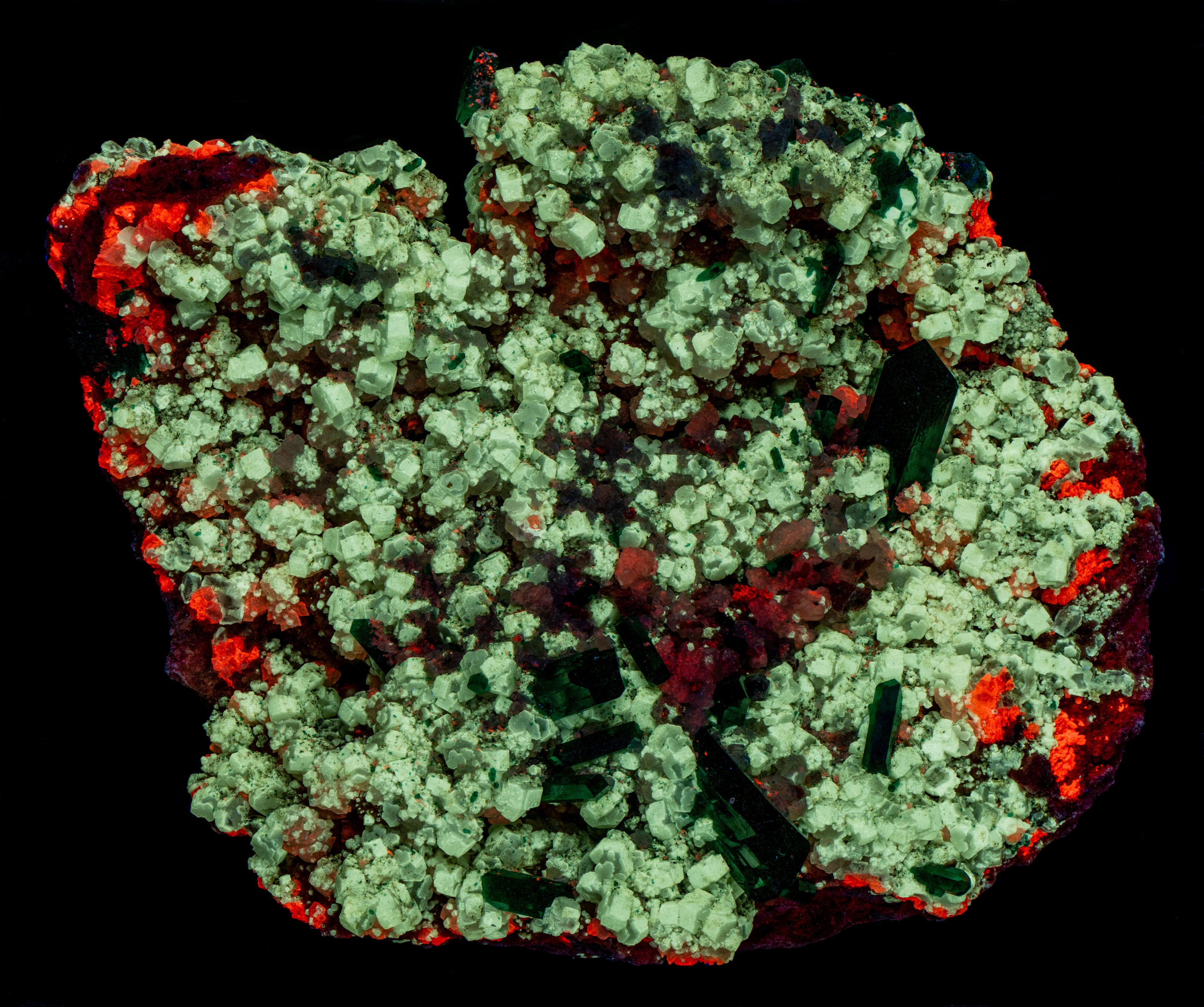 Pictured is a specimen of willemite and calcite. The specimen also contains crystals of non-fluorescent green dioptase. It is from Gotala, Mindouli, Mindouli District, Pool Department, Republic of the Congo. The willemite fluoresces yellow under longwave and midwave UV illumination, and greenish white in SW illumination. The willemite has yellow afterglow after exposure to all UV wavelengths.