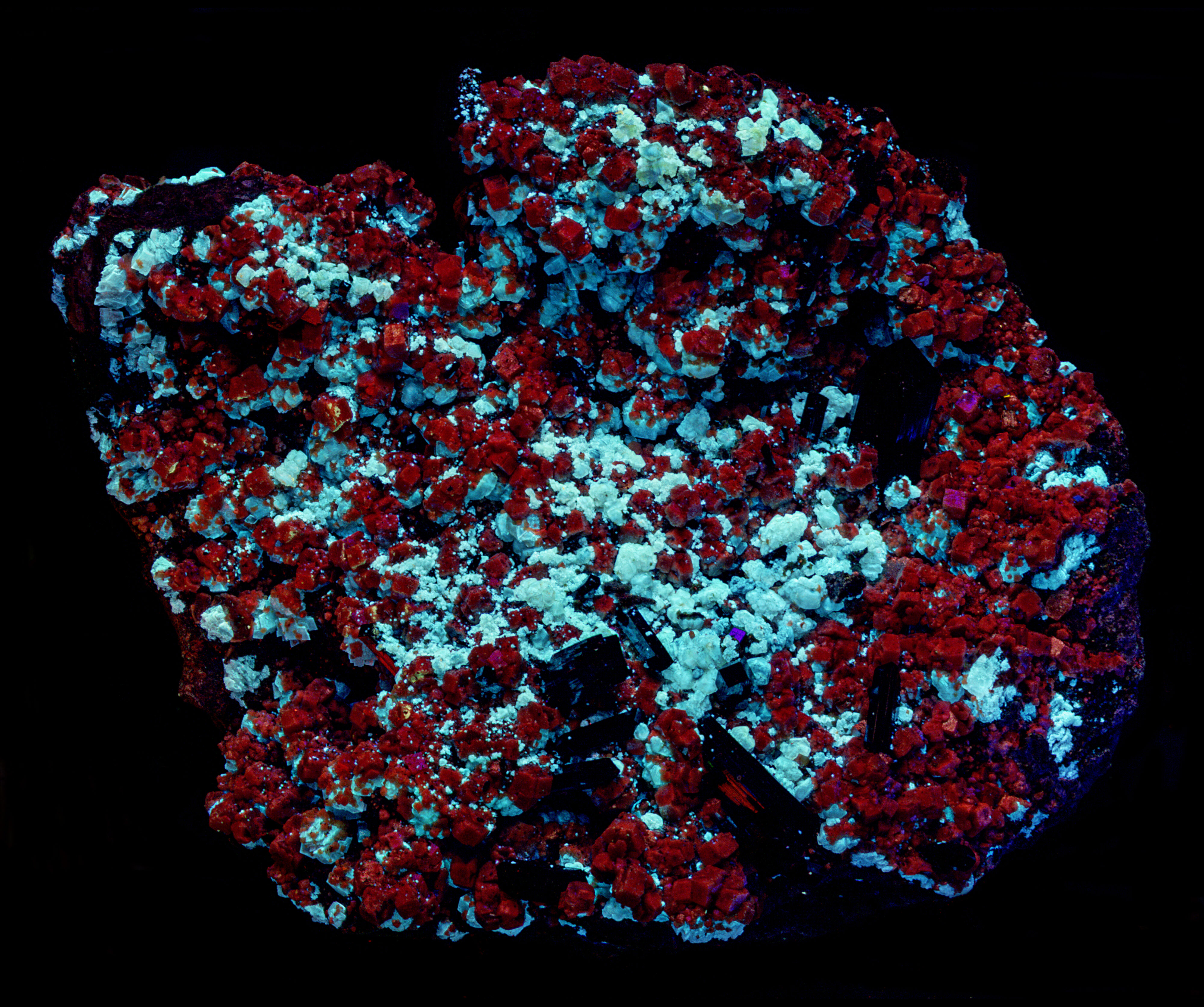 The calcite is weakly fluorescent under midwave light and fluoresces bright orange red under shortwave light. Emission spectra of the minerals are shown in the last image. Calcite has a strong, sharp peak at 311 nm. This ultraviolet fluorescence is activated by lead. The orange-red fluorescence of calcite peaks around 620 nm. This visible light peak is considerably less intense than the ultraviolet peak. The orange-red fluorescence is activated by manganese. The false color image of ultraviolet fluorescence shows the calcite as light blue from the lead activated peak at 311 nm.