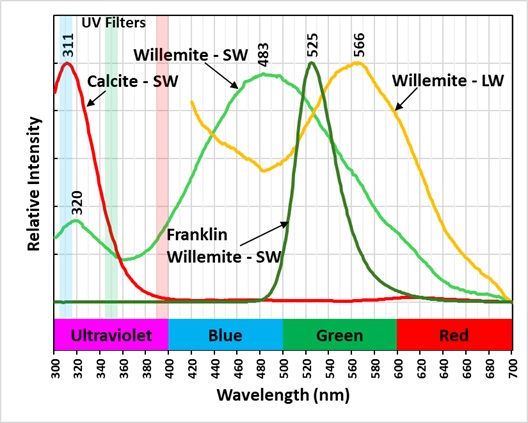 The shortwave willemite fluorescence of this Congo specimen has a broad peak with a maximum around 483 nm. This peak is much broader compared to the fluorescence of willemite from Franklin, New Jersey and its maximum is shifted to shorter wavelengths around 483 nm. The green color of Franklin willemite is shown in the sharp peak with a maximum at 525 nm. The broader width of the Congo willemite fluorescence corresponds to the whitish color that contains more visible wavelengths. The green fluorescence is activated by manganese like the orange-red fluorescence of calcite. The presence of more fluorescent wavelengths in the Congo willemite indicates that manganese and additional activators are present. Additional activators in the Congo willemite are also indicated by the yellow fluorescence in LW and MW illumination. Yellow willemite fluorescence also occurs in specimens from Puttapa, Australia and Balmat, New York. When Franklin willemite fluoresces under longwave and midwave light, it is green like the shortwave fluorescence. Arsenic activates afterglow in willemite, and it may activate the yellow longwave and midwave fluorescence. The additional shortwave fluorescence may be activated by arsenic, lead or a rare earth. For a full discussion of the willemite afterglow, see Bostwick/Waychunas/Green in UV Waves, supplement to v48 n6, Nov-Dec 2018.