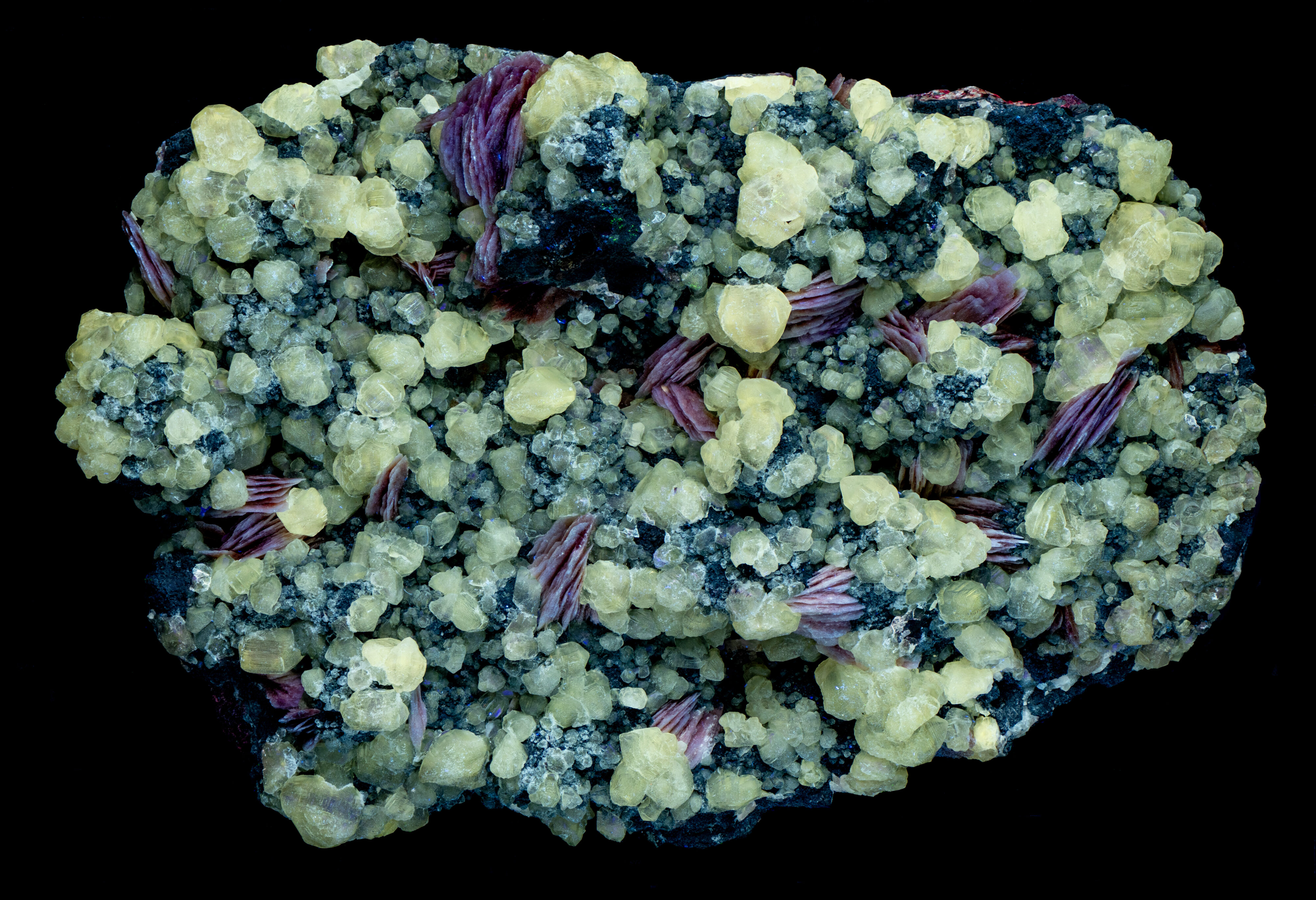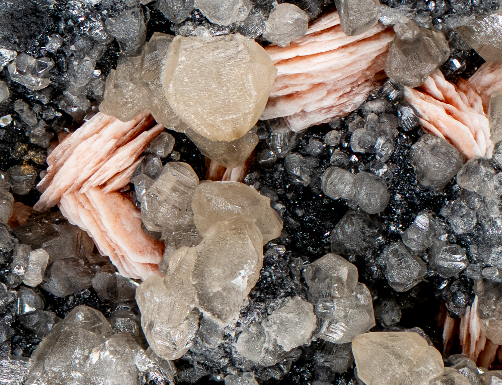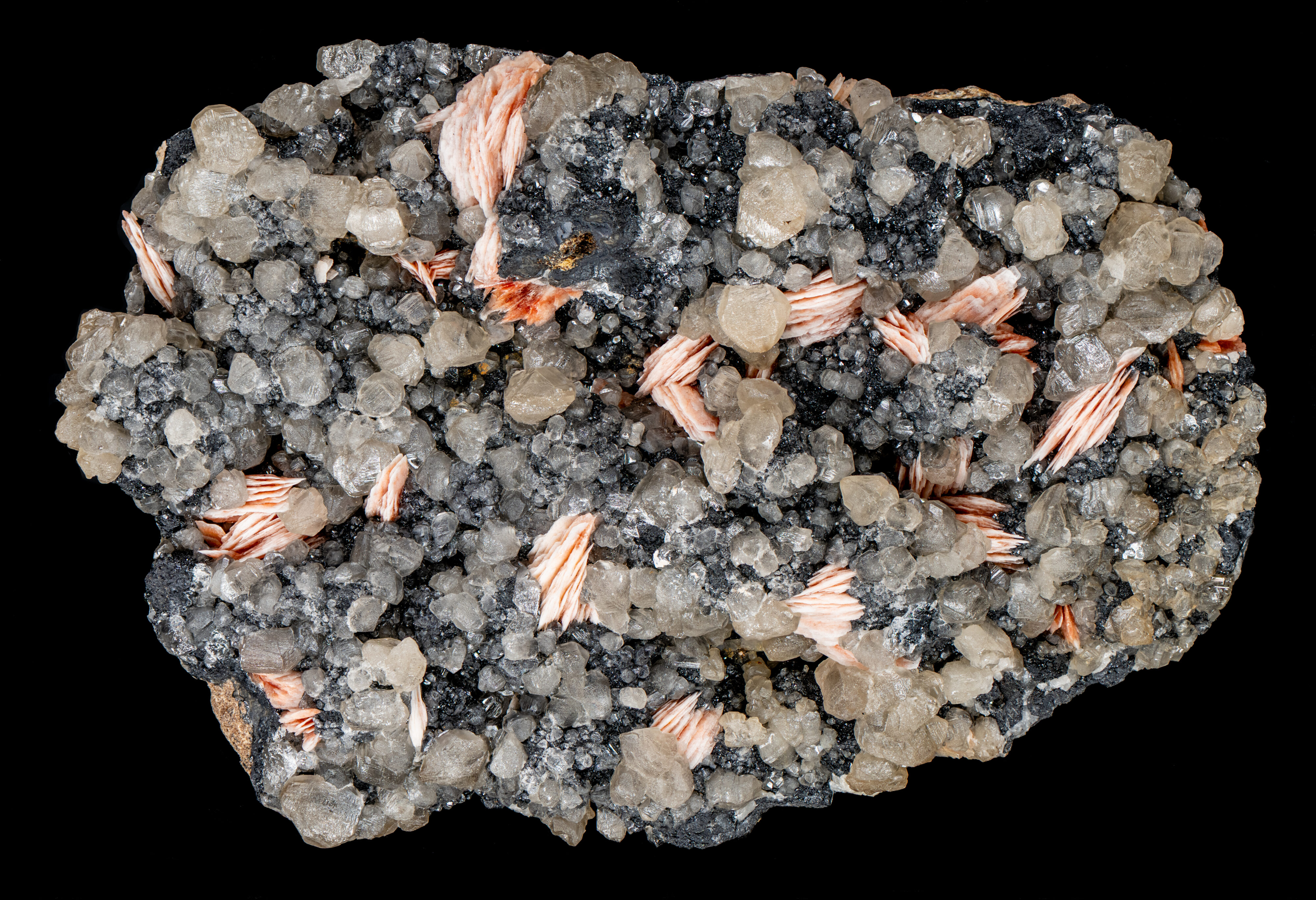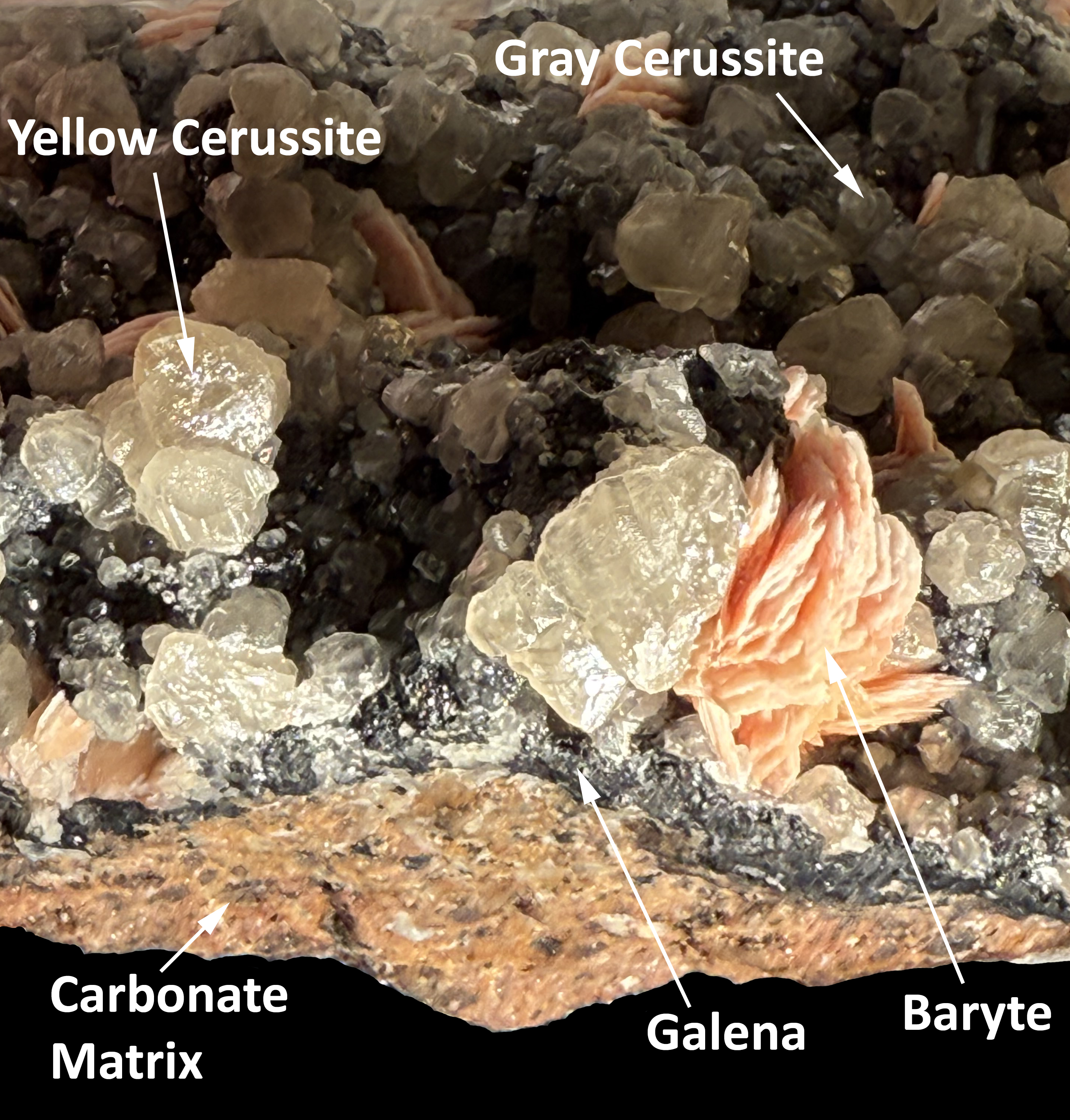 Cerussite (PbCO3) and bladed salmon pink baryte (BaSO4) on galena (PbS) from Mibladen, Midelt Province, Morocco. The mineralization of the Mibladen ore deposit is hosted by Jurassic carbonates as well as conglomerates and sandstones. This specimen from Mibladen has a layer of galena crystals on a carbonate matrix. The galena is overlain by two generations of cerussite crystals and baryte. Cerussite is a secondary mineral formed from the oxidation of galena. The first generation of cerussite consists of gray translucent crystals that range in size from 2 mm to 4 mm. The second generation of cerussite has larger, yellowish gray crystals that are 4 mm to 10 mm in size.