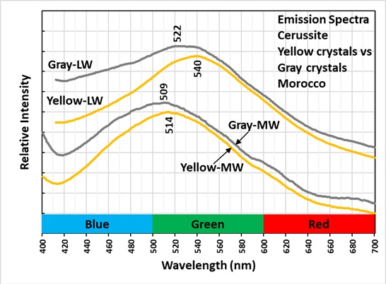 The emission spectra show the two generations have slightly different signatures. The maxima of the emission peaks of the gray cerussite crystals occur at shorter wavelengths compared to the yellow crystals in both the longwave and midwave spectra.