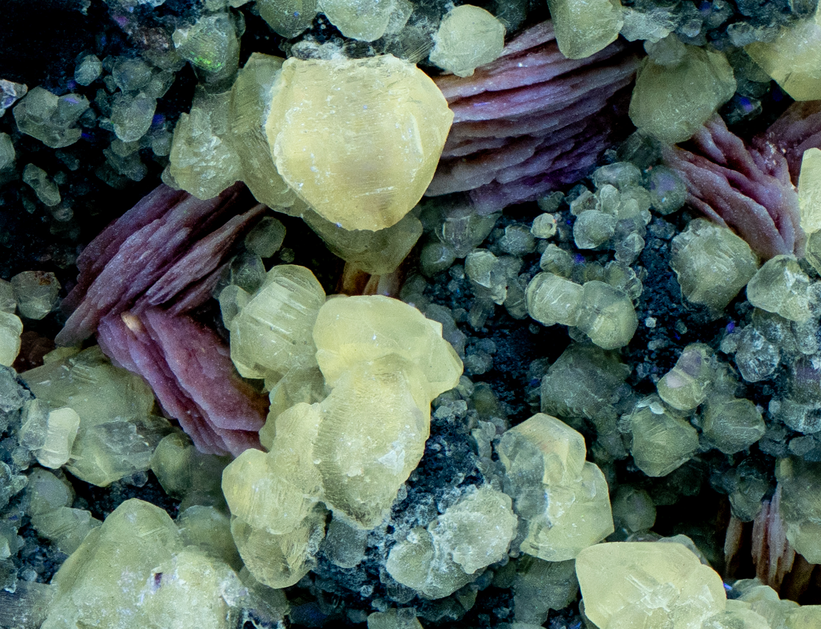 Both generations of cerussite fluoresce bright yellow under longwave and midwave UV illumination. Their fluorescence is a very dim bluish gray under shortwave light. A long camera exposure is needed to capture the shortwave fluorescence. The greatest difference in fluorescence between the two generations of cerussite is best seen in the closeup image of shortwave fluorescence. The smaller first-generation crystals are gray and the larger second-generation crystals are pale yellow. The closeup shortwave image also shows the weak red fluorescence of the baryte blades.