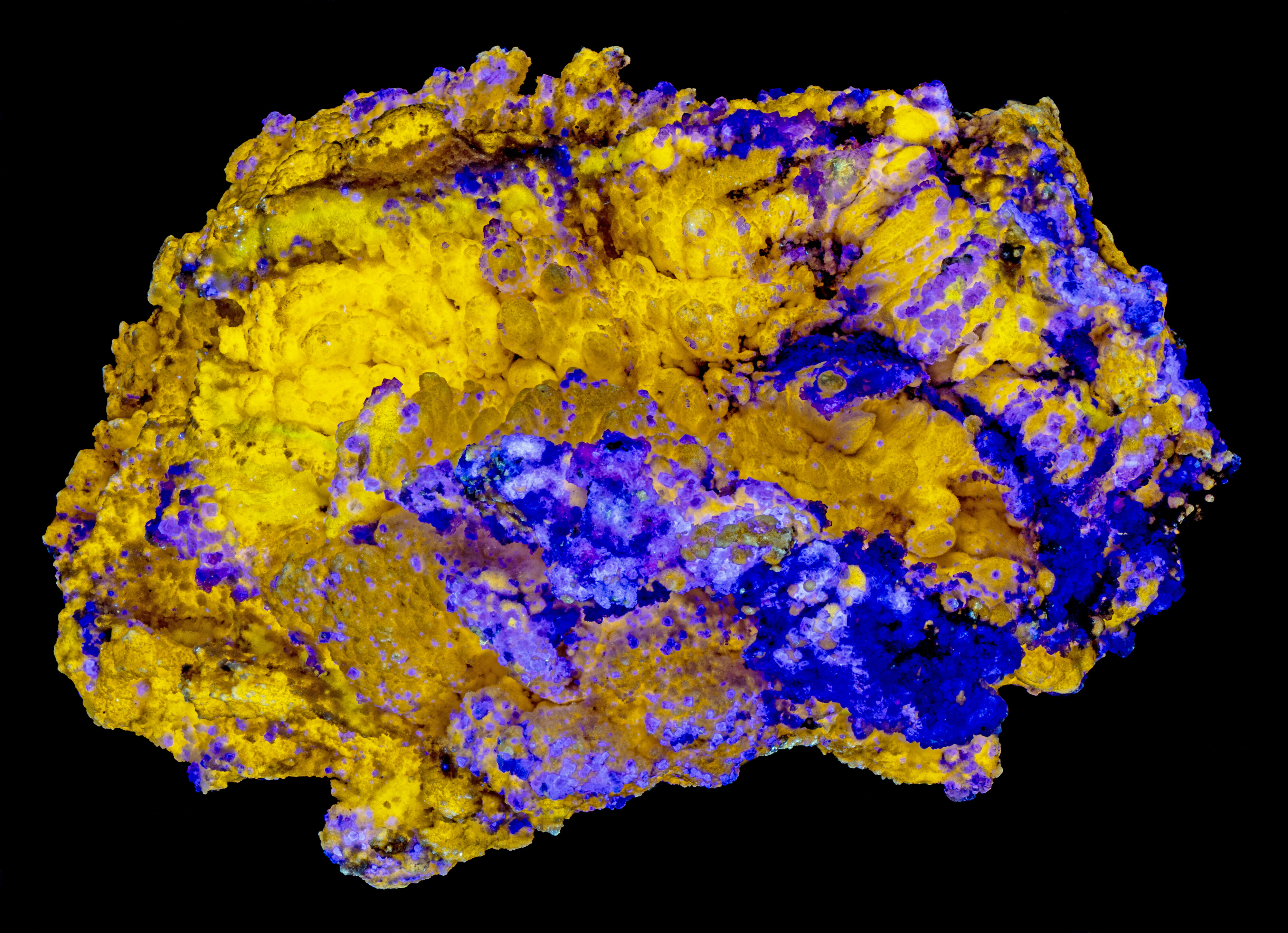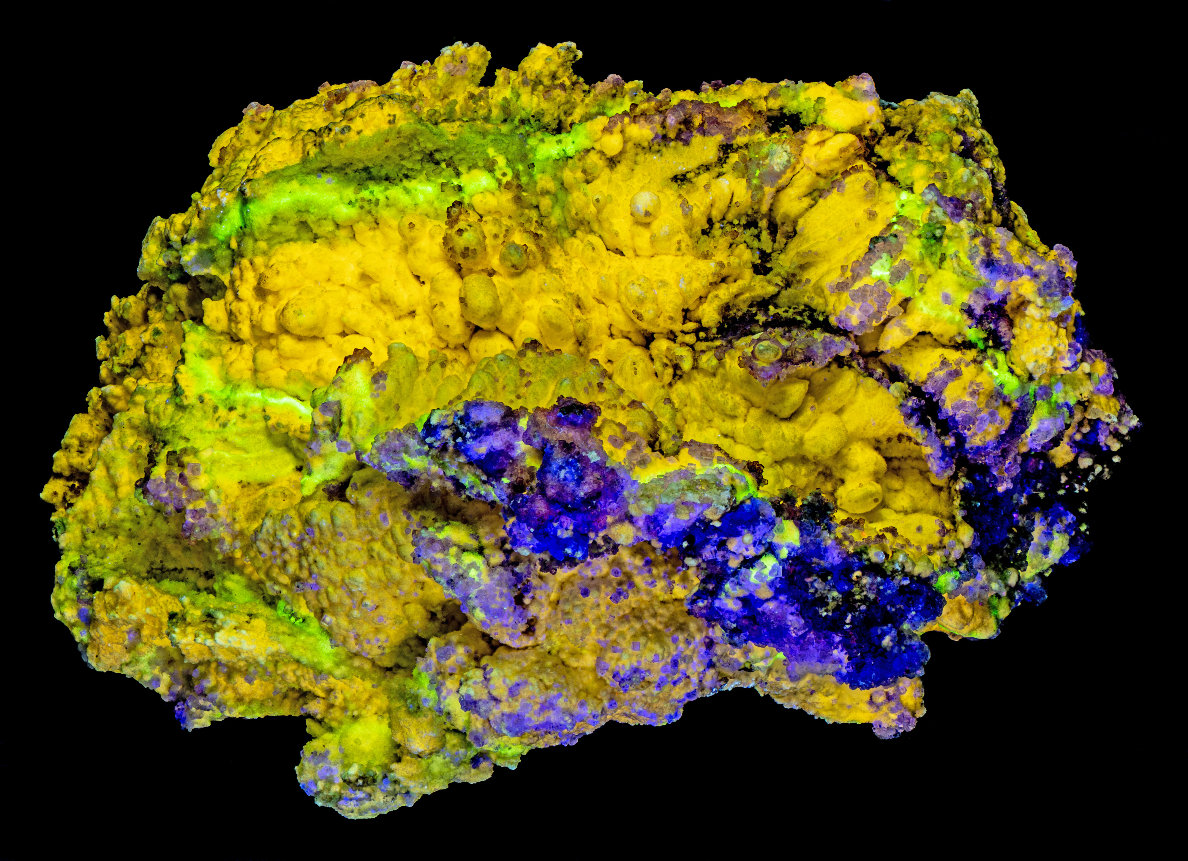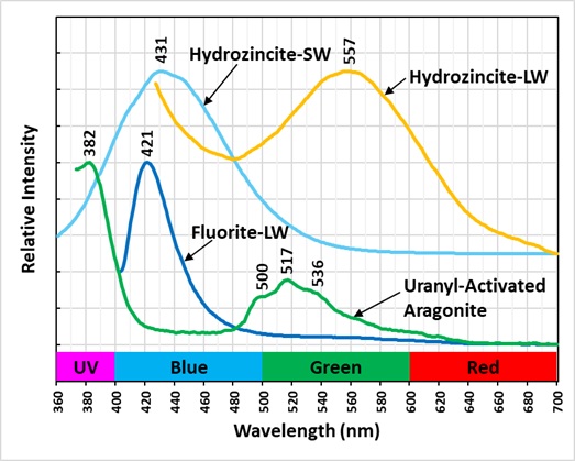 Under midwave light there is a green, fluorescent mineral that may be uranyl activated aragonite. The uranyl activation is shown in the emission spectrum with three sharp peaks at 500 nm, 517 nm, and 536 nm. There is another very bright peak in the ultraviolet at 382 nm. The activator of this ultraviolet peak is unknown. It might be lead.