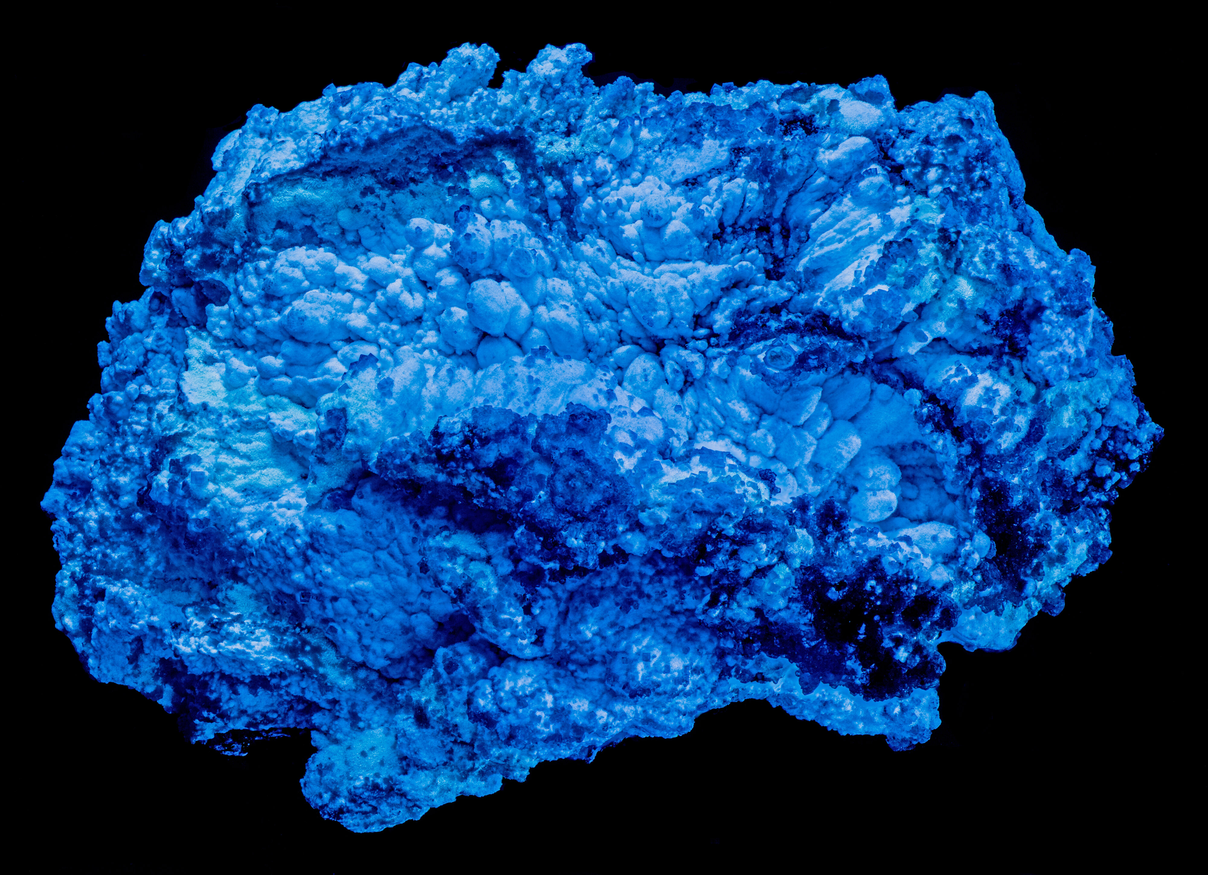 The hydrozincite fluoresces bright yellow under longwave and dimmer yellow under midwave light. The color of the hydrozincite fluorescence changes to bright light blue under shortwave light. The shortwave emission spectrum of blue, fluorescent hydrozincite is a broad peak with a maximum at 431 nm. This fluorescence is activated by lead (Pb2+) replacing zinc. The longwave peak emission peak is at 557 nm for the yellow fluorescence of hydrozincite. The cause of this yellow fluorescence is unknown.