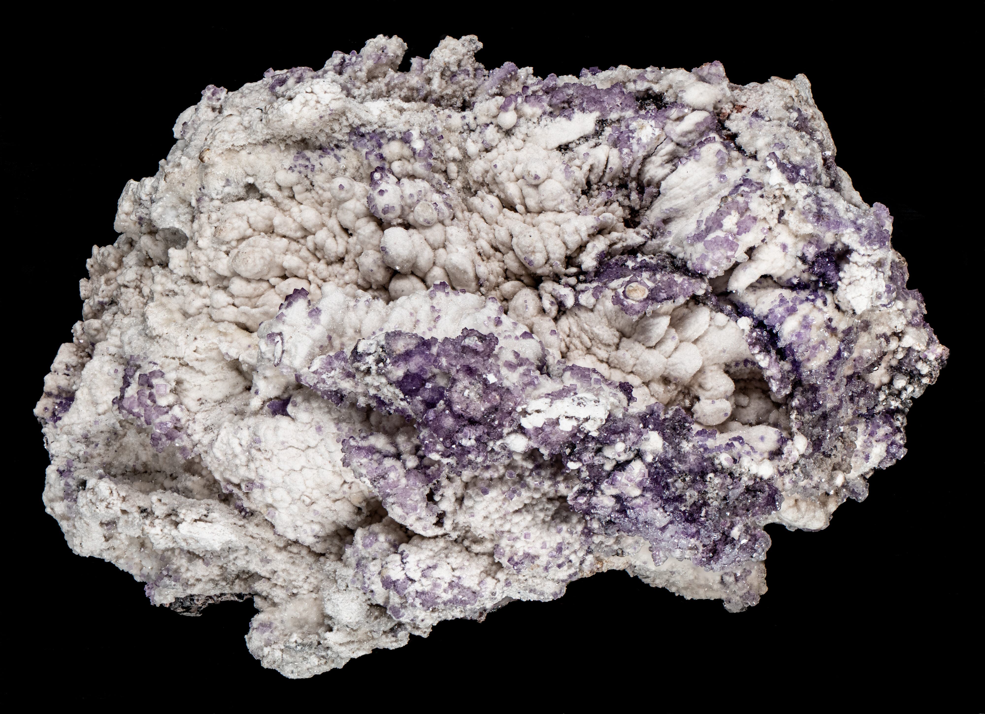 This is some new material recently recovered (2025) from the Santa Eulalia area, Chihuahua, Mexico. The specimen contains purple fluorite (CaF2) and hydrozincite (Zn5(CO3)2(OH)6). Hydrozincite is a secondary mineral formed from the alteration of other zinc bearing minerals such as sphalerite, hemimorphite, or smithsonite. It appears that the fluorite crystallized on the hydrozincite.