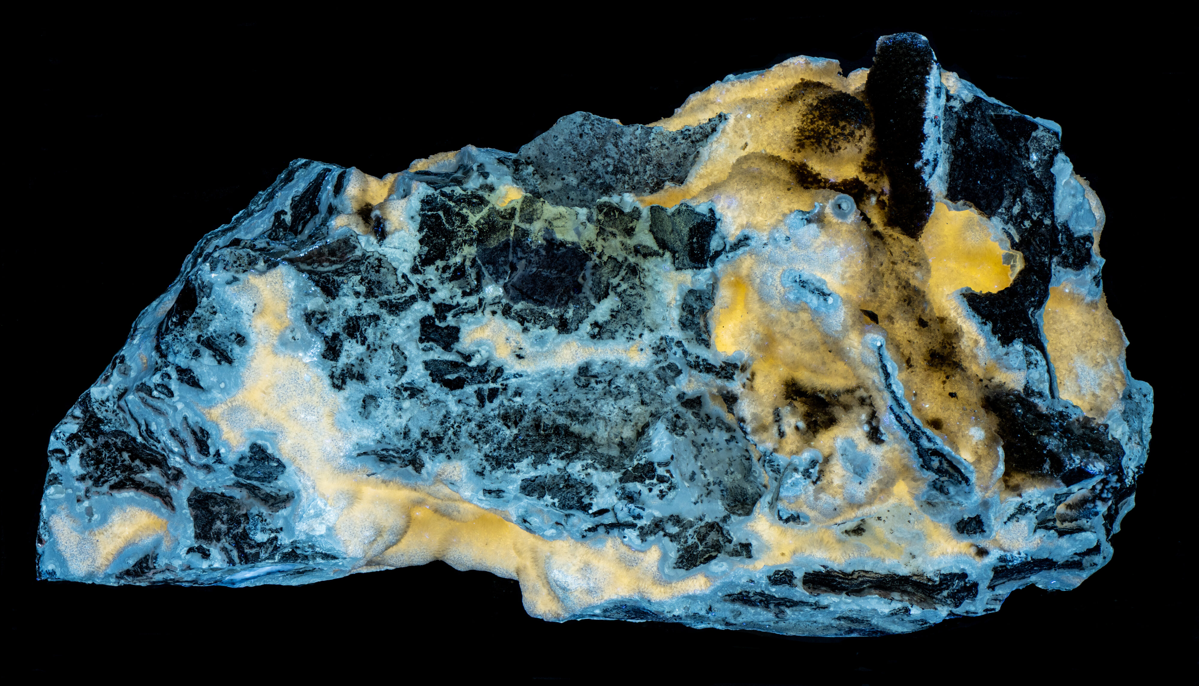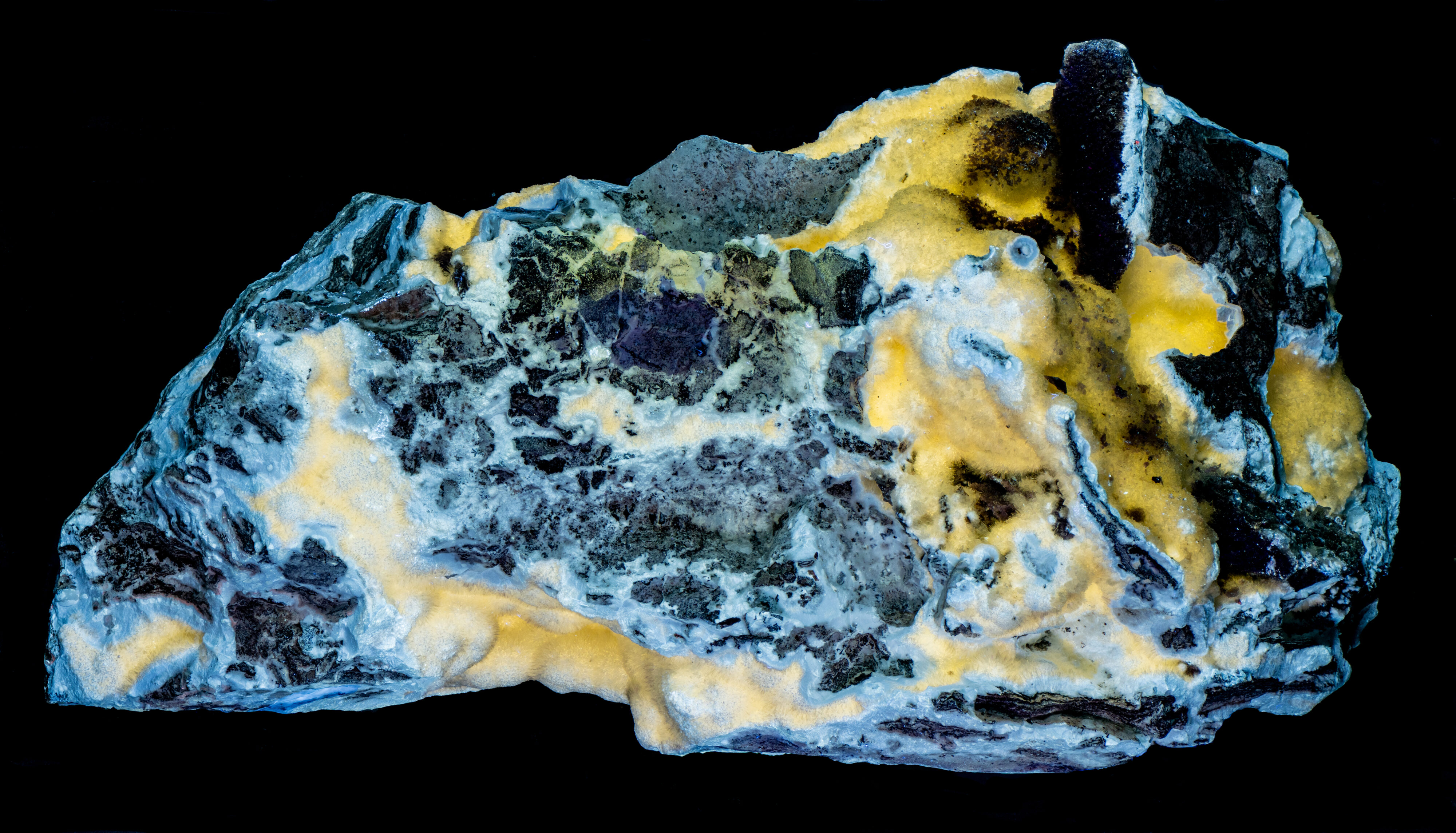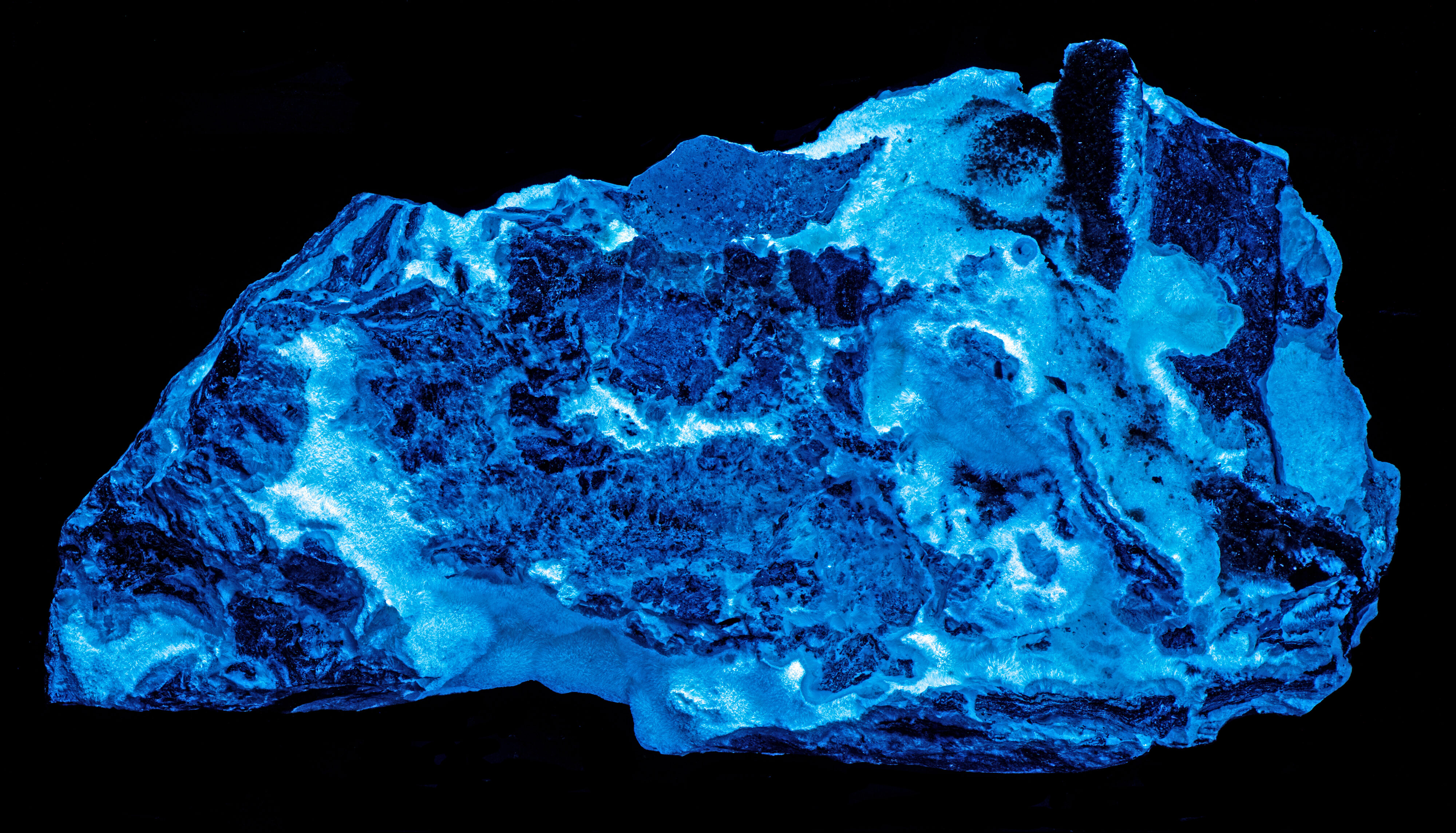 The hydrozincite fluoresces blue and yellow under longwave and midwave UV light. The yellow, fluorescent hydrozincite occurs in vugs of the carbonate matrix, and the blue, fluorescent hydrozincite occurs on the matrix. All hydrozincite fluorescence is bright light blue under shortwave light. The shortwave emission is slightly different for hydrozincite in the vugs compared to the hydrozincite on the matrix. Both types have an asymmetric broad peak. The matrix hydrozincite that is blue under all wavelengths has a maximum at 433 nm and a secondary maximum around 444 nm. The other hydrozincite type that fluoresces yellow (LW and MW) and blue (SW) has a maximum at 444 nm and the secondary peak around 433 nm. This shortwave fluorescence is activated by lead (Pb2+) replacing zinc.