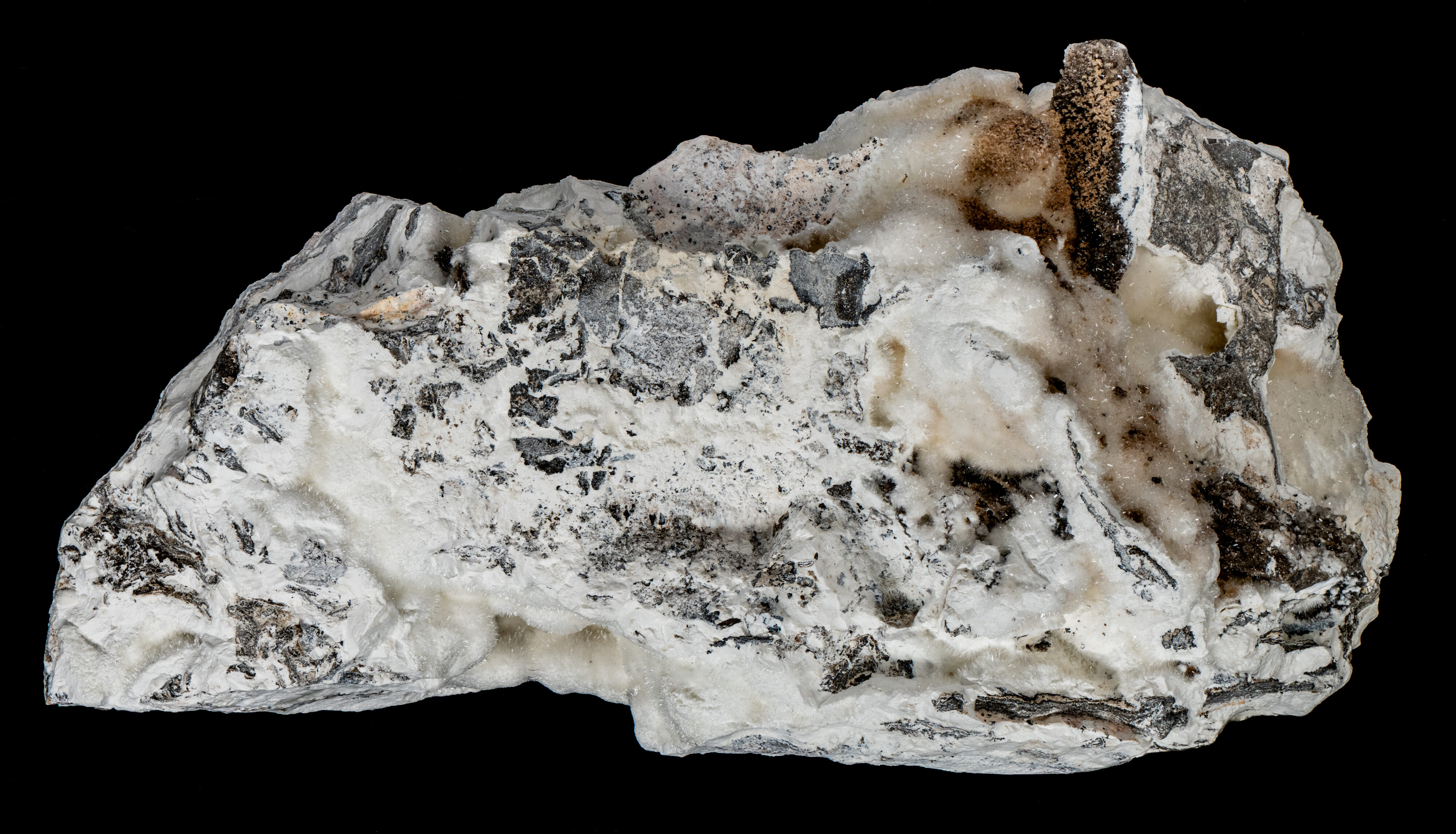 This is a hydrozincite (Zn5(CO3)2(OH)6) specimen from the Yellow Pine Mine, Goodsprings, Clark County, Nevada. Hydrozincite was the most abundant zinc mineral extracted from this mine. Hydrozincite, a secondary mineral, forms through the alteration of other zinc-bearing minerals such as sphalerite, hemimorphite, or smithsonite. The specimen has several vugs filled with small needles of hydrozincite crystals.