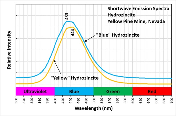 The longwave peak emission peak is at 554 nm for the yellow fluorescence of hydrozincite and the emission peak of the blue, fluorescent hydrozincite is at 447 nm. The cause of the yellow fluorescence is unidentified.