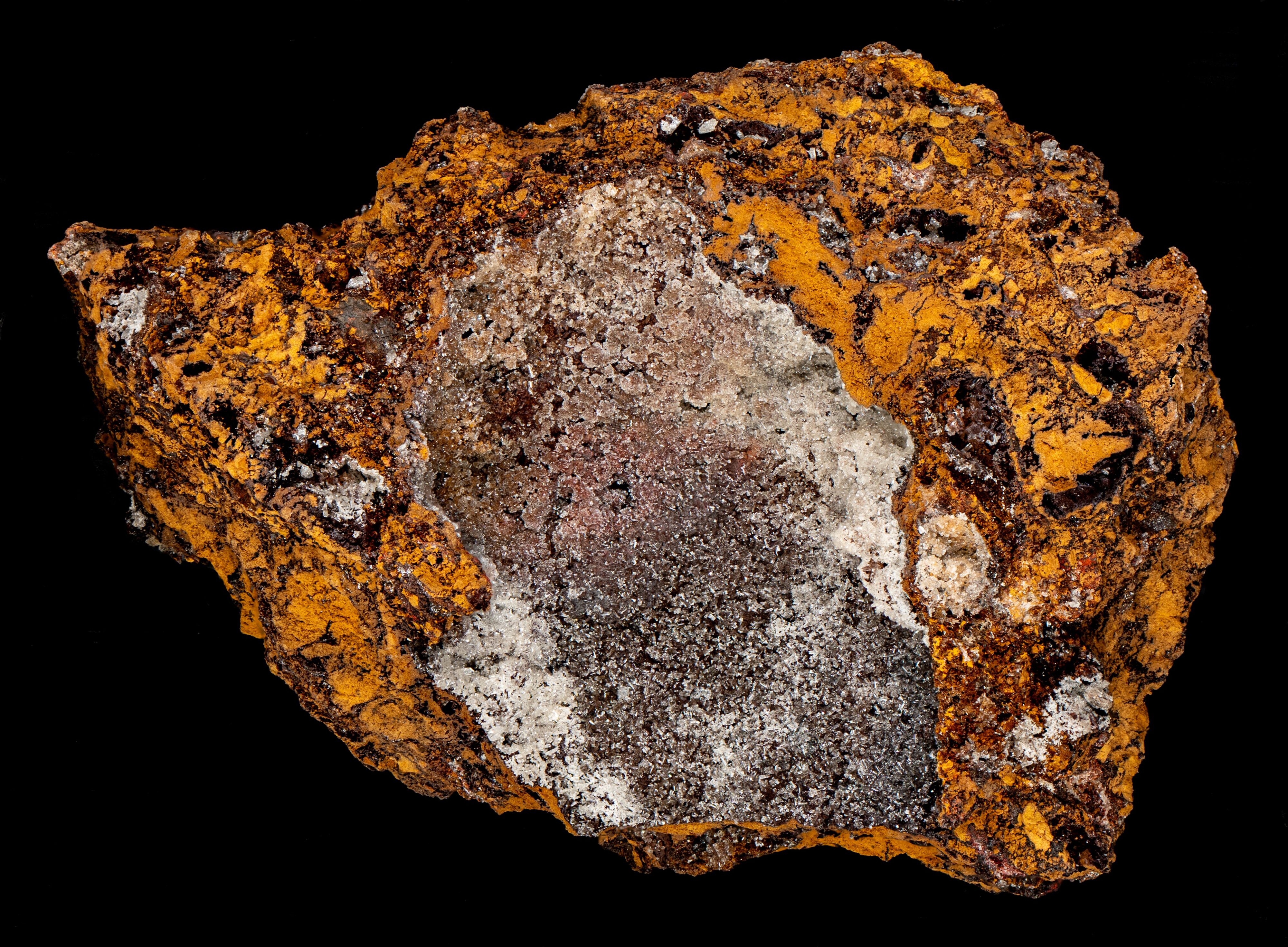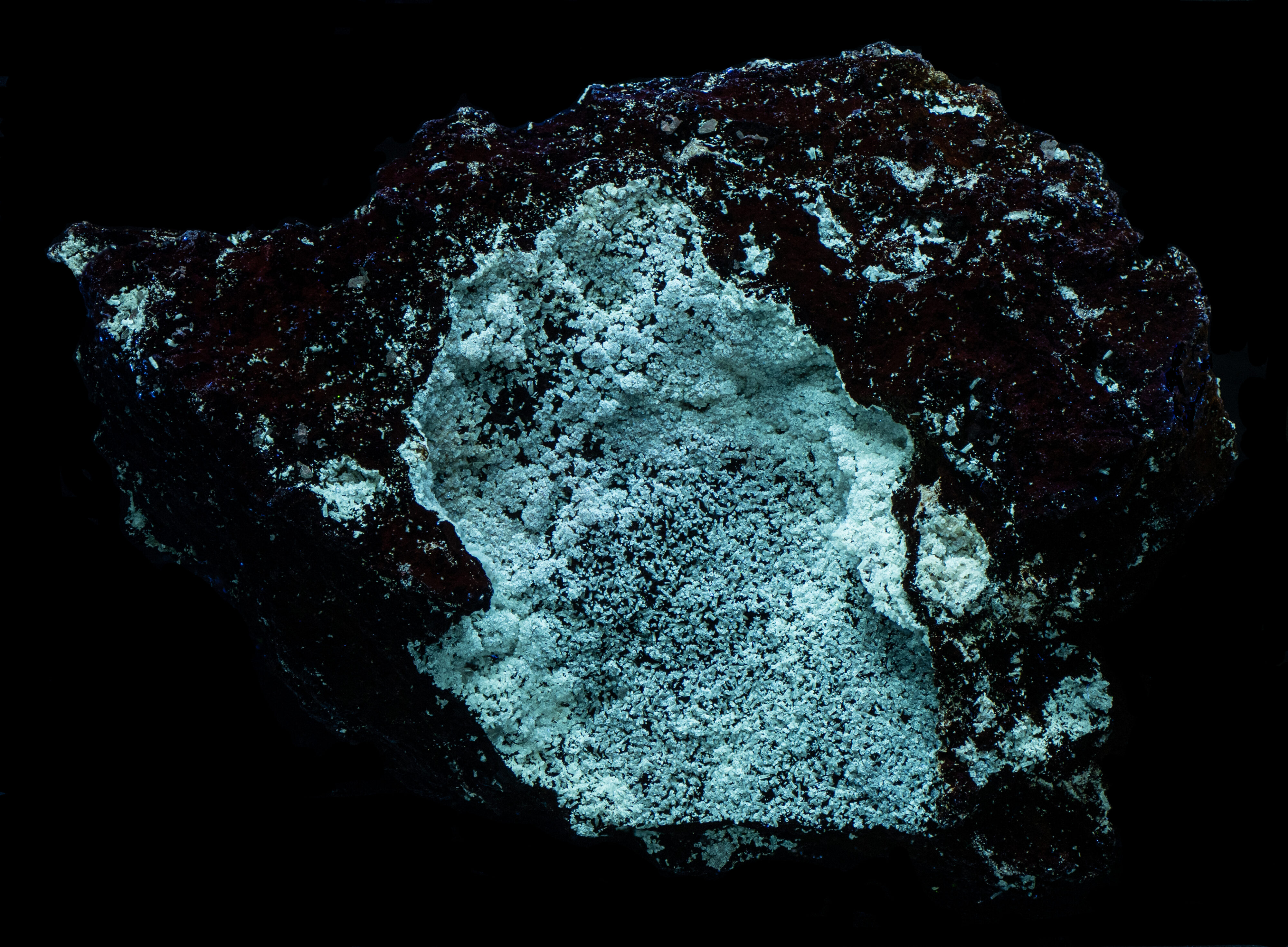 Willemite specimen from the Preguica Mine, Beja, Portugal. The specimen has a vug in limonite lined with willemite crystals. The willemite only fluoresces under shortwave UV illumination and it has very long-lasting afterglow. The blue-white color of the fluorescence is unusual for willemite which is typically green or has a greenish hue. The green fluorescence of willemite is activated by manganese replacing zinc. So, the lack of green fluorescence indicates that there is no manganese present in the specimen, and another activator is responsible for the blue-white fluorescence.