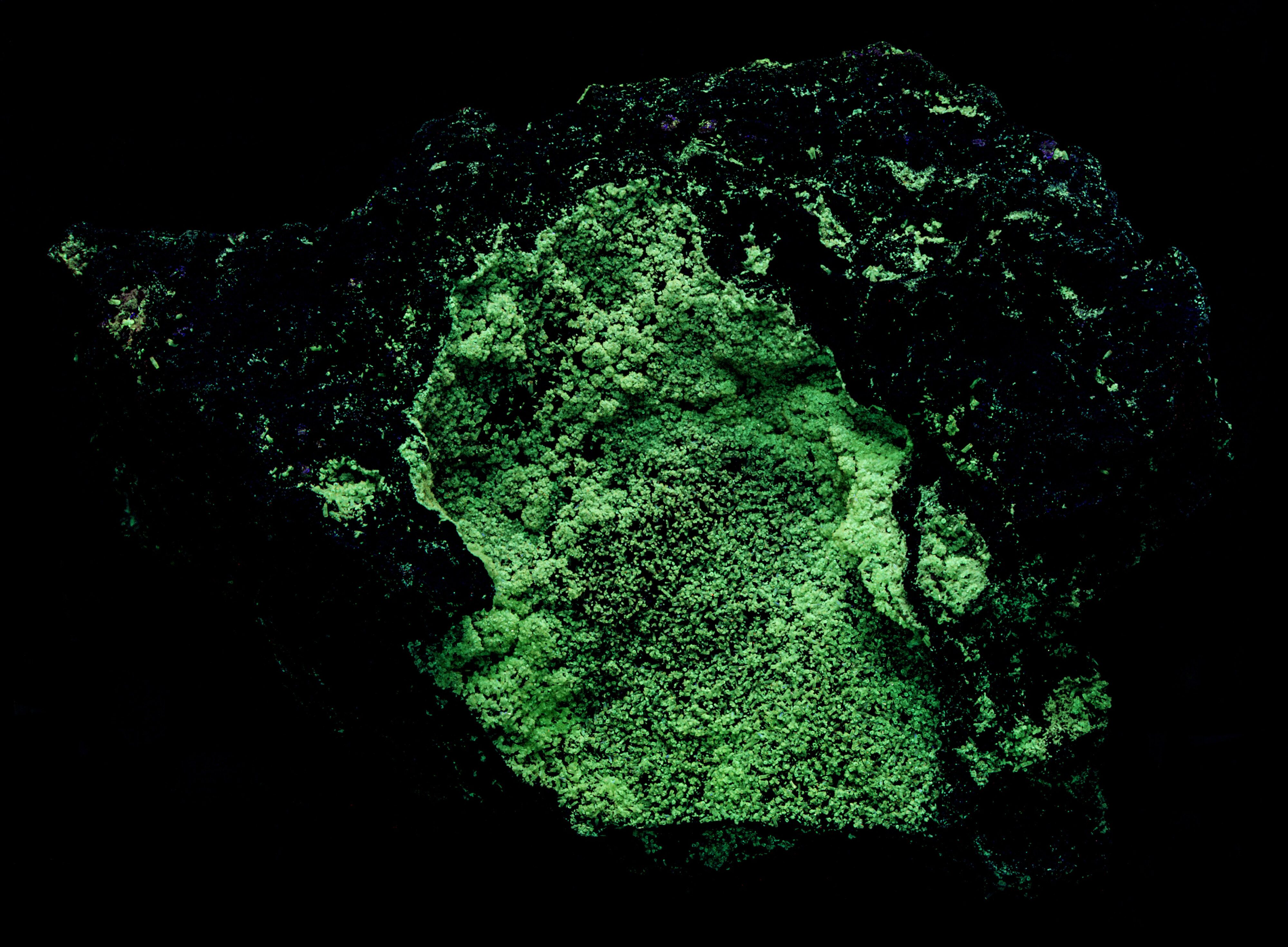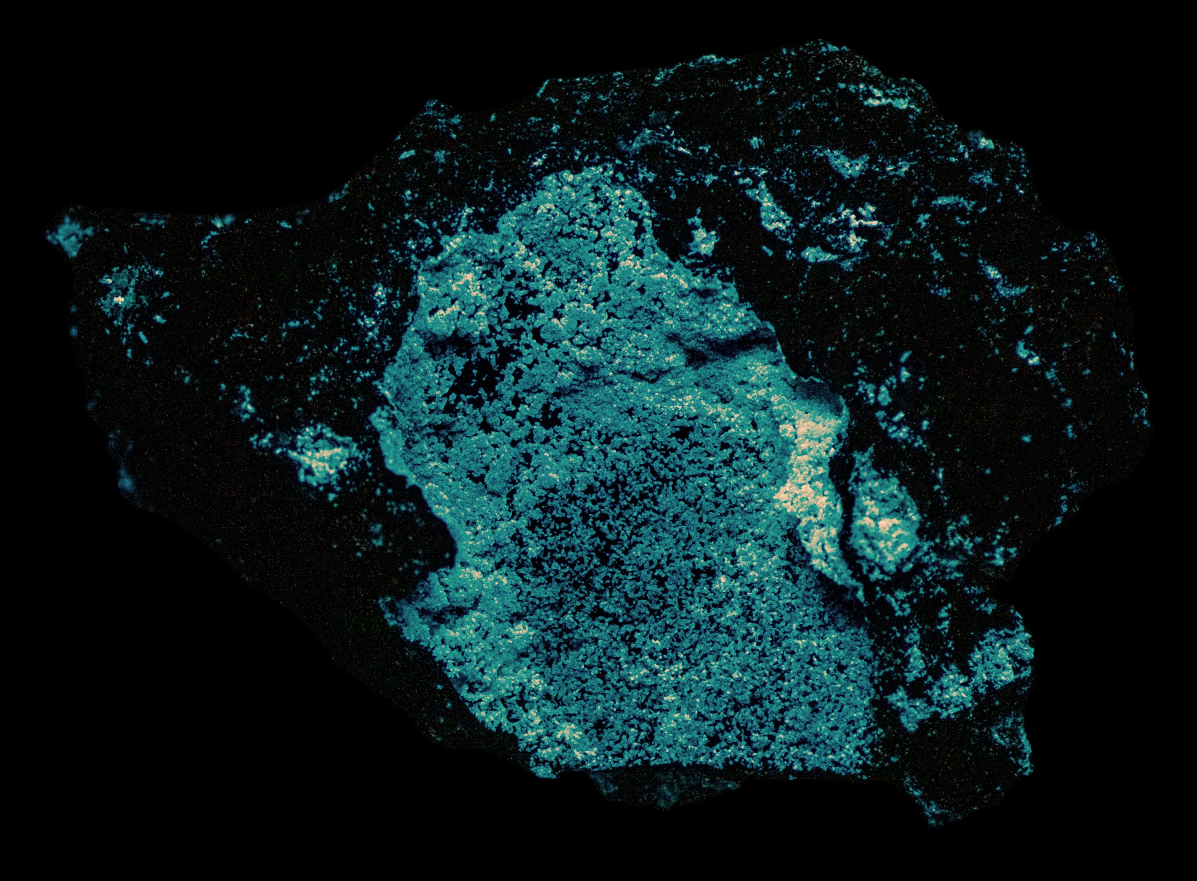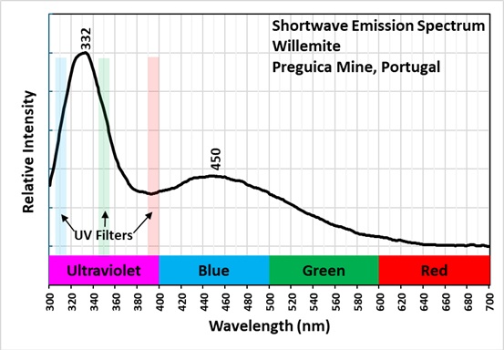 The emission spectrum plot also shows the location of three narrow bandpass filters used to create the false color image of ultraviolet fluorescence. The emission peak falls between the 310 nm and 350 nm filters. The color of the willemite’s ultraviolet fluorescence is a combination of blue assigned to the 310 nm bandpass image and green assigned to the 350 nm bandpass image.