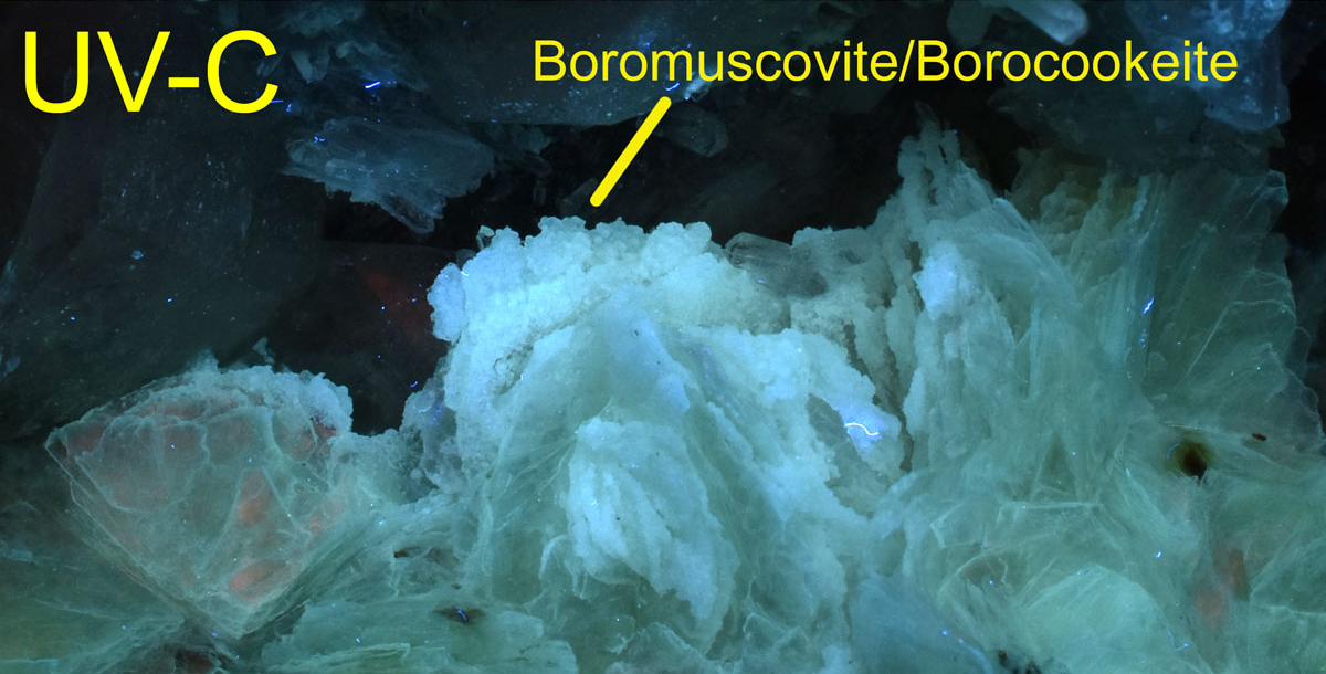 Three unfrequent minerals from the Sosedka pegmatite, Malkhan, Zabaykalsky, Russia. Malkhan is known for its beautiful red tourmalines. But it is also produces polylithionite. It is accompanied by a powdery mass of boromuscovite and borocookeite. Boron replaces here the aluminium in the silicate lattice. UV-C @275 nm