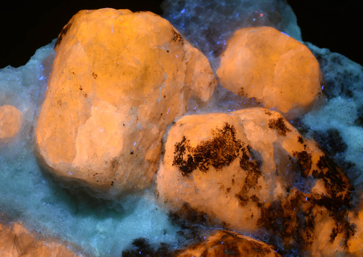 A typical blue mineral from the Koksha valley, Badakhshan, Afghanistan with a typical orange fluorescence. Usually this is hauyne. But in this case, the emission spectrum, the EDX analysis and Raman tells us that it is afghanite. The crystal however looks like a distorted dodecahedron. Many other examples exist of these disguised afghanites. The crystal structure of afghanite allows for distorted dodecahedron like crystals.