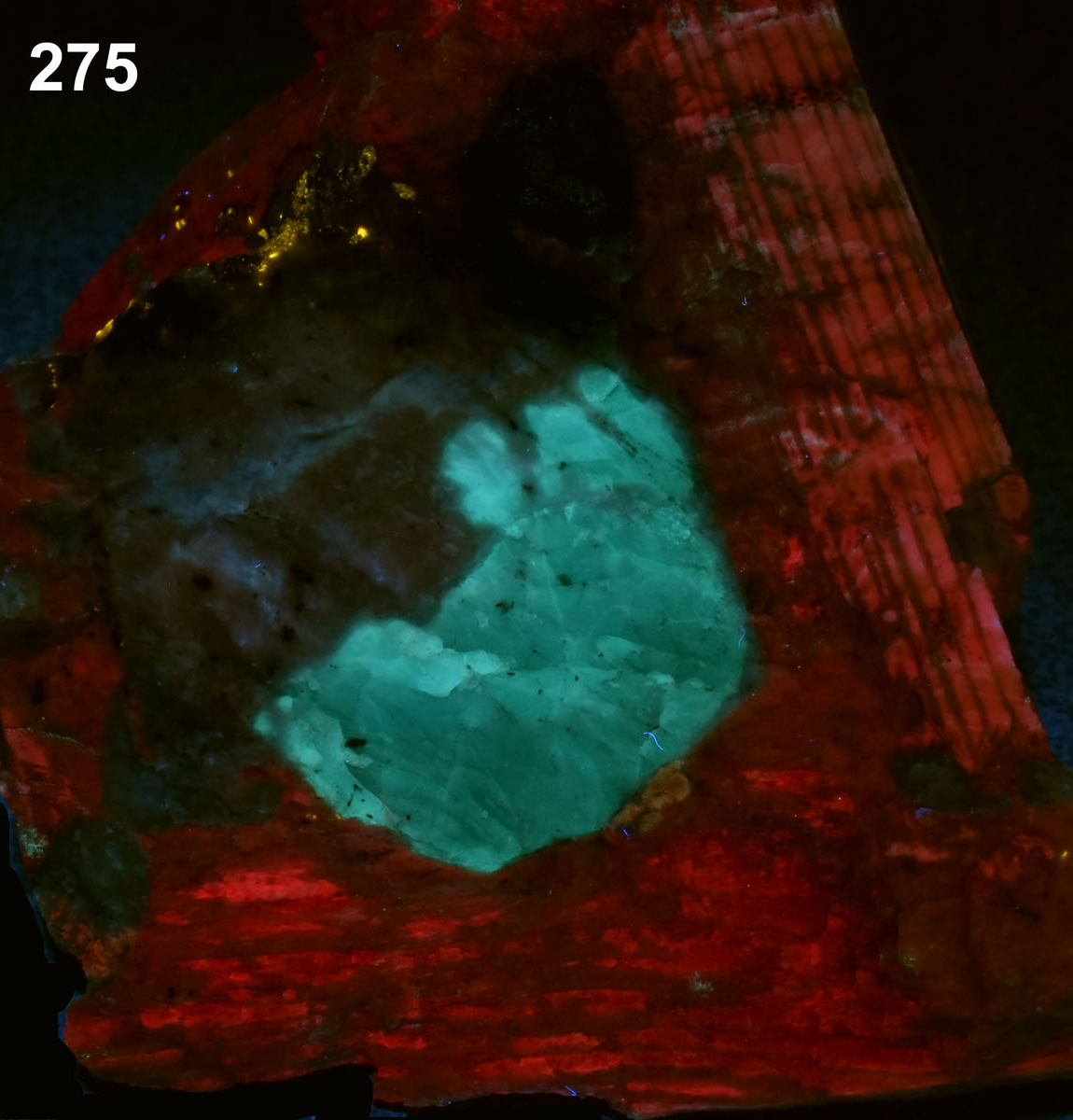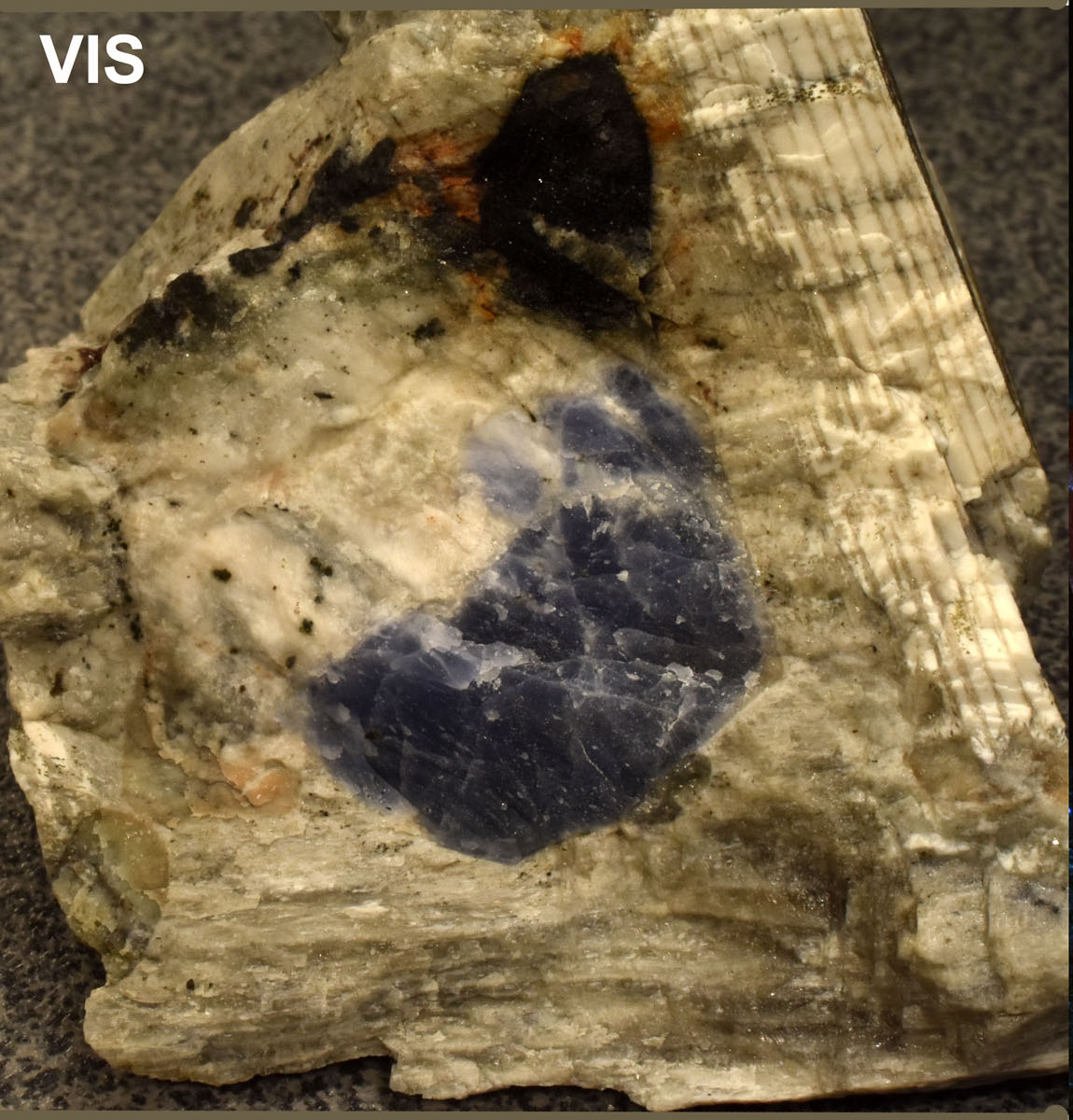 Sodalite and albite, Sagåsen Quarry, Auenlandet, Porsgrunn, Vestfold og Telemark, Norway. Bluish green fluorescence of the sodalite @275 nm. The albite present shows a nice albite twinning (lamellae at the right and bottom).