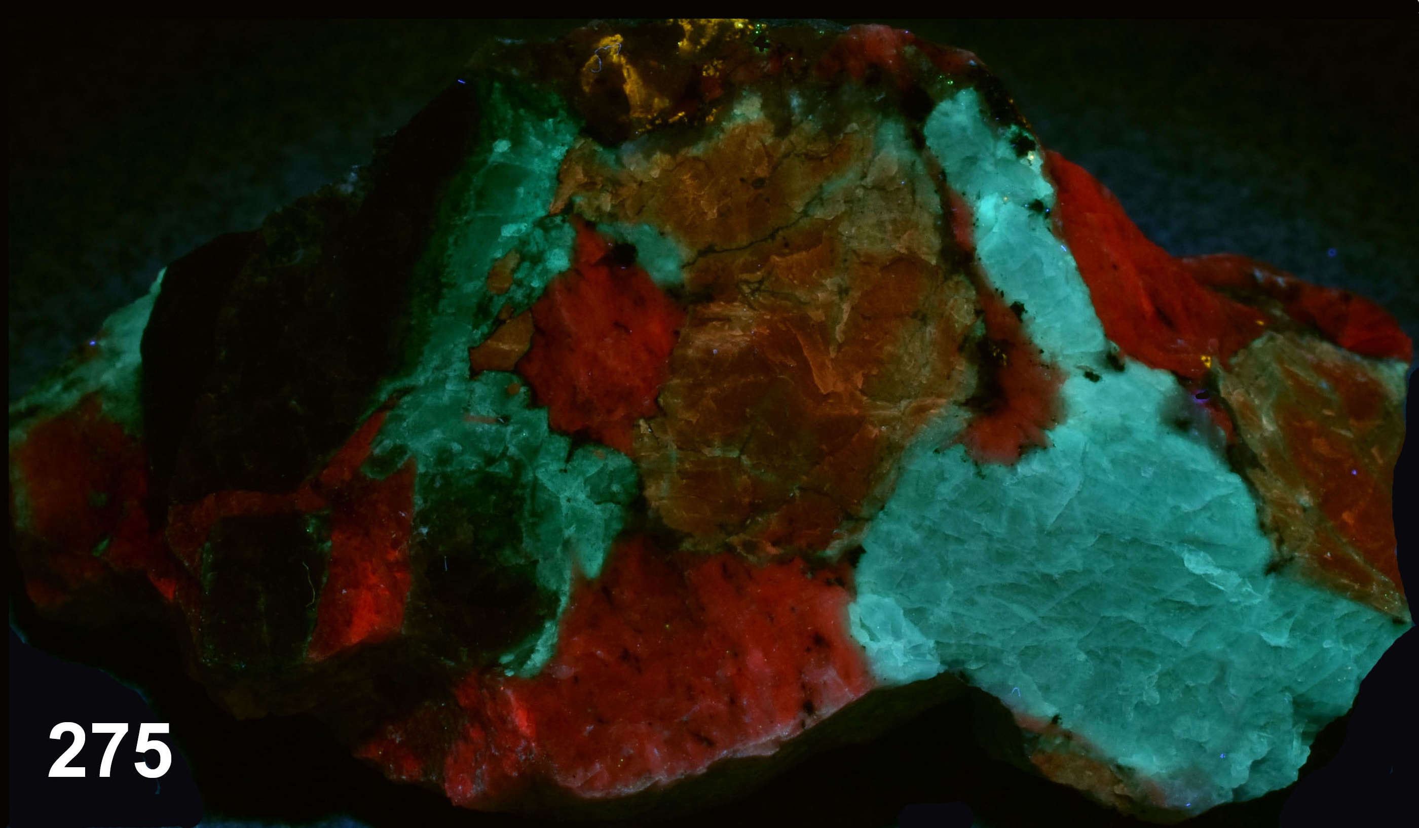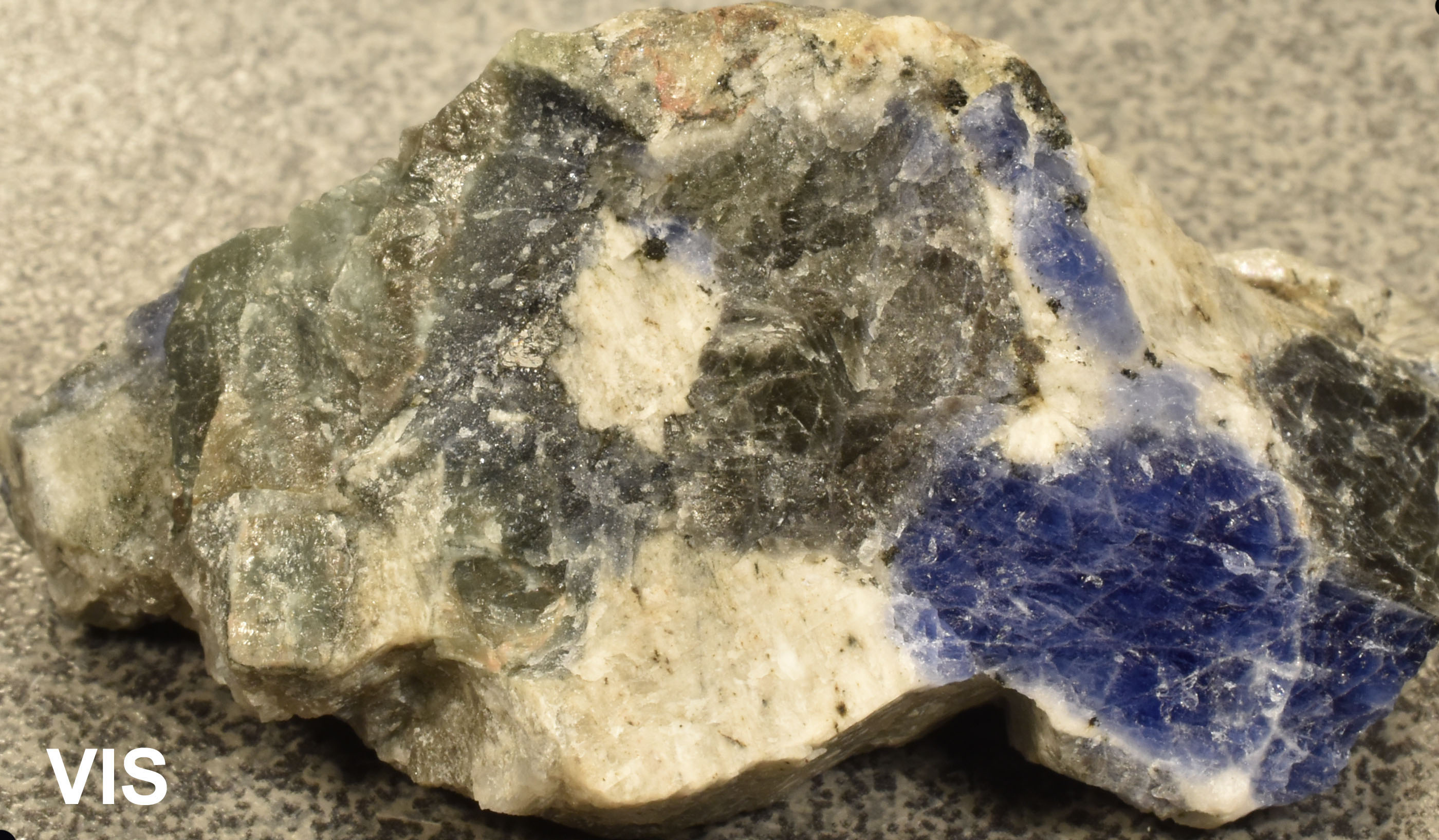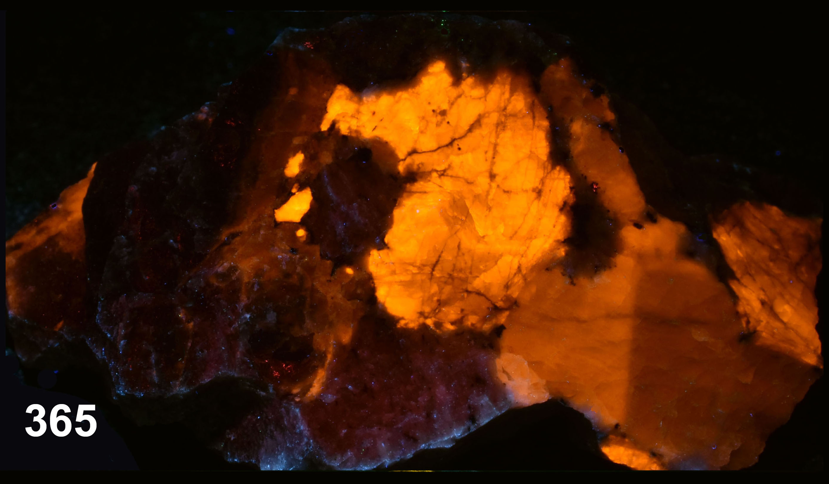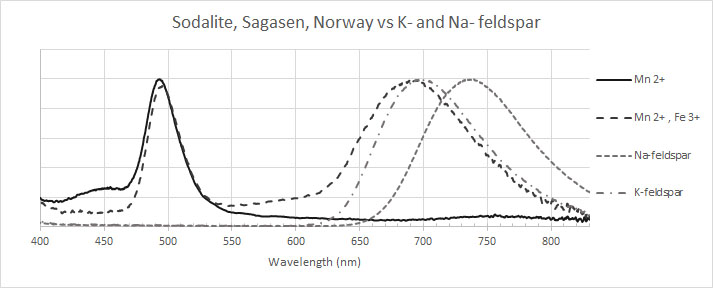 Sodaliet and albite, Sagåsen Quarry, Auenlandet, Porsgrunn, Vestfold og Telemark, Norway. The piece has sodalite in a blue and a grey colour. The blue part has a nice blueish green fluorescence due to Mn2+ (spectrum peak around 490 nm @ 275 nm excitation). The grey part is more orangish because there is also a red contribution from Fe3+ (spectrum peak around 690 nm @ 275 nm excitation). As a comparison also the red Fe3+ emissions from feldspar are shown. The grey sodalite has a stronger orange S2- fluorescence due to the presence of trivalent iron (Agamah (2020)). The red fluorescence in the UV-C is from trivalent iron in albite. Spectra are preferrably taken at 275 nm because those LEDs have less ghost emissions in the UV-A and visible, but 255 nm gives the same image result.