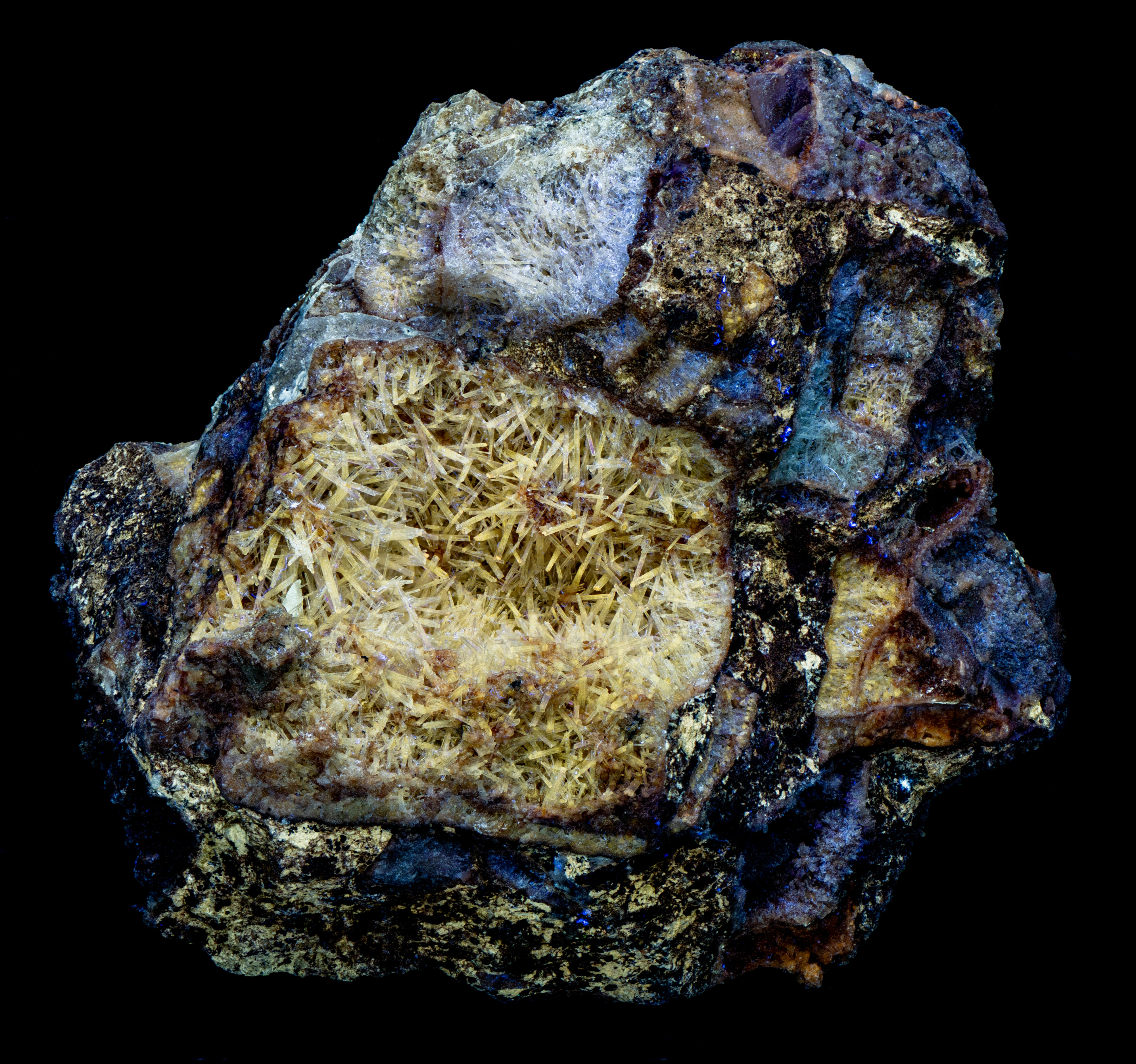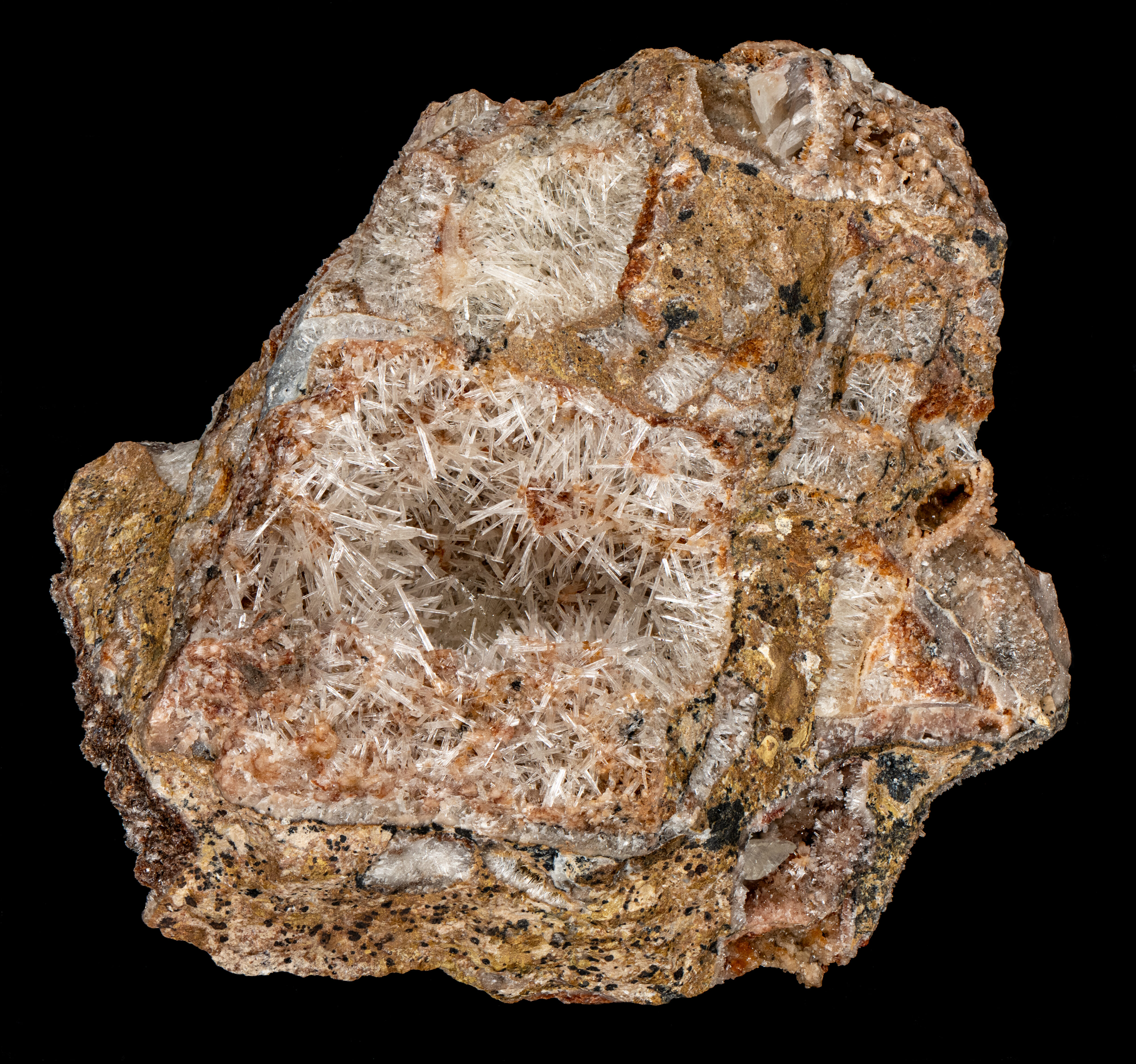 A willemite specimen from Berg Aukas Mine, Namibia. The willemite is a secondary mineral formed from sphalerite and other zinc minerals. The colorless, acicular willemite crystals precipitated in a vug of dolomite. The dolomite was deposited in the Late Precambrian and it is part of the Gauss Formation. The original mineralization occurred in the Late Precambrian to Cambrian on paleo-highs of karst breccias. The secondary willemite in this specimen formed more recently in the Quaternary period. The crystals are highly striated parallel to the c-axis and they have a flat termination. The crystals are up to 6 mm long.