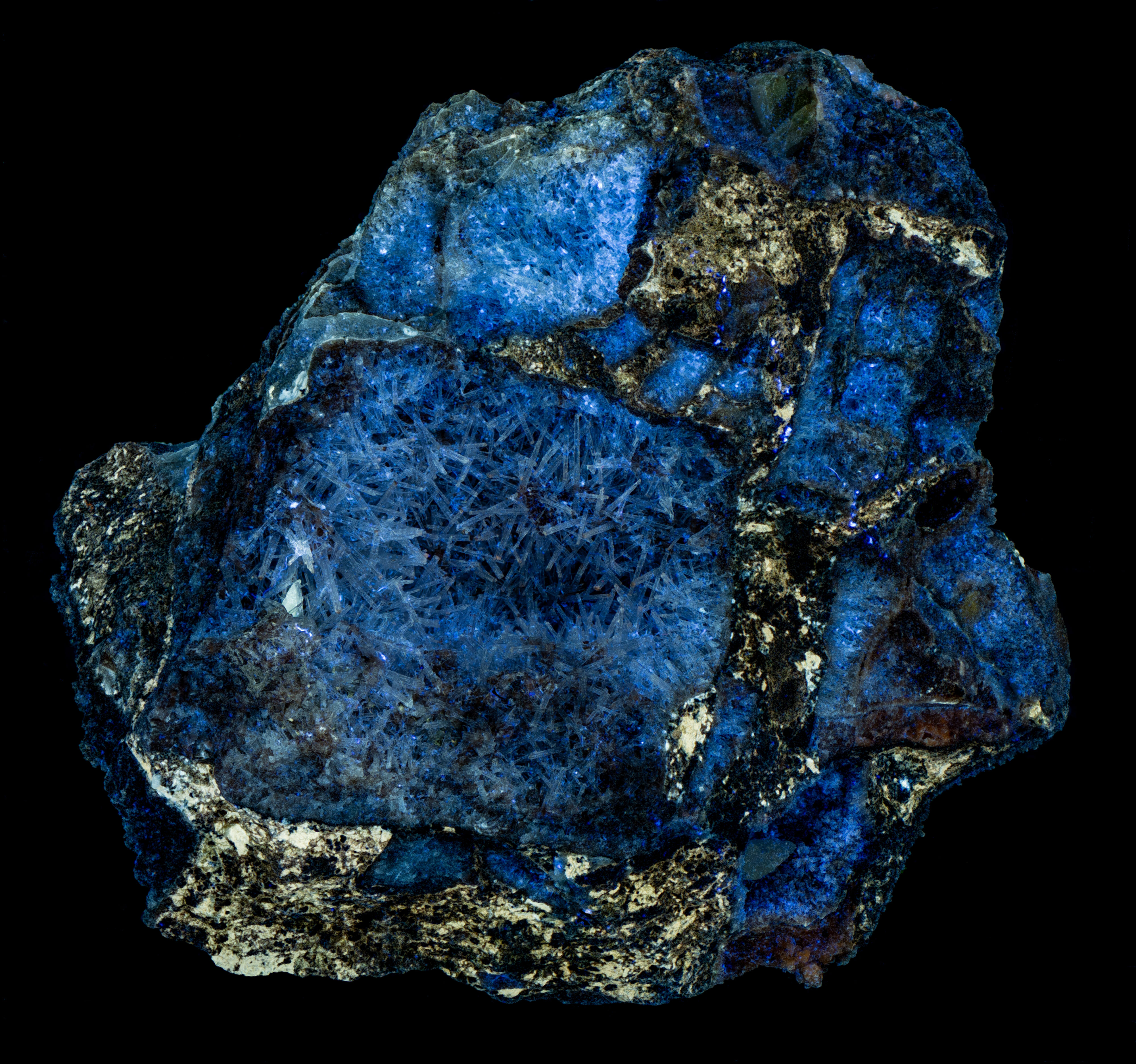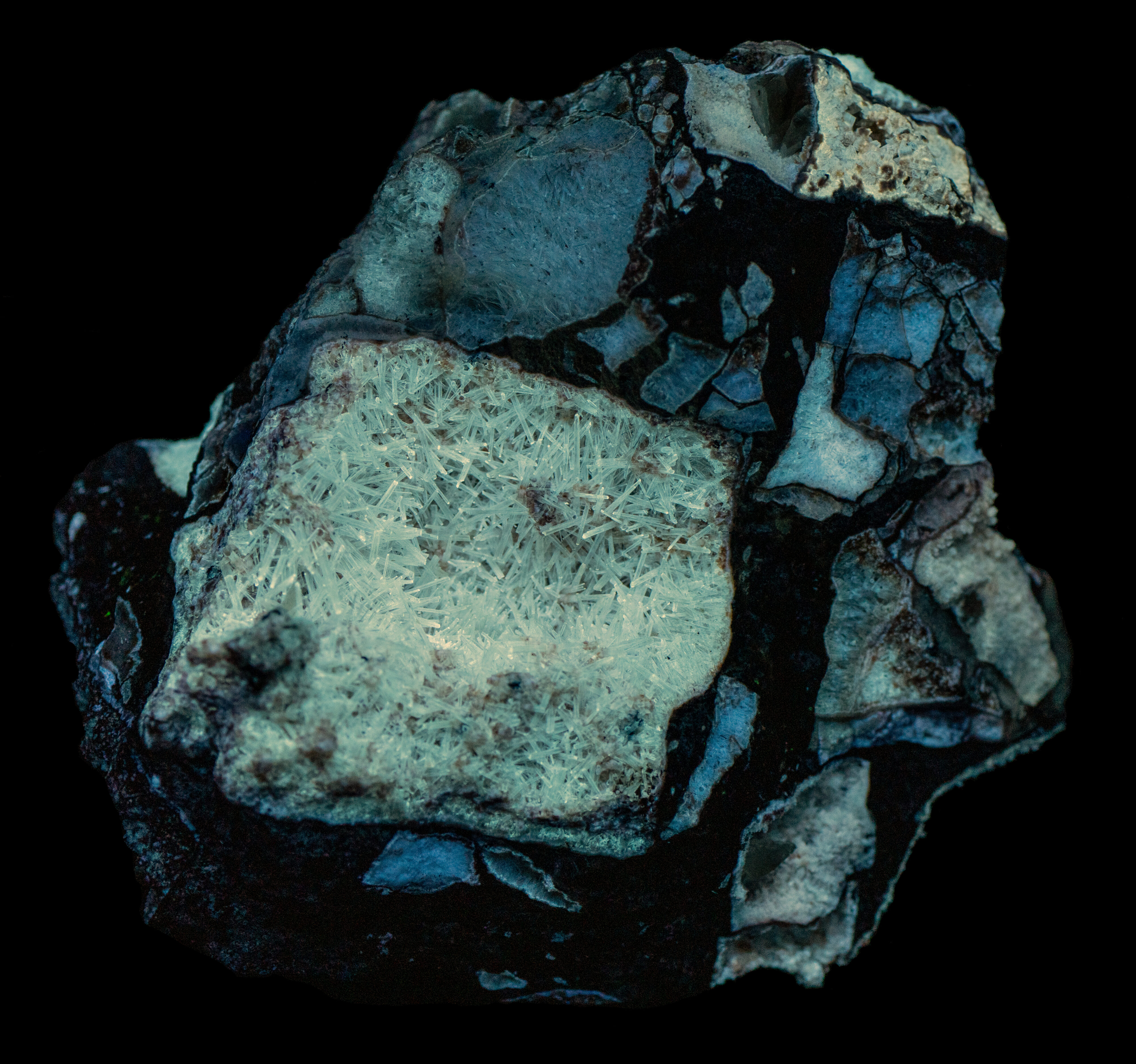 The willemite has bluish white fluorescence under shortwave light, yellowish white under midwave light and blue fluorescence under longwave light. The willemite fluorescence from Berg Aukas is variable and a lot of it is non-fluorescent. This specimen also has long-lasting afterglow from exposure to both midwave and shortwave light. The afterglow is white to blue-white color.