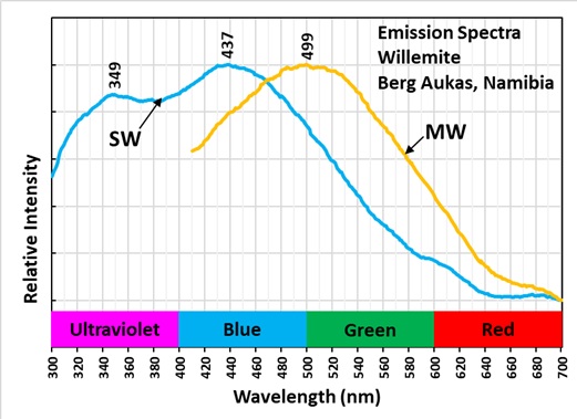 Willemite fluorescence is often green due to manganese activation. The emission spectra of this specimen shows no evidence of manganese activation. The fluorescence may be activated by lead (Pb2+) replacing zinc or structural defects. The shortwave emission spectrum has two broad peaks at 349 nm and 437 nm. The midwave emission is shifted toward longer wavelengths. Its yellow fluorescence has a peak at 499 nm.