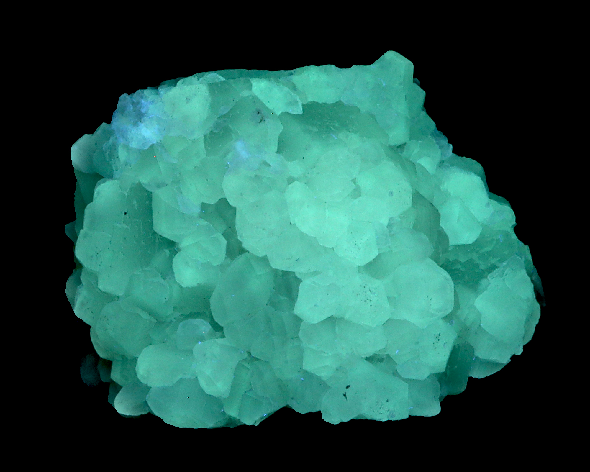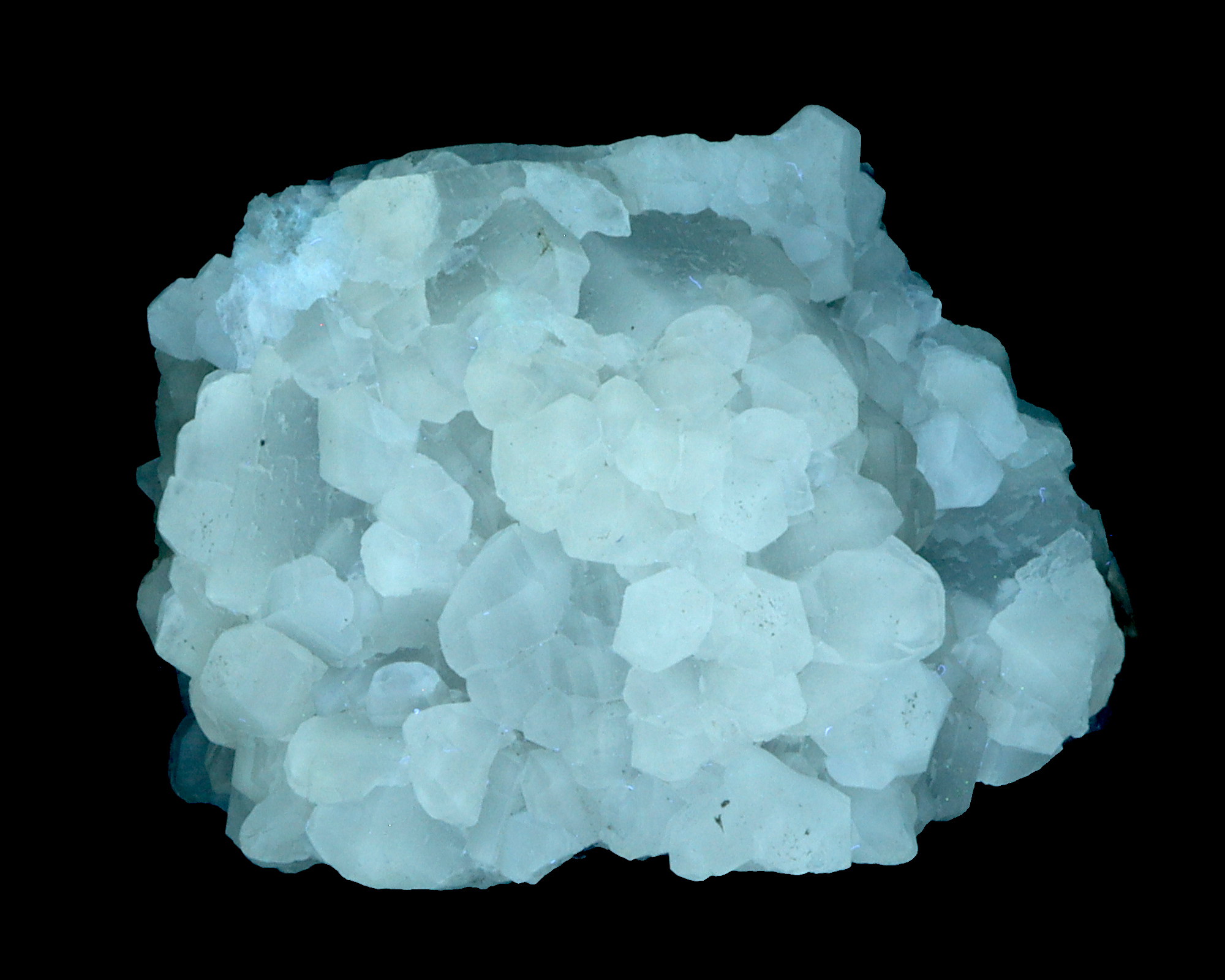 An aggregate of small witherite crystals. Fluorescent bluish white, greenish, and white under short, mid, and long wave UV light, respectively. After exposure to UV light it shows a nice greenish afterglow.