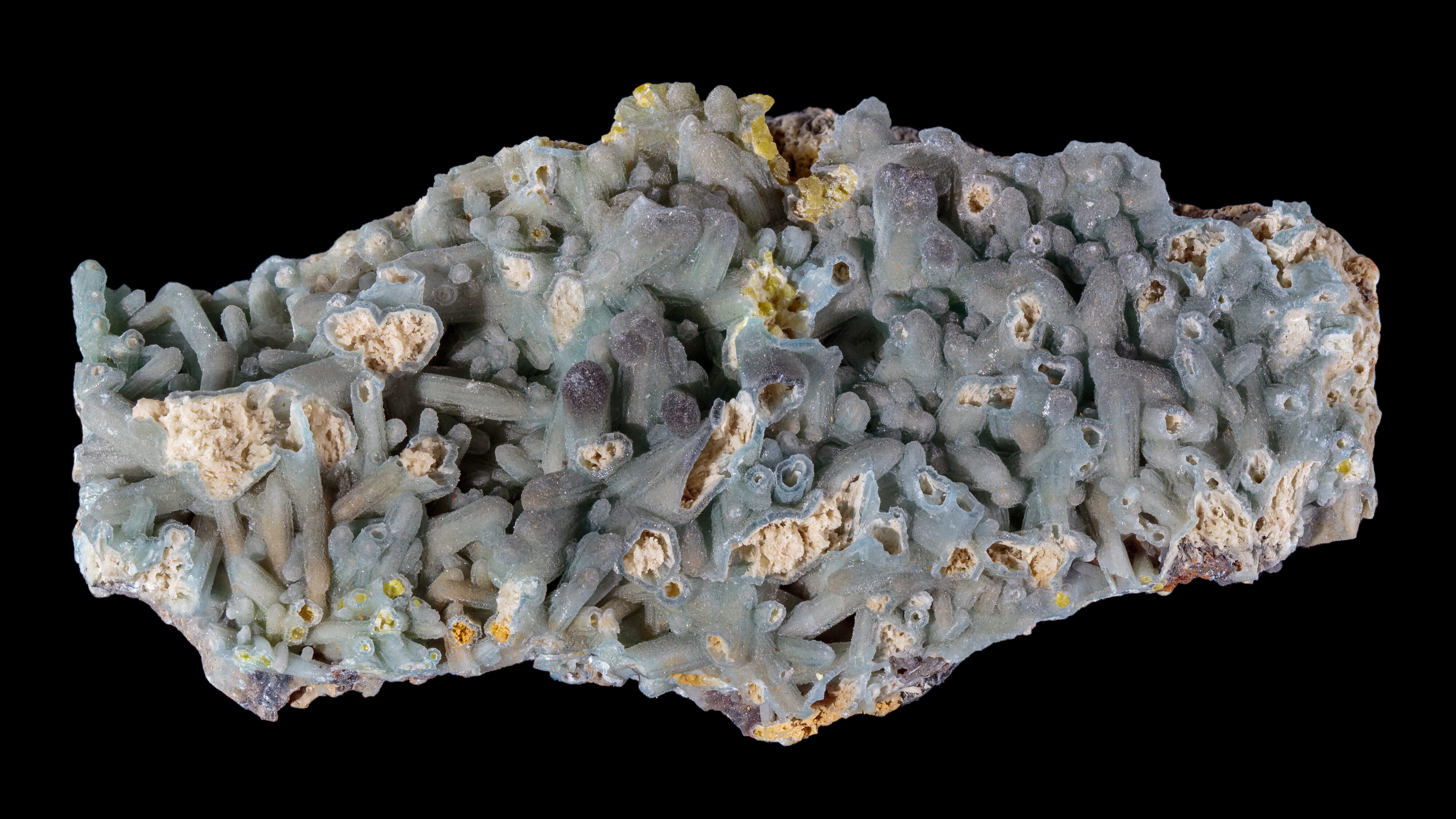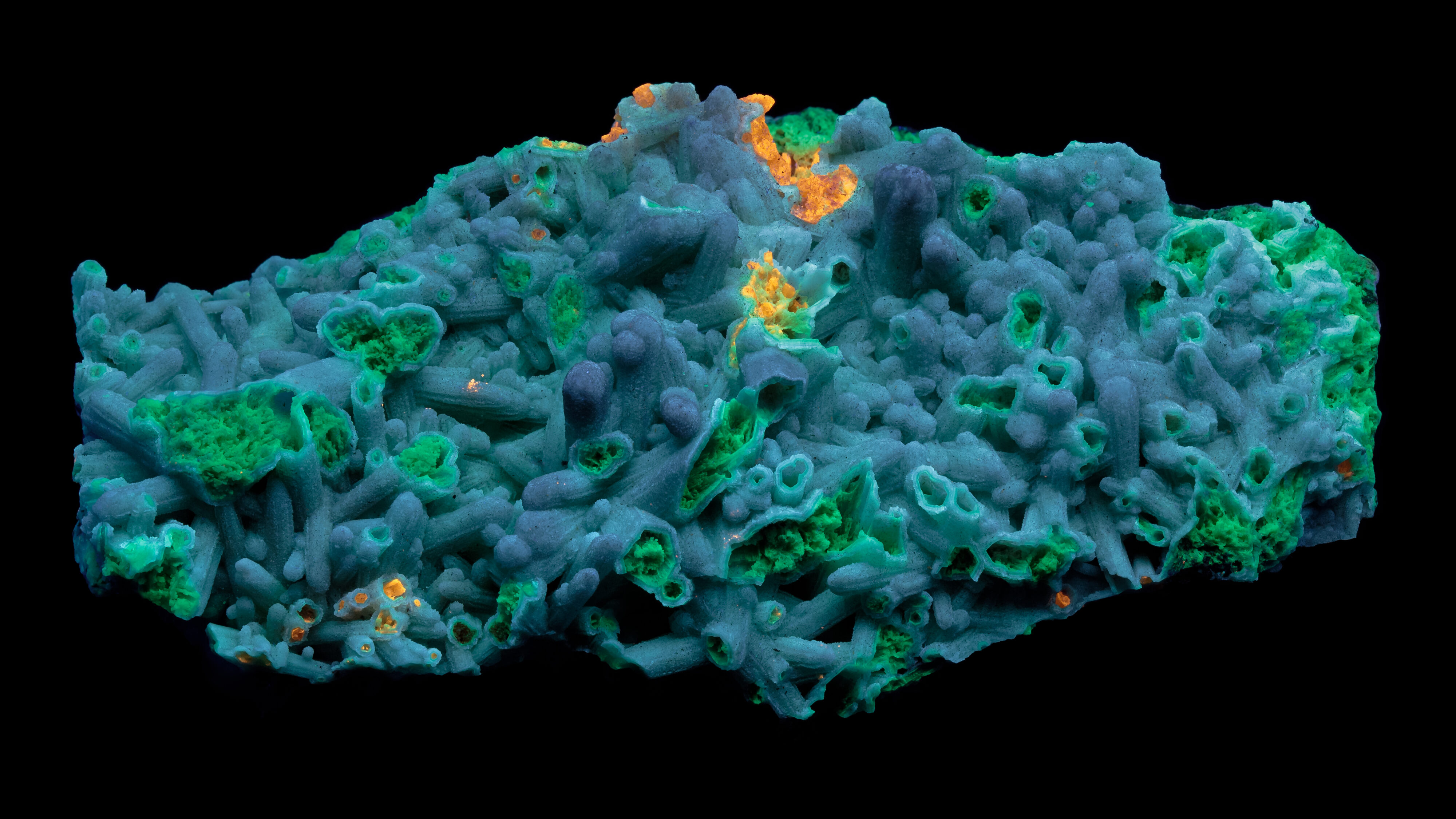 Delicate casts of light blue triangular plumbogummite crystals growing over/after decayed hexagonal green pyromorphite crystals, a few of which still remain. Under MW the outer plumbogummite fluoresces blue, the inner white material fluoresces green, and the pyromorphite yellow orange.