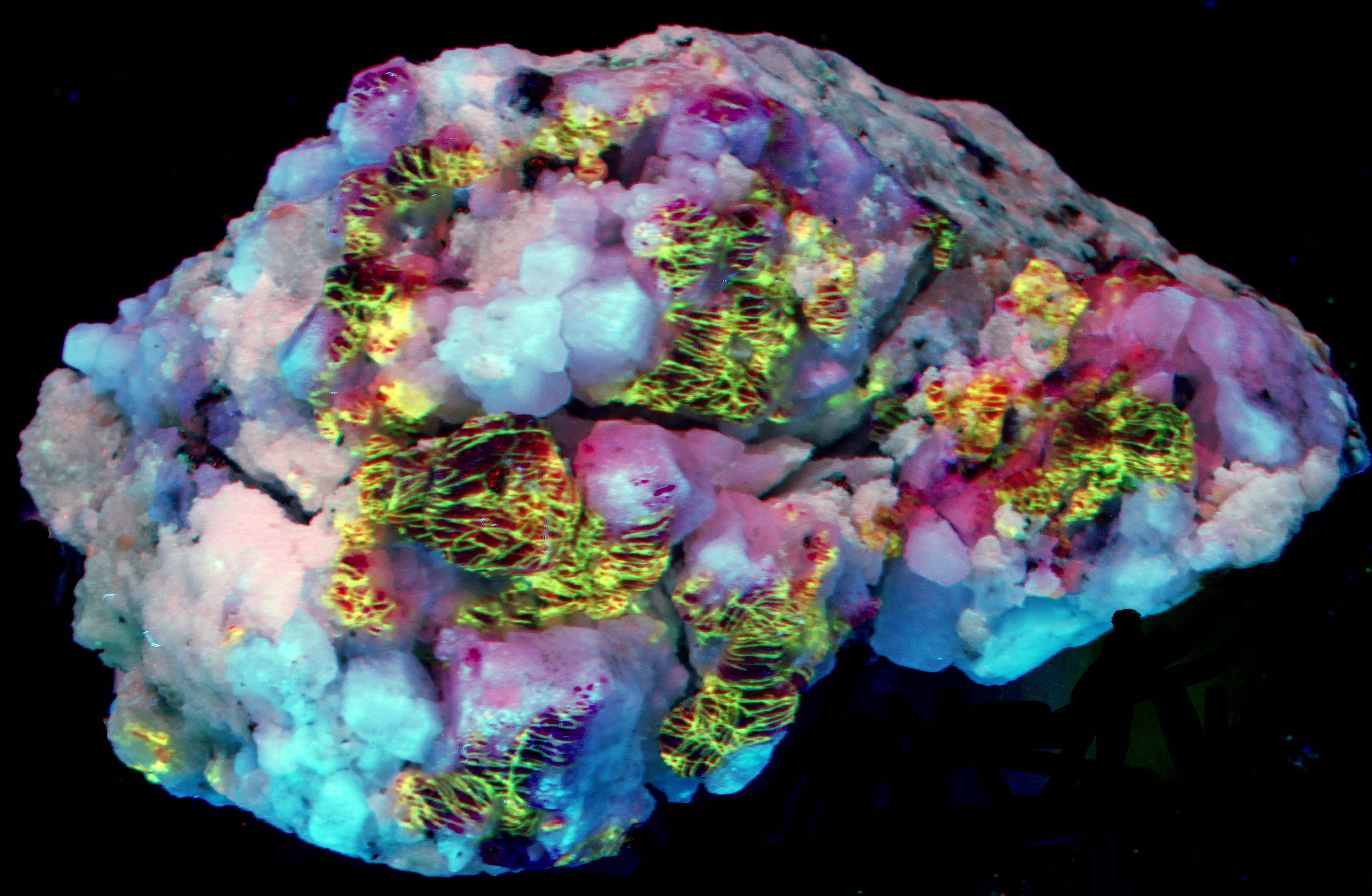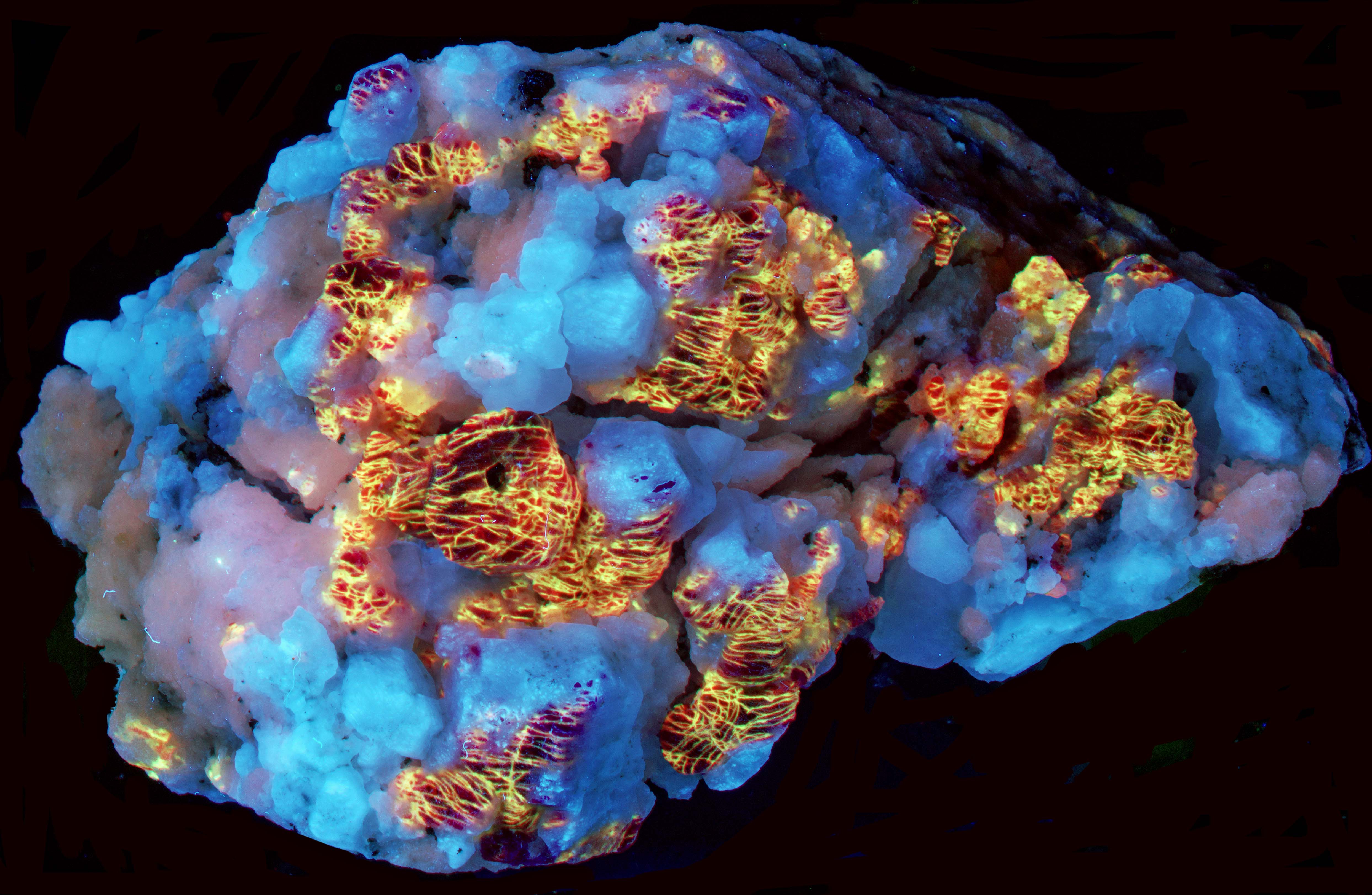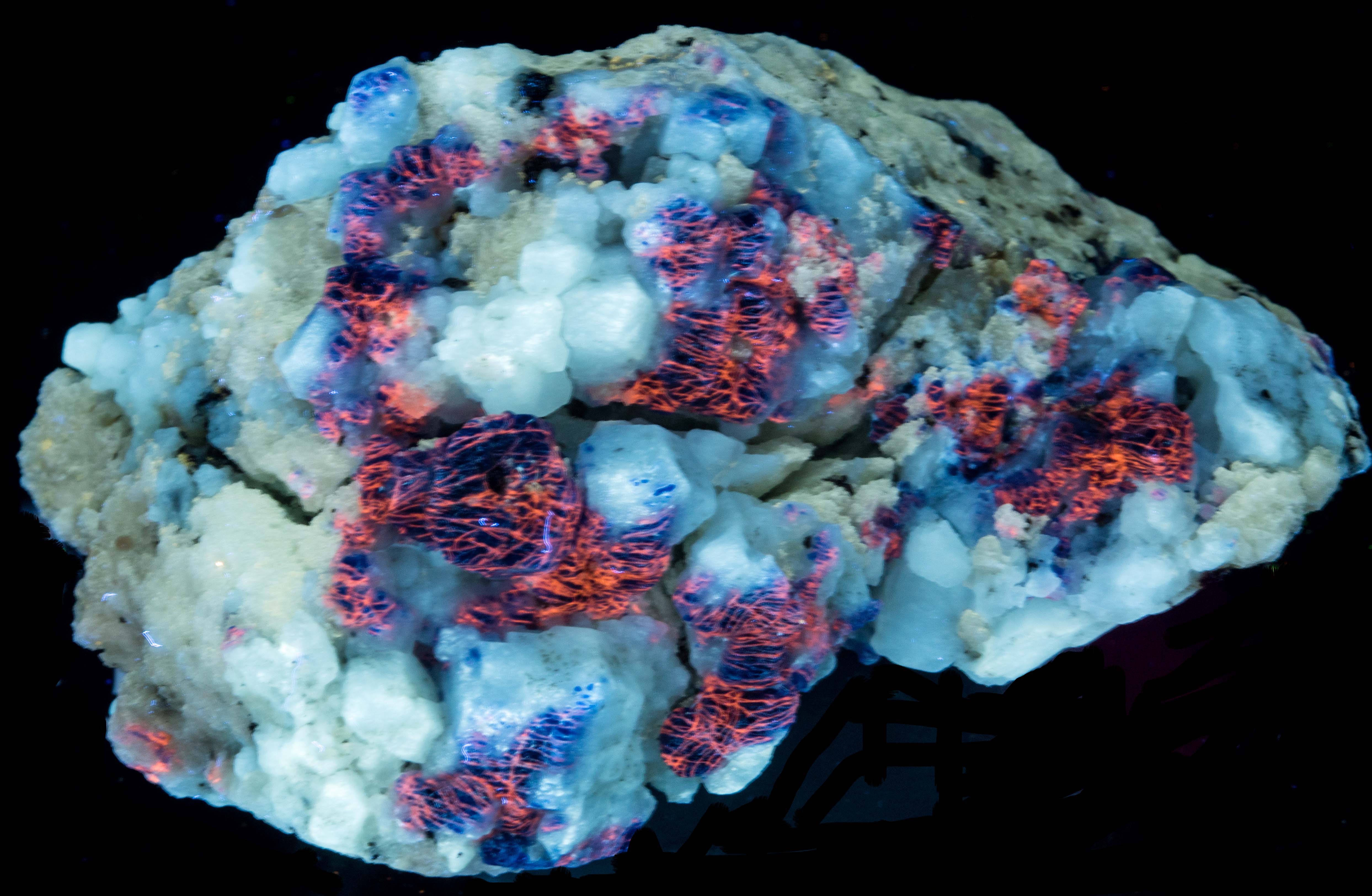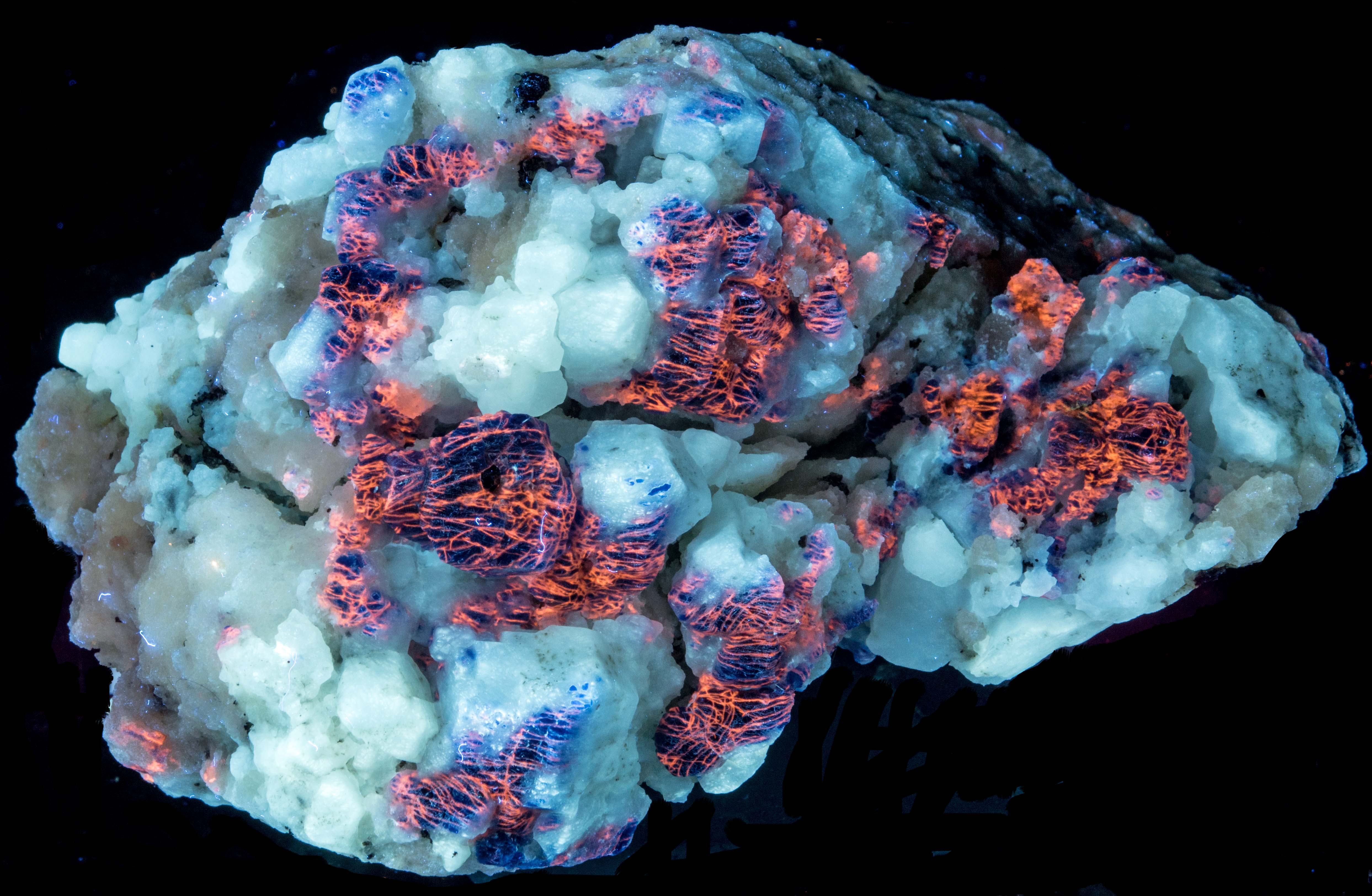 This specimen originates from Sar-e-Sang in Badakhshan Province, Afghanistan, and features three fluorescent minerals: gonnardite ((Na,Ca)2(Si,Al)5O10·3H2O), diopside (CaMgSi2O6), and hauyne ((Na,K)3(Ca,Na)(Al3Si3O12)(SO4,S,Cl)). Identification of gonnardite and diopside was confirmed through XRD analysis. While most blue hauyne crystals lack fluorescence, they contain veinlets that glow orange under UV light. The mechanism behind these veinlets is uncertain; it could be related to crystal formation processes, where fracturing and rapid shifts in pressure and temperature altered the chemistry or lattice structure of hauyne as it precipitated.