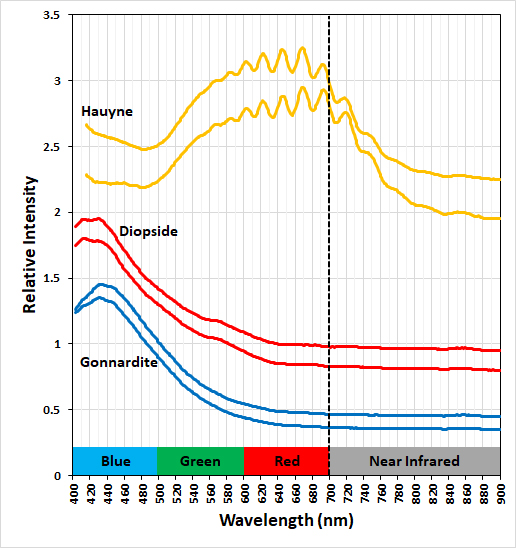 The third image depicts the emission spectra of all three minerals. Hauyne’s spectrum shows multiple peaks attributed to the di-sulfide activator, while titanium likely triggers diopside’s fluorescence. The activator responsible for gonnardite’s fluorescence remains unidentified.