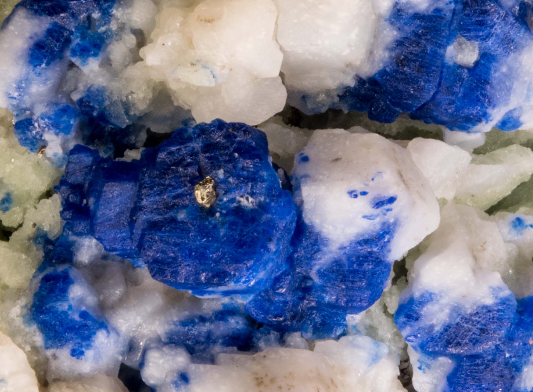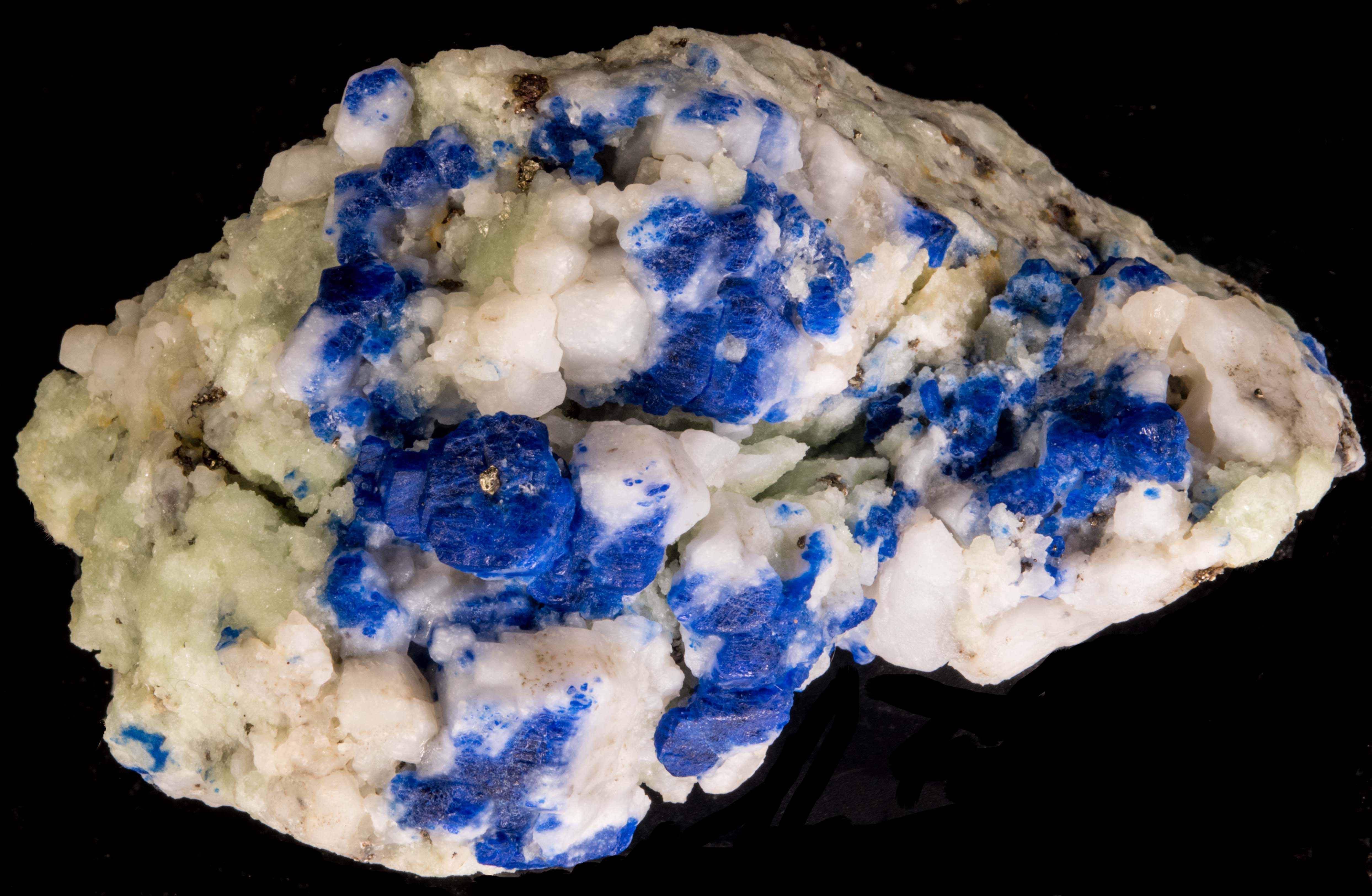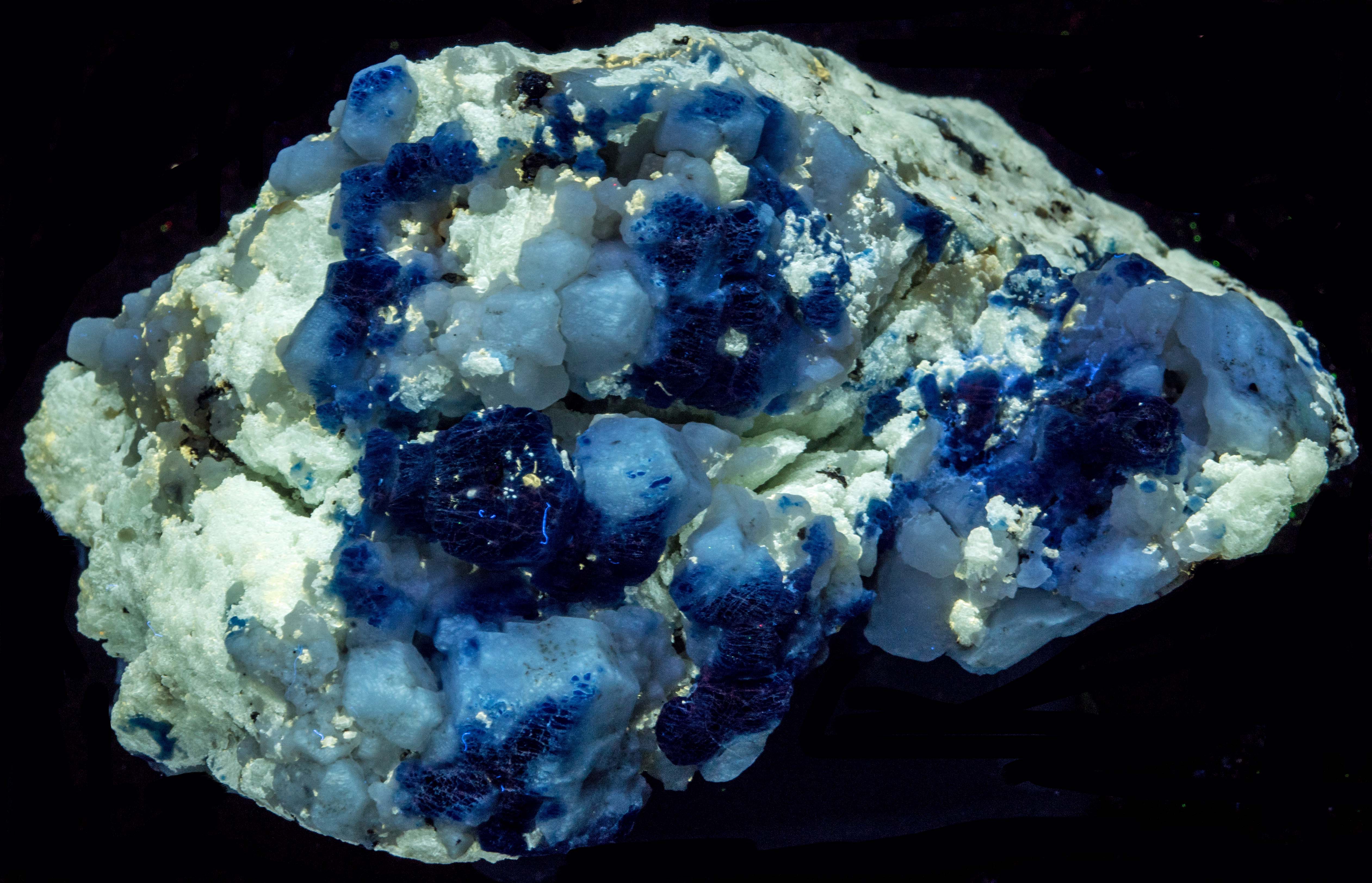 The ideal chemical formula for hauyne is (Na3Ca(Si3Al3)O12(SO4)), but substitutions involving potassium, sulfide, chloride, and changes in sodium and calcium proportions can influence its properties. Hauyne’s longwave UV emission spectrum exhibits several peaks resulting from di-sulfide ions replacing sulfate within its structure. Notably, lazurite—the blue mineral found in lapis lazuli—is a sulfide-rich and non-fluorescent form of hauyne. The blue mineral in this specimen is not lazurite: it is not opaque, its hue is paler than lazurite, and it does not produce a blue streak on a streak plate.