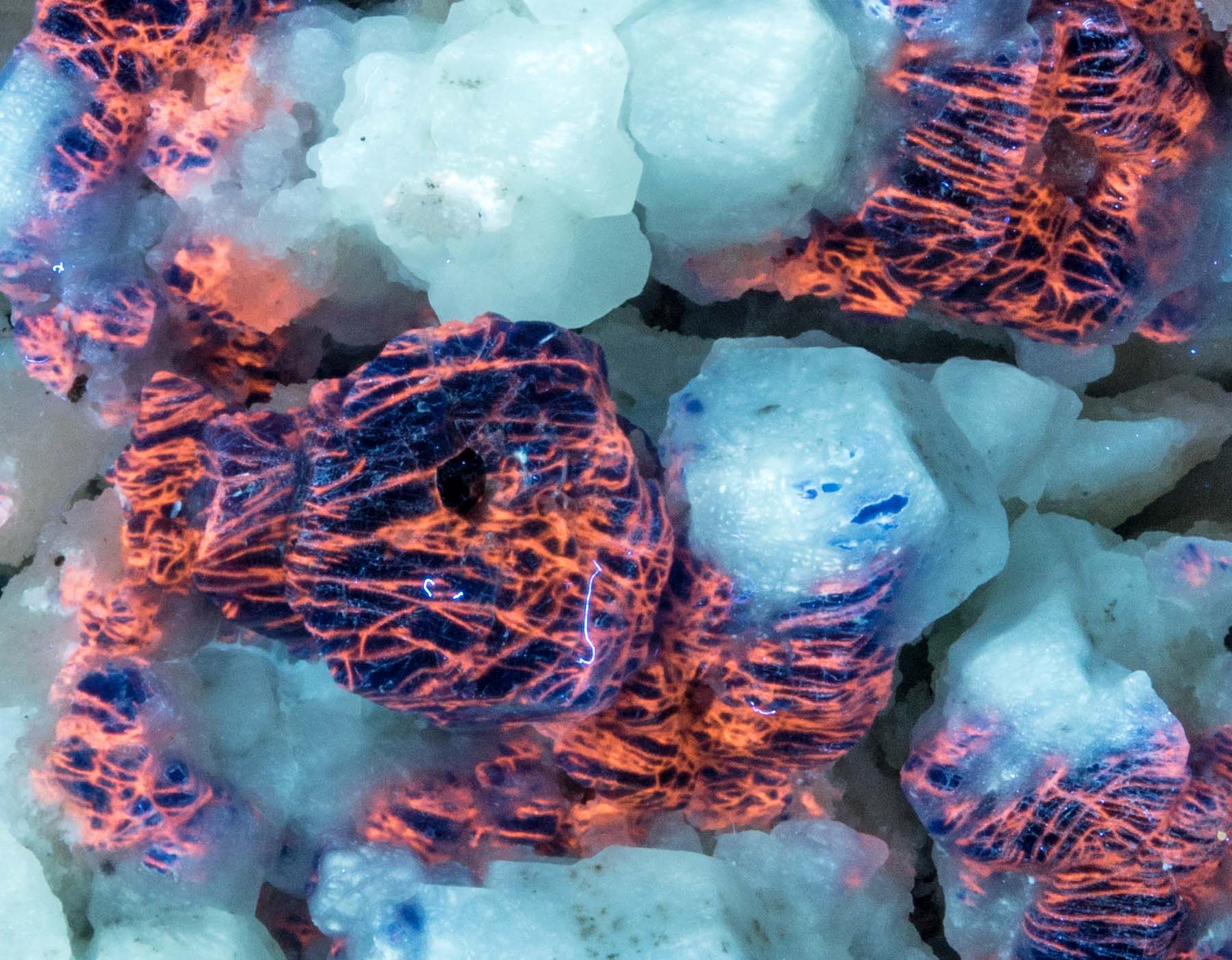The fifth image is a composite showing the specimen under combined UV wavelengths (longwave, midwave, and shortwave). The sixth image utilizes false-color infrared to illustrate the full-wave fluorescence. The seventh picture shows the specimen under normal white light. The final two images are close-ups of the fluorescent orange veinlets in the blue hauyne crystals captured under longwave and white light.