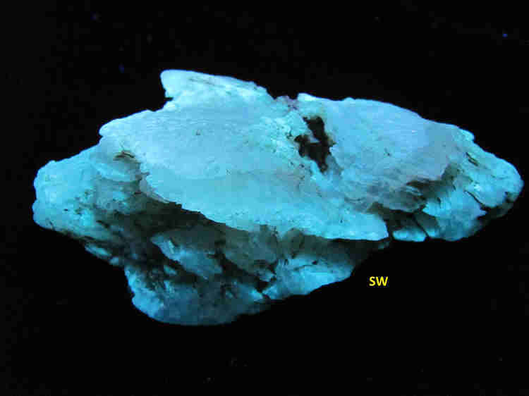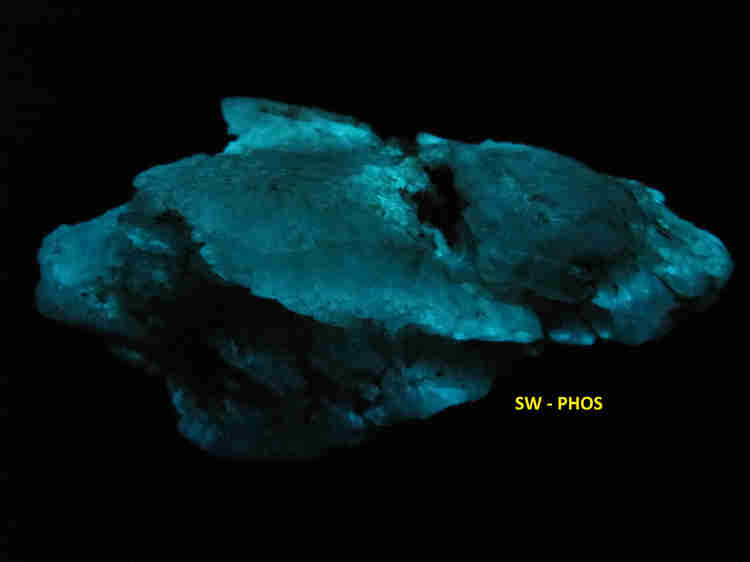This selenite is not especially bright, but the eerie bluish-greenish-white glow is, to my eye, a thing of beauty and fascination nonetheless. The observed fluorescence is a bit stronger under SW than under LW UV, and I never get tired of watching the slow decay of its SW phosphorescence, as though the stone\'s essence, once brought to life by the SW UV beam, stubbornly refuses to die when the light is extinguished. Shown here are the SW UV fluorescence and the daylight appearance of the specimen. I also included my feeble, largely unsuccessful attempt to capture its beguiling phosphorescence.