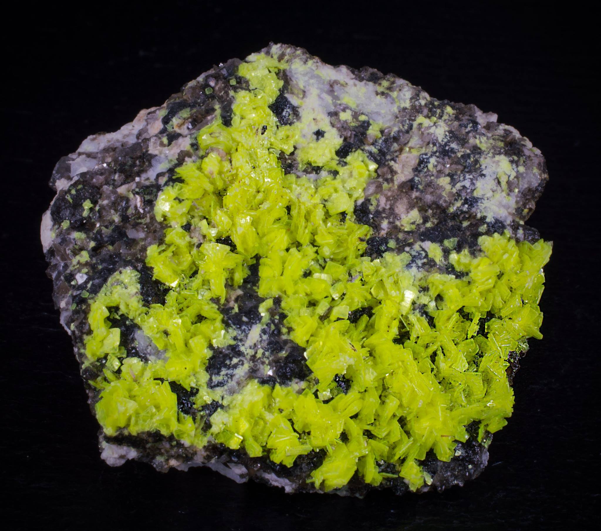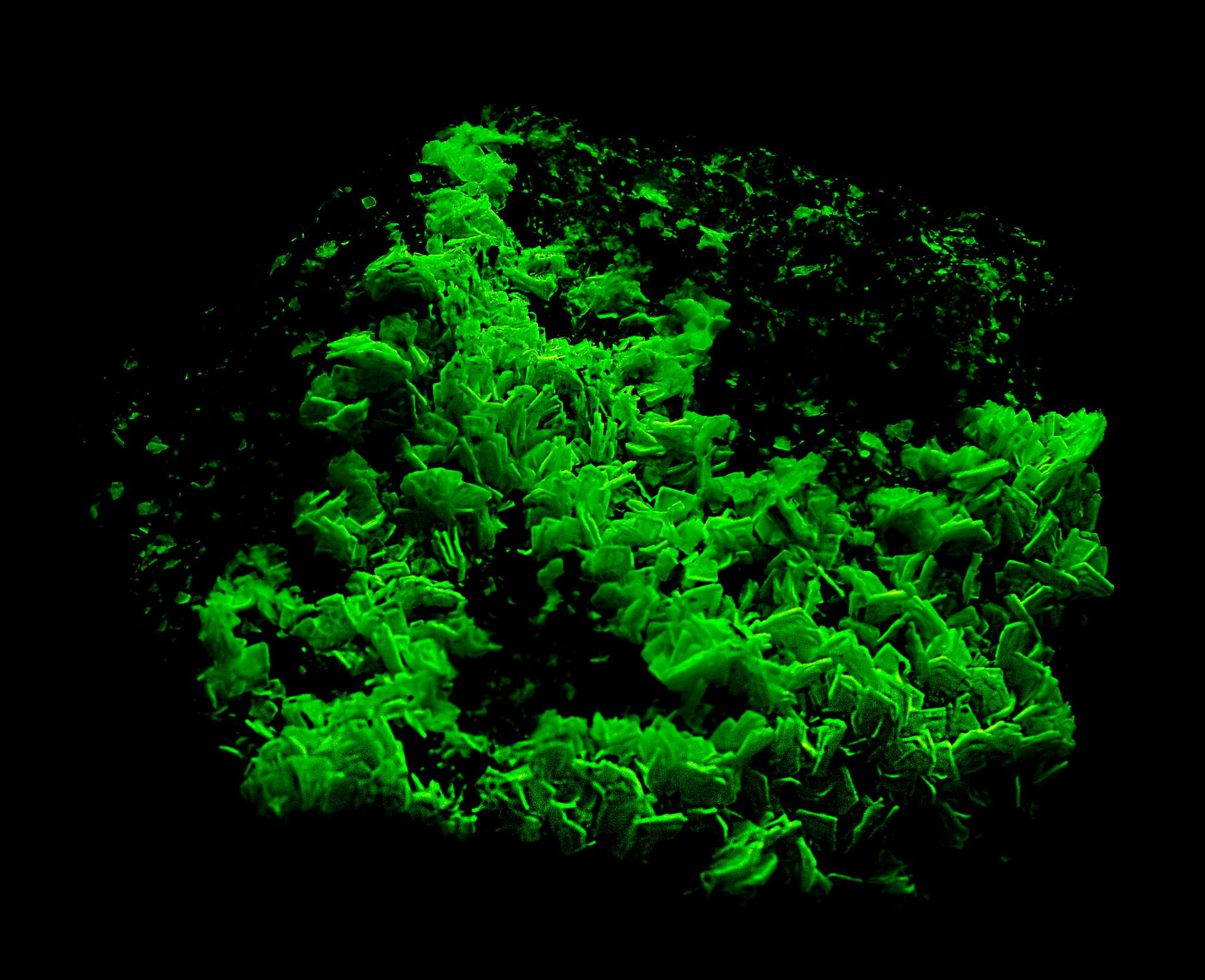 Photo in daylight and UV-LW-Strong yellow-green (LW & SW UV). A secondary mineral resulting from the oxidation of primary uranium minerals in hydrothermal veins, granite pegmatites. Contributed by Marco Frigerio.