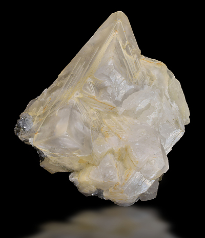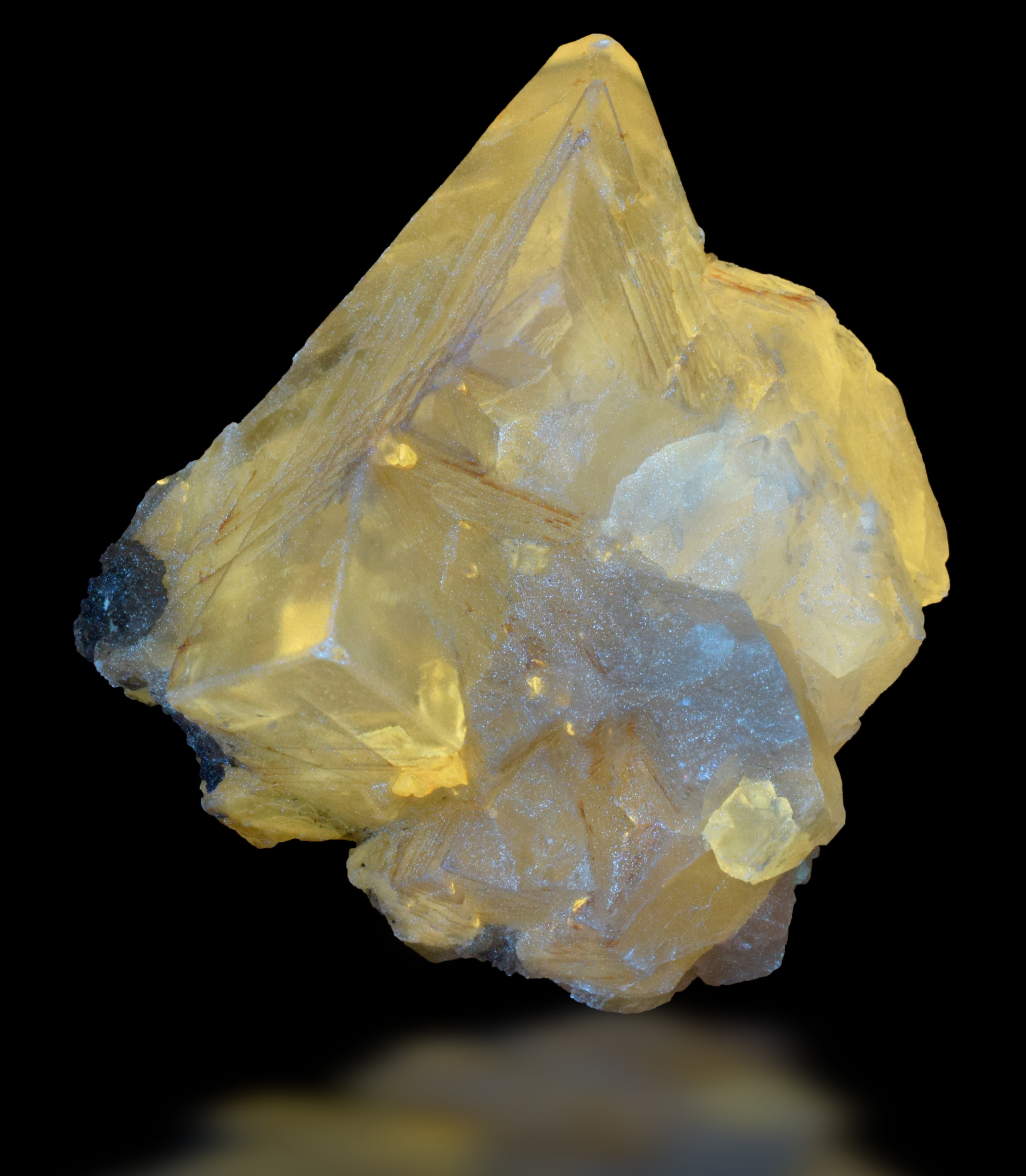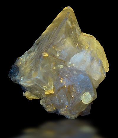 During 2004-2005, a limited find of morphologically complex, multiply twinned, light yellow, gemmy calcite was made in the cavities of a Basalt Quarry in Ambariomiambana, Ambohimalaza Commune, in the Sambava area of Sava, Madagascar. Of interest to fluorescent mineral collectors, these Sambava calcites often show a soft yellow to cream-colored fluorescent response activated by organic inclusions. This specimen provides a good example of fluorescent Sambava calcite. Note the complex shape of the calcite crystal.