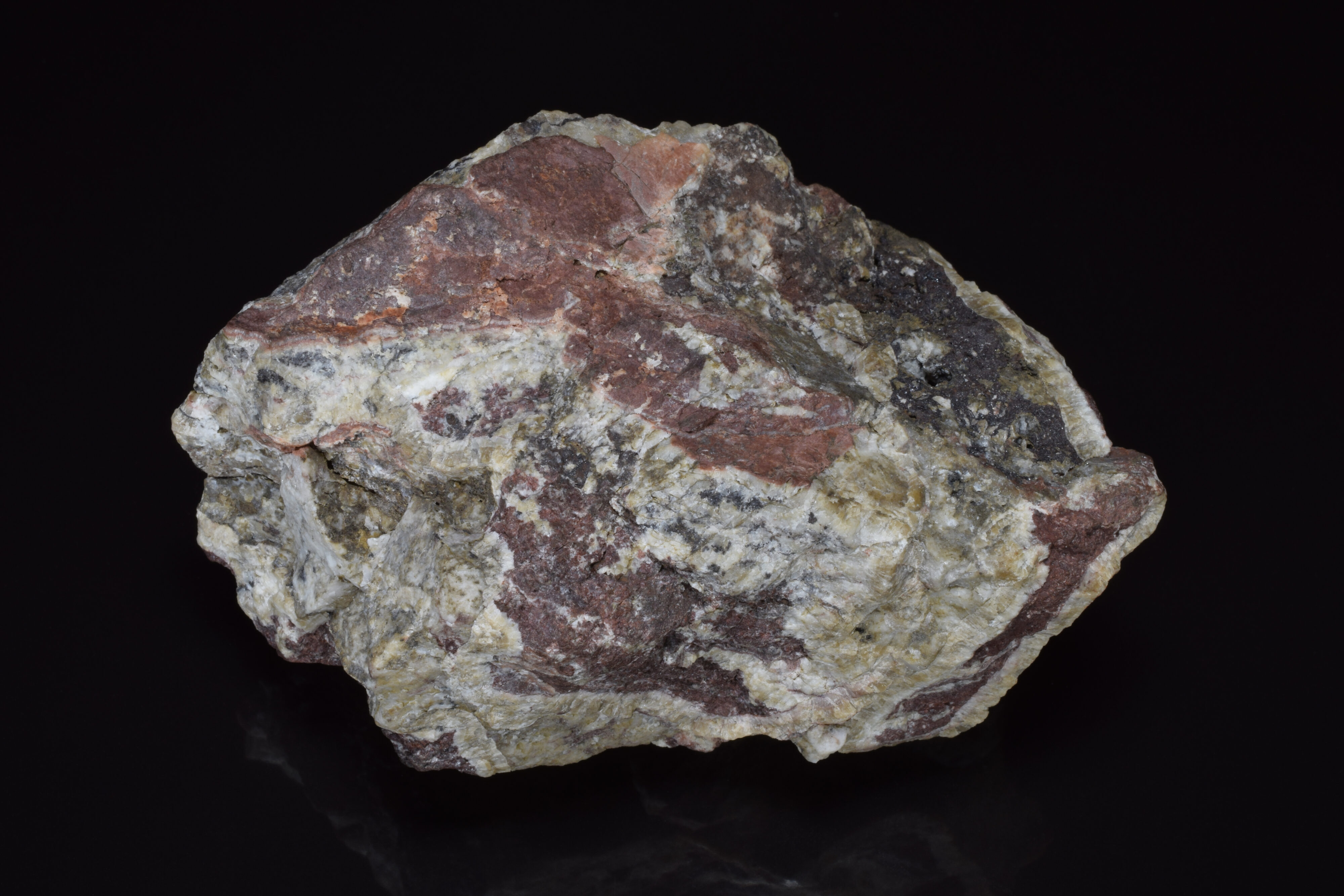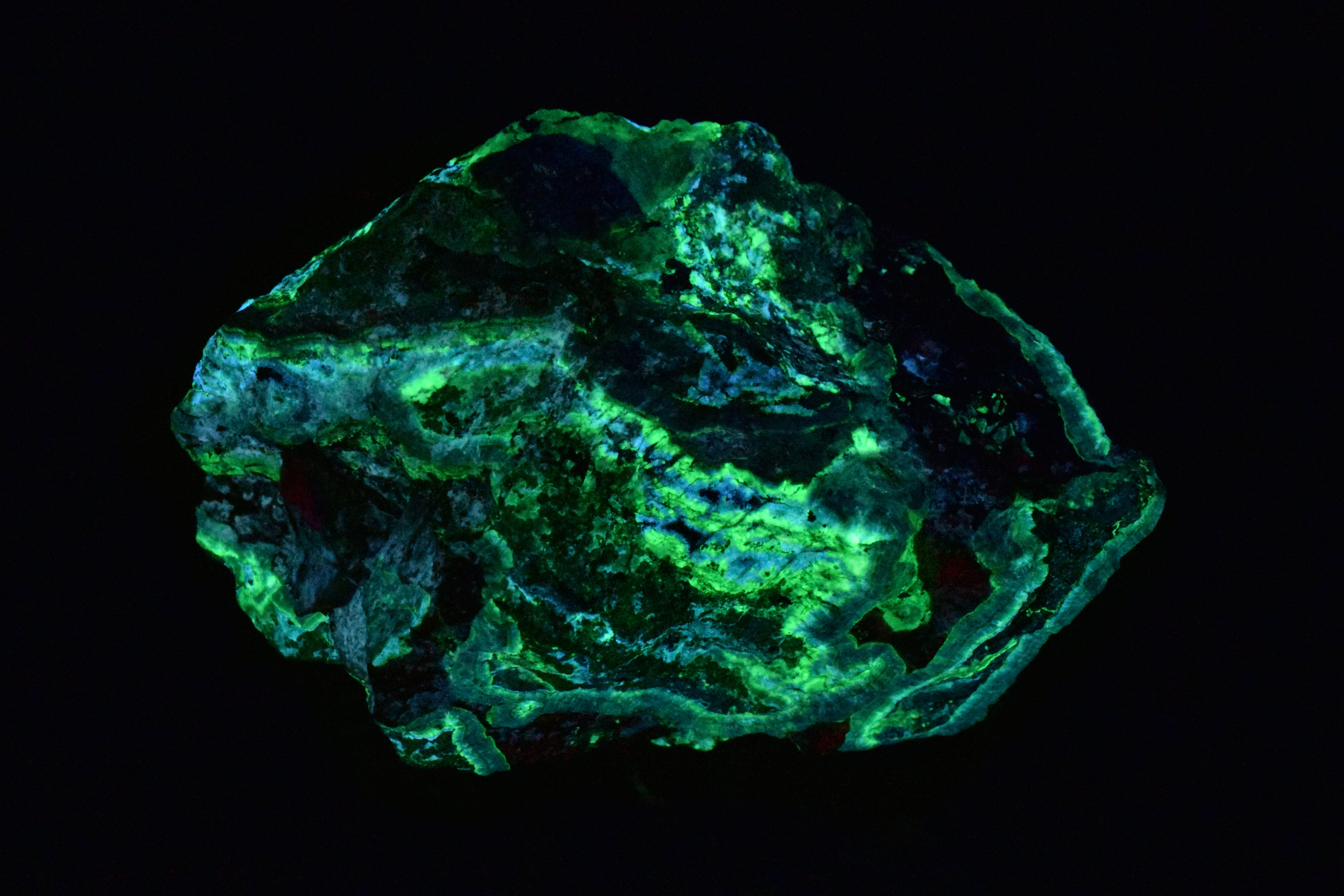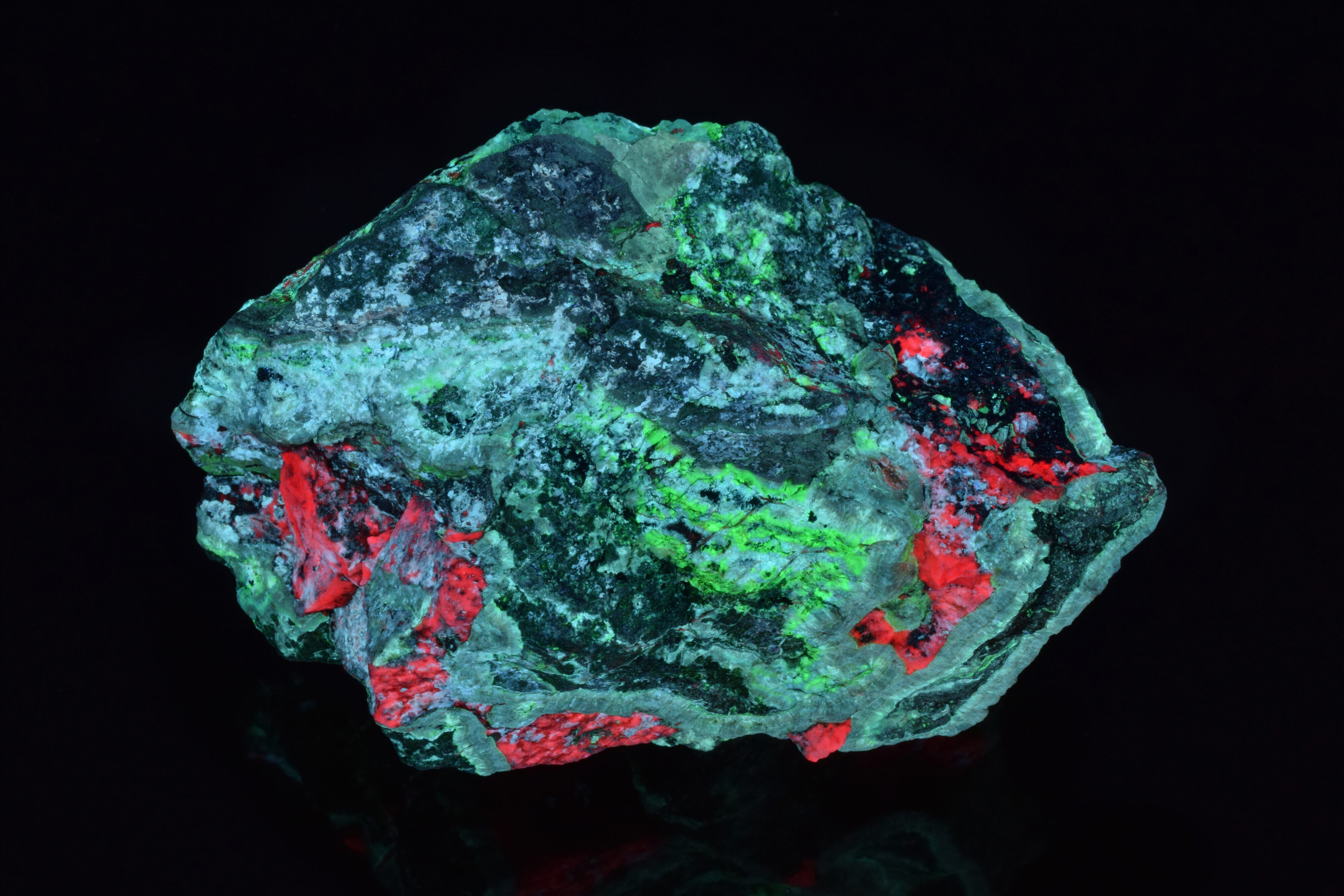 This beautiful fluorescent rock from the Aroona Zinc Mine, Leigh Creek, Flinders Ranges, South Australia features willemite and dolomite. The Aroona Mine is located approximately 11 km to the NW of the better known Puttapa Zinc Mine, another notable location for fluorescent Australian minerals. Under short wave UV (254 nm), blue and green, fluorescent willemite and red dolomite dominate this specimen. The willemite shows bright and lasting blue and green phosphorescence/afterglow following exposure to short wave UV (254 nm).