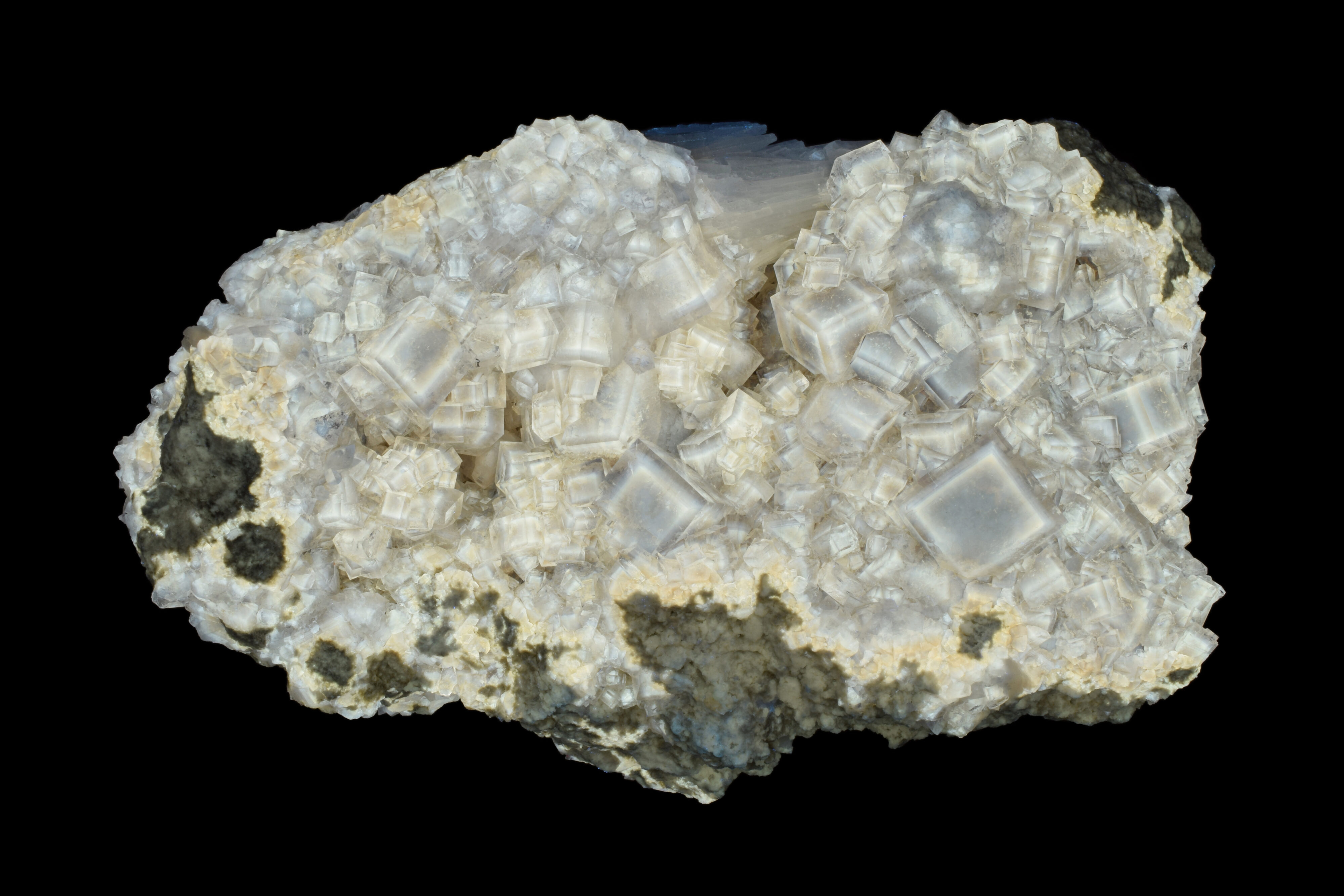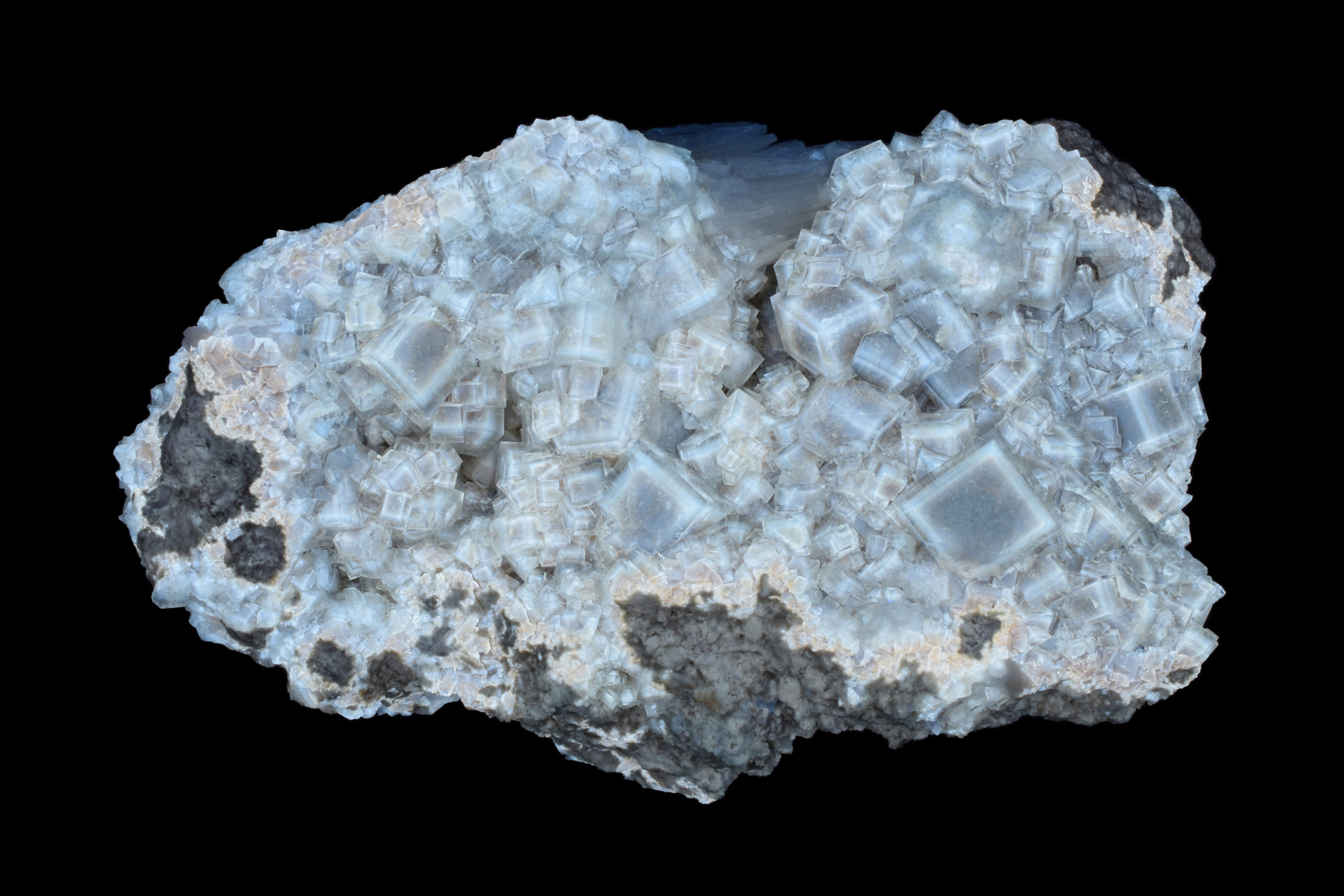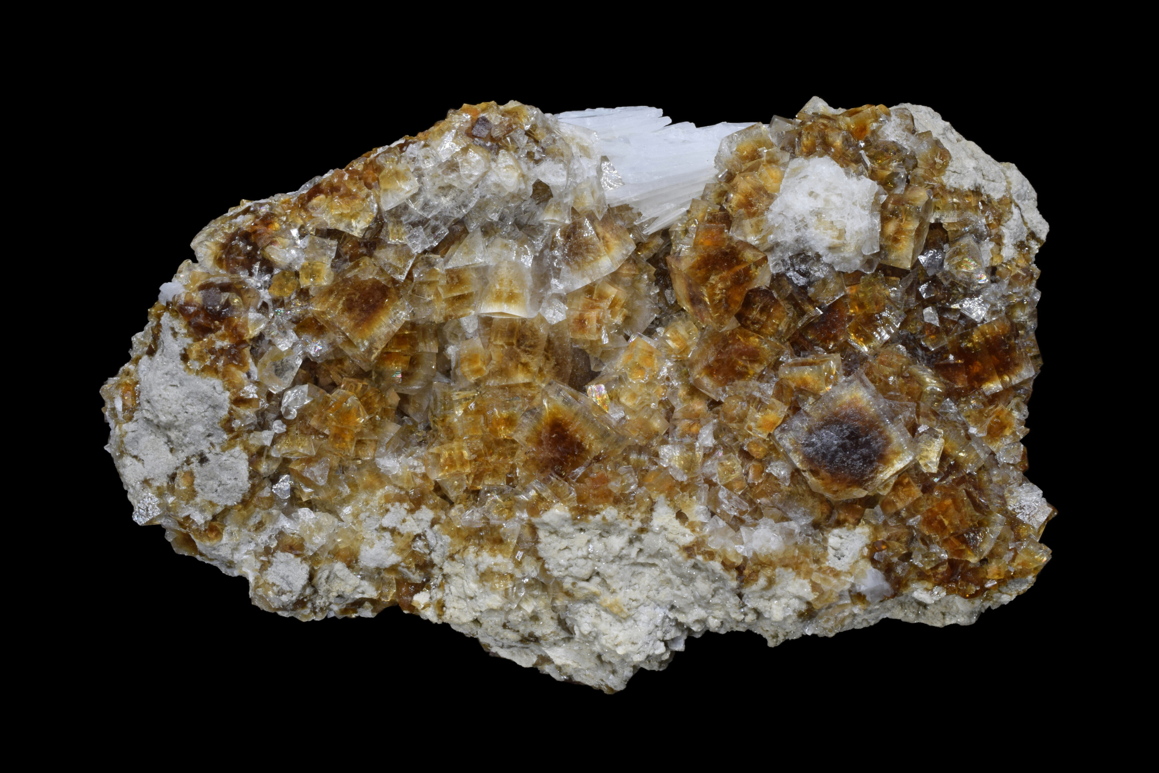 This large specimen from the Graymont Quarry in Genoa, Ohio features colorless, transparent fluorite cubes with root beer brown, zoned centers on a light grey limestone matrix. There are also some white bladed celestine crystals present. As shown in the photographs below, the fluorite is brightly fluorescent and phosphorescent under UV. The fluorescent response is activated by organic inclusions in the fluorite crystals.