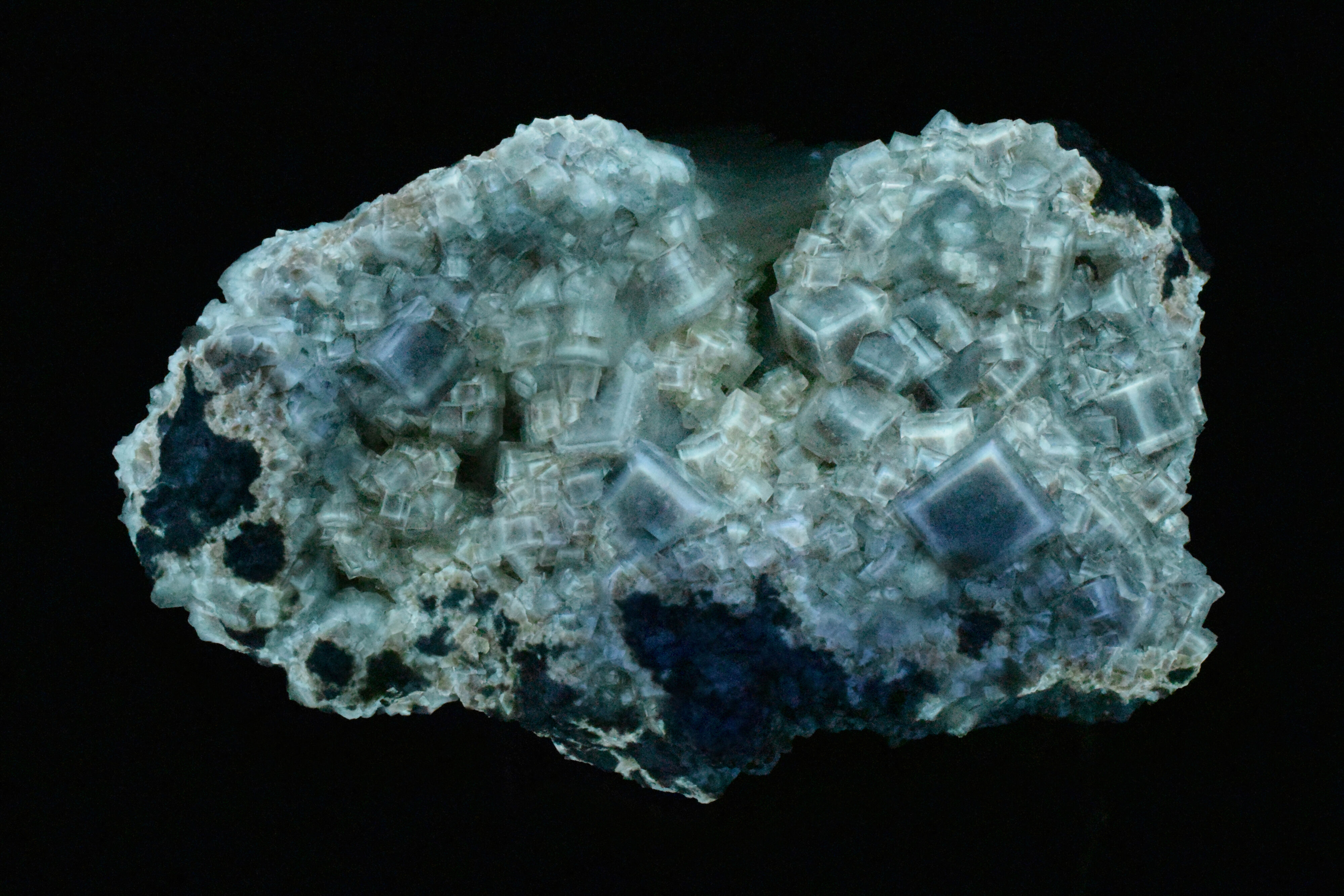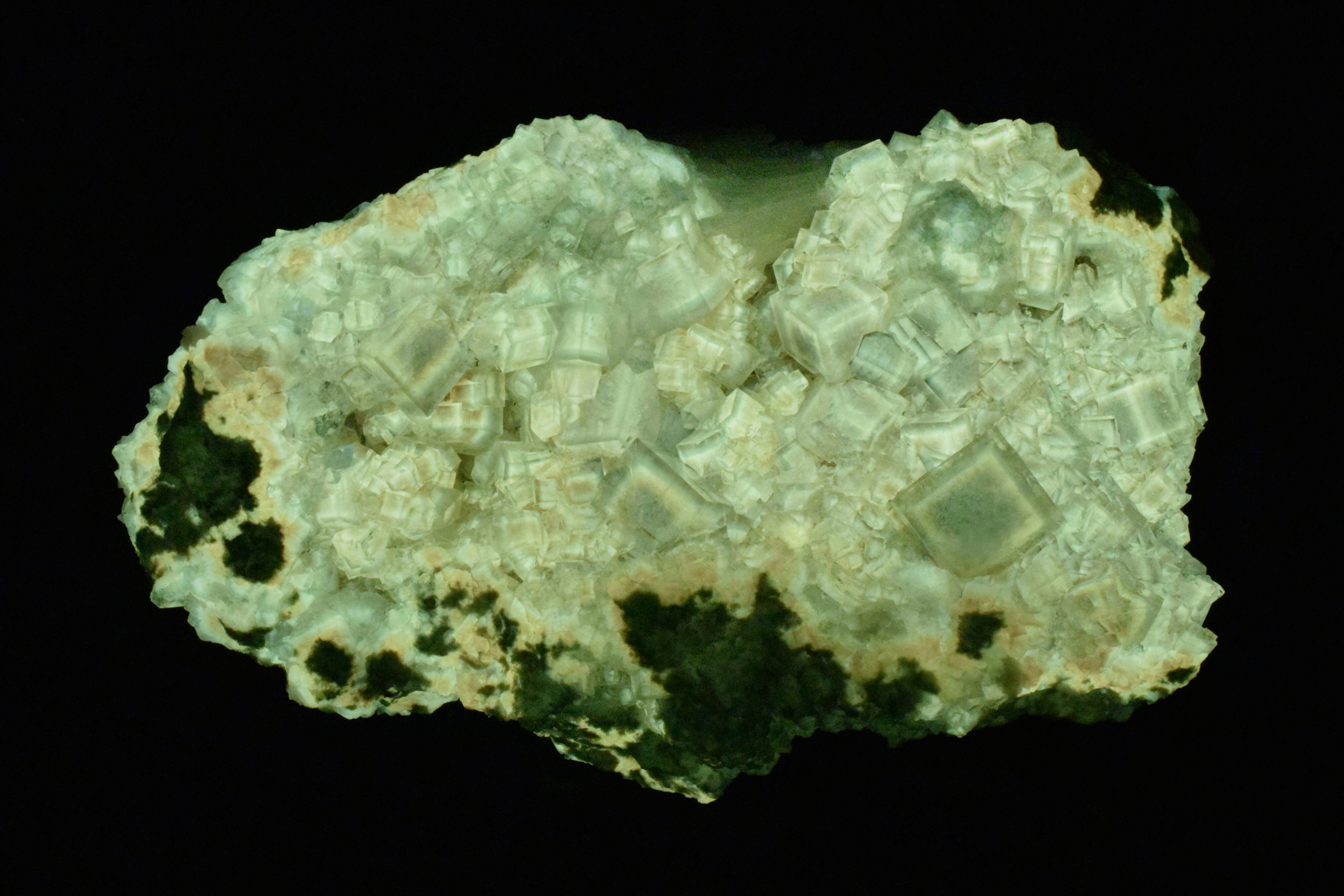 Bright white, zoned fluorescence is seen in the fluorite cubes when viewed under shortwave UV (254 nm). Note that the limestone matrix is also moderately fluorescent. Following exposure to shortwave UV (254 nm), pale blue/green phosphorescence is seen.