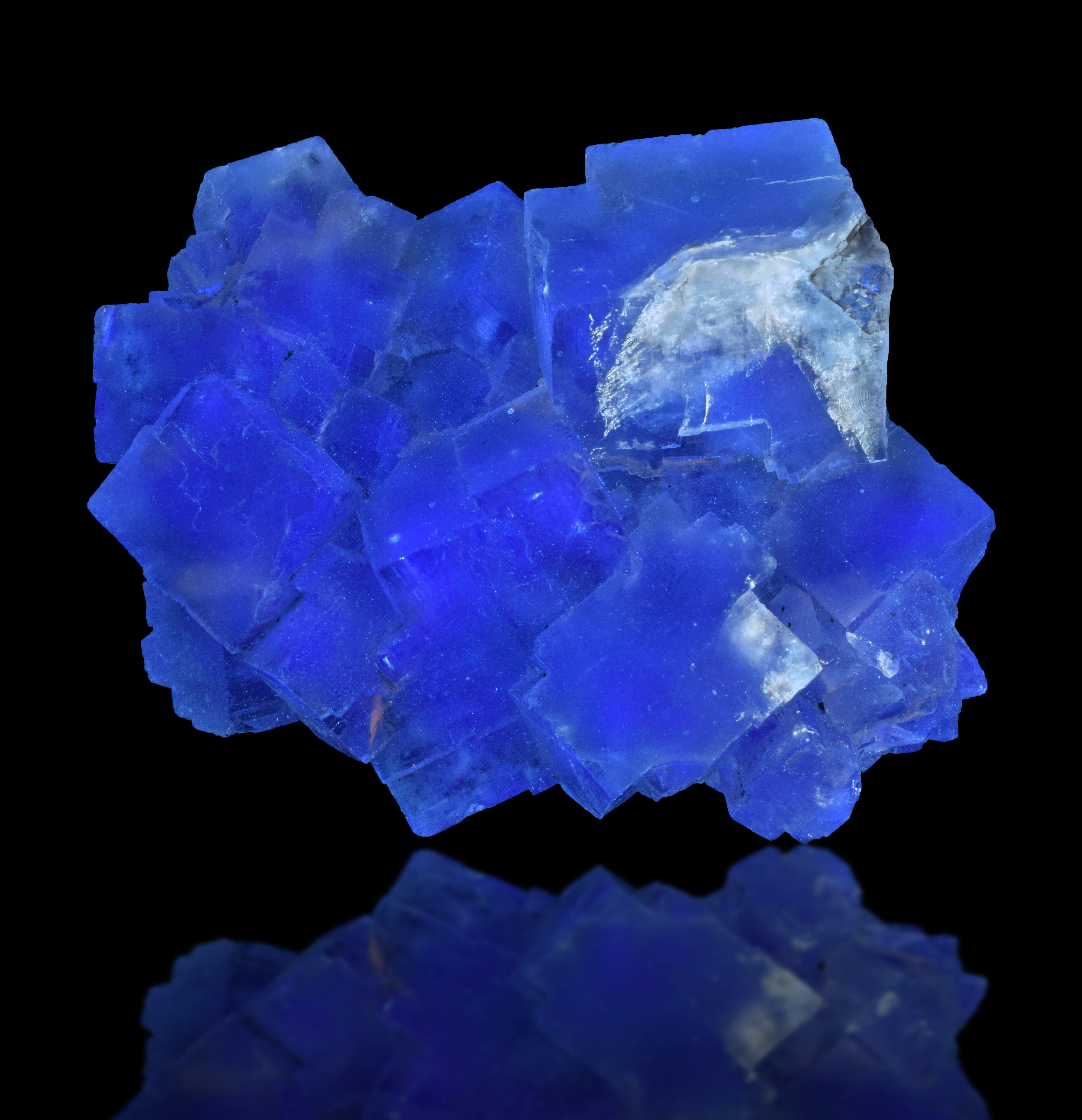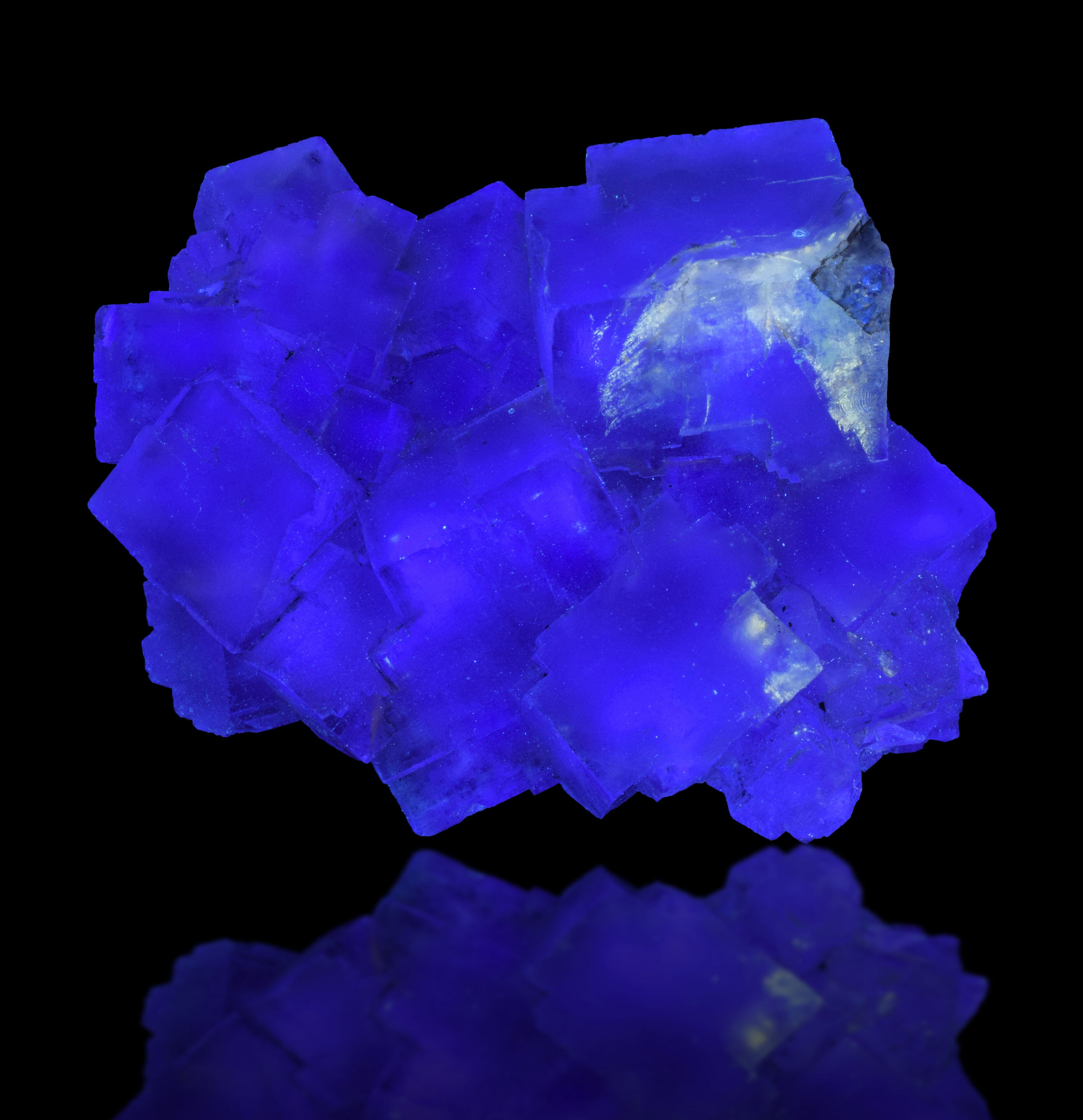 The Cave-In-Rock area of Hardin County in southern Illinois is known for producing some of the most spectacular display quality fluorite specimens on the planet. However, the fluorescent properties of this material can be hit or miss. Some specimens show little to no fluorescence under UV, while others fluoresce typical blue due to activation by trace amounts of rare earth elements (REEs) in the fluorite crystal structure. In some cases, myriad hydrocarbon/petroleum inclusions will show a bright white response under UV, illuminating the fluorite from within. The specimen featured here has it all. This cluster of sky-blue fluorite cubes is from the Minerva No. 1 Mine, and its beauty under visible light is spectacular. Under UV it fluoresces blue, brighter than average for Cave-In-Rock fluorite. In addition, some of the cubes contain brightly fluorescent hydrocarbon inclusions, visible as bright white wisps and blebs.