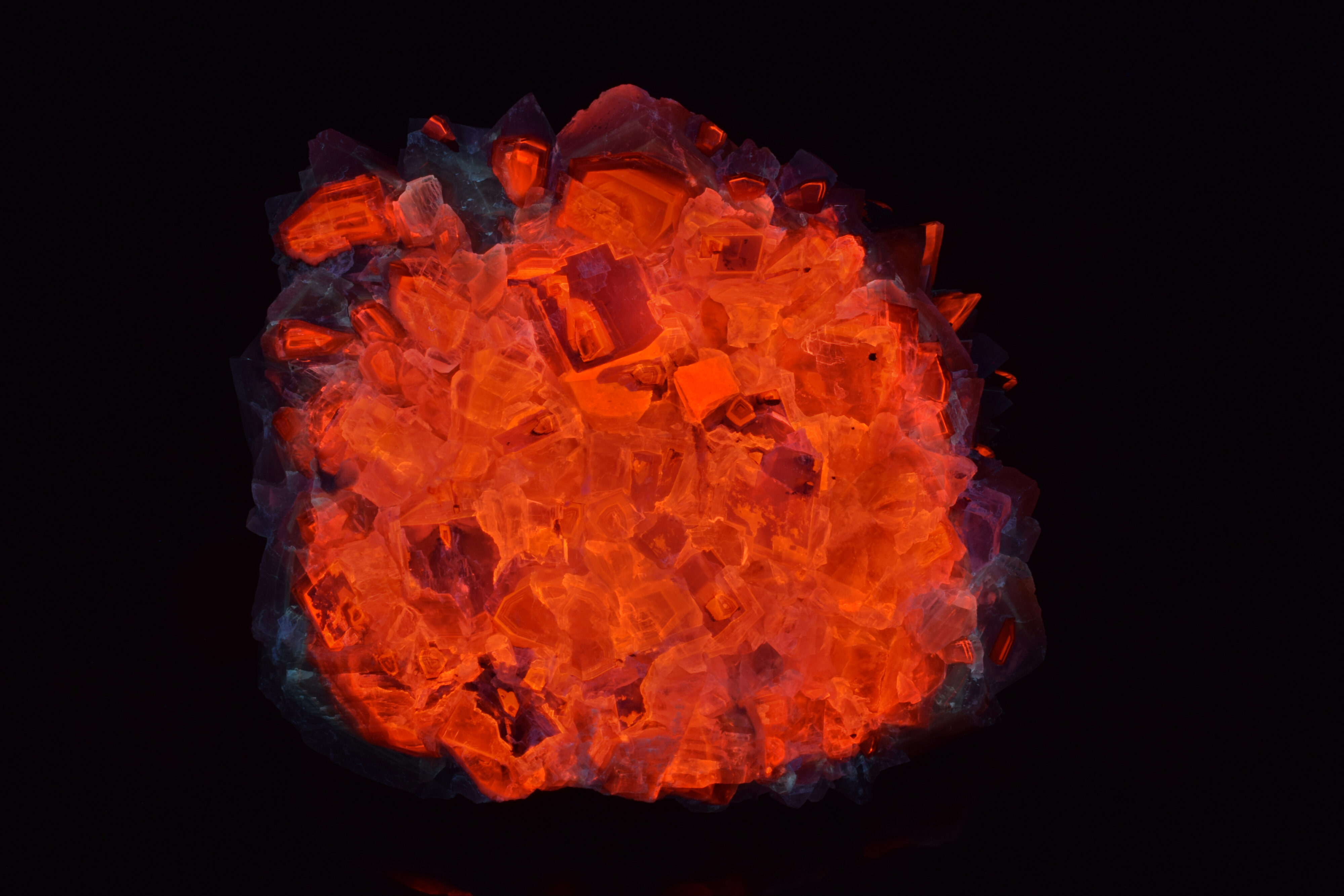 Mariposa calcite shows bright orange fluorescence under short wave UV (254 nm) on the underside of the base of the piece. Note the fluorescent zoning. This fluorescent response is typical for this material.