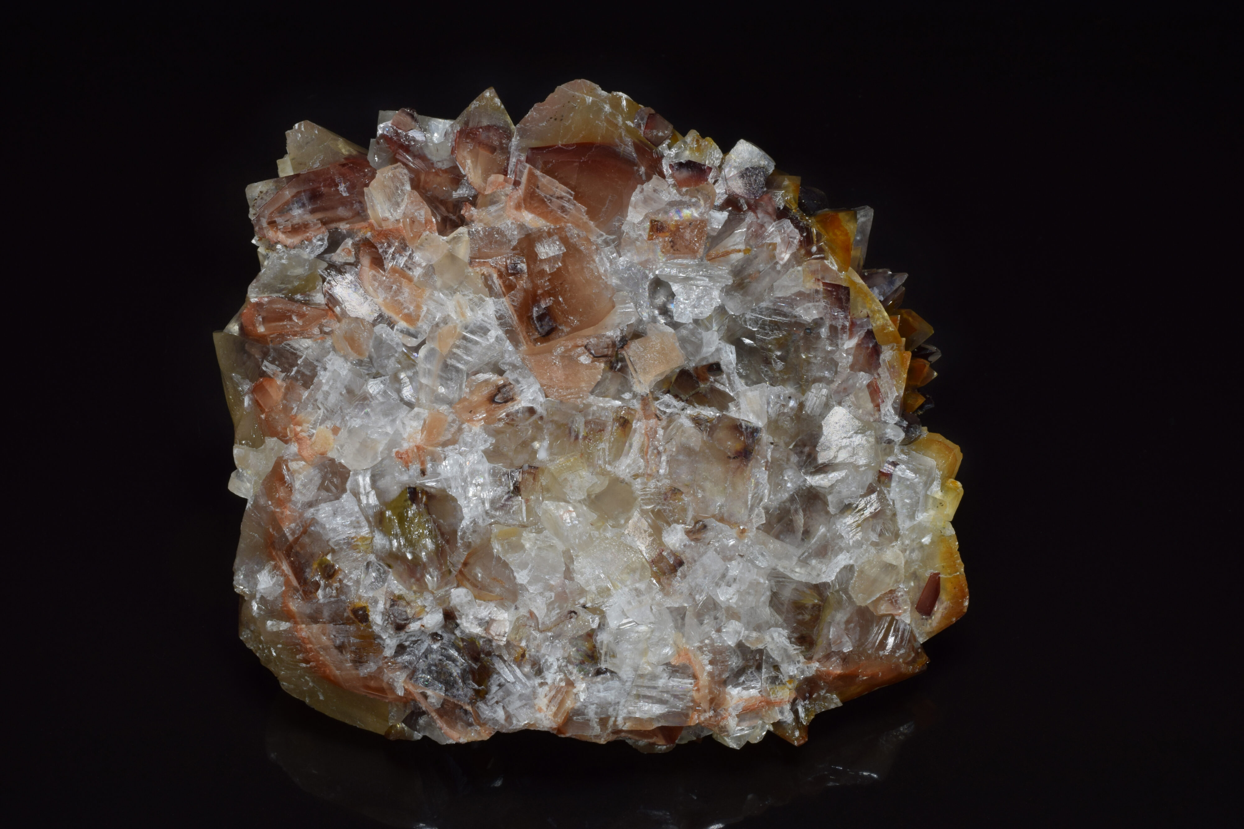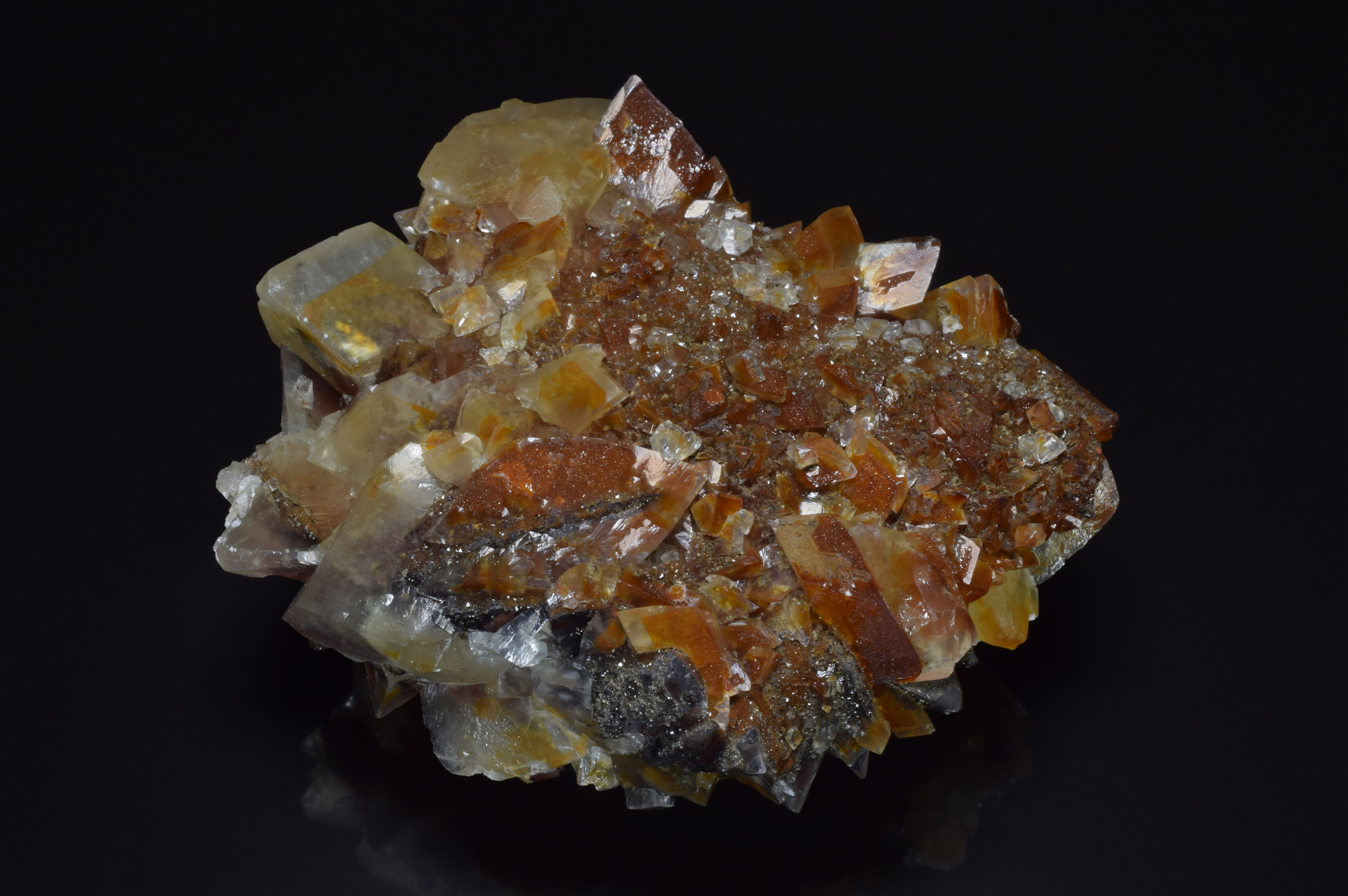 Top side of same specimen showing the 2-generation crystal growth that is characteristic of mariposa calcite. The initial growth phase results in the formation of classic scalenohedral calcite crystals which are typically coated with a thin layer of iron oxide, giving them a red/brown-colored appearance. During the second phase of growth, the initial scalenohedral phase is overgrown with yellow/brown rhombohedral calcite, resulting in caramel-colored dogtooth crystals containing dark brown internal phantoms. Of interest to the fluorescent mineral collector, the first phase of scalenohedral calcite growth often shows a bright orange, fluorescent response under shortwave UV.